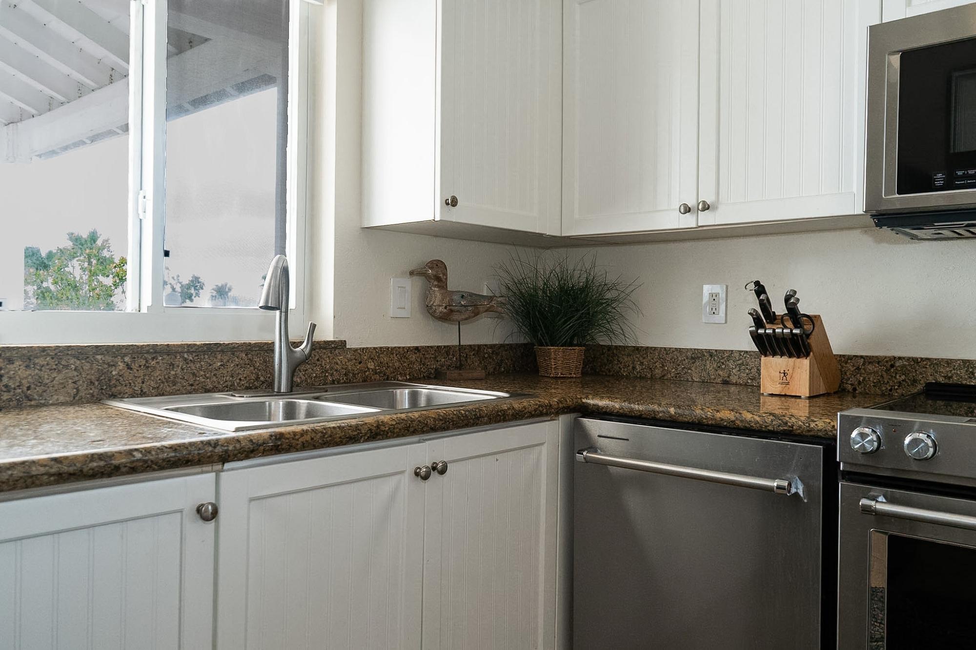 The residence is offered fully furnished with sleek, modern décor and a well-equipped kitchen featuring granite countertops, updated KitchenAid stainless-steel appliances, an electric stove, refrigerator, microwave, and a washer/dryer combination.