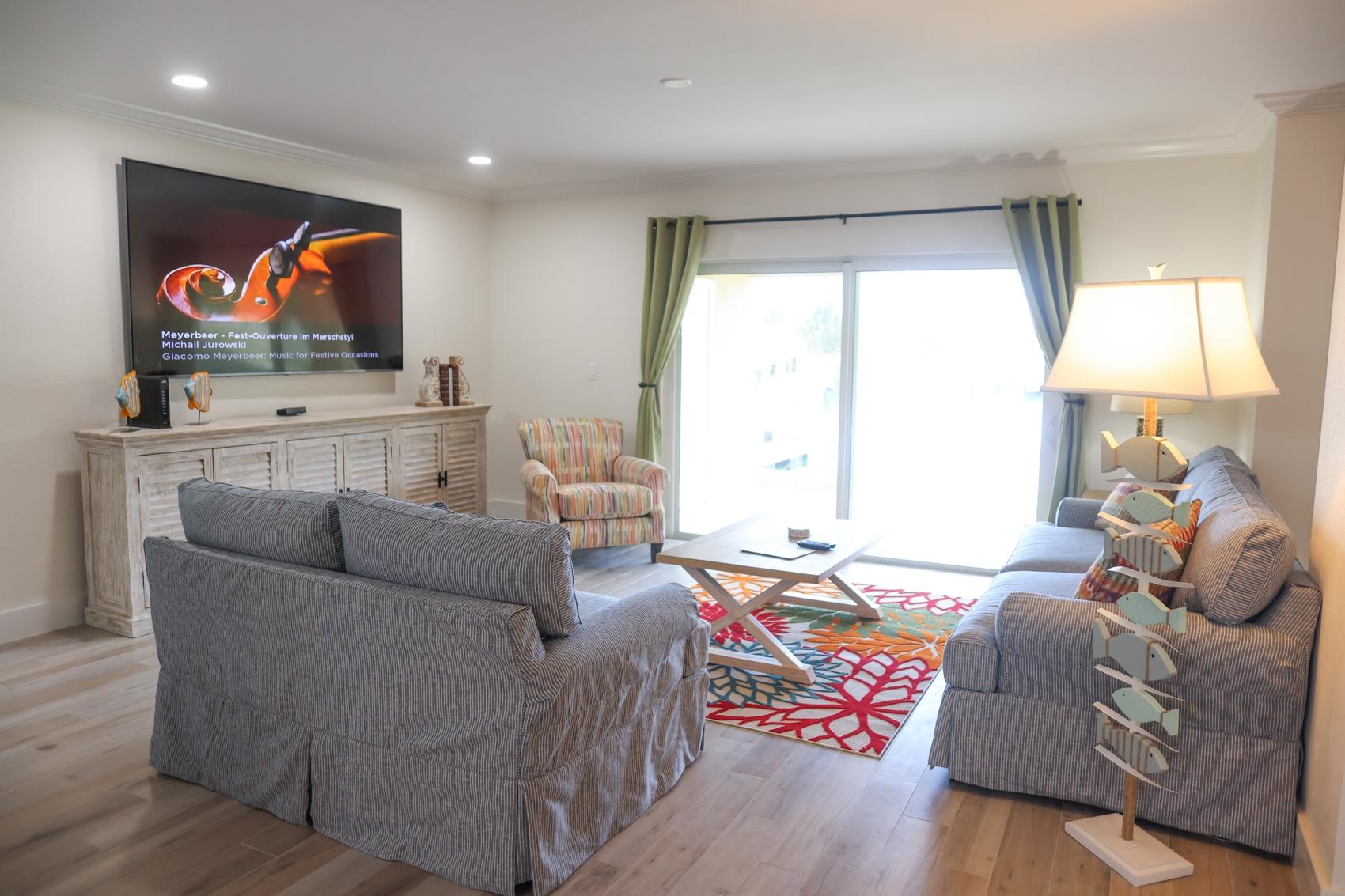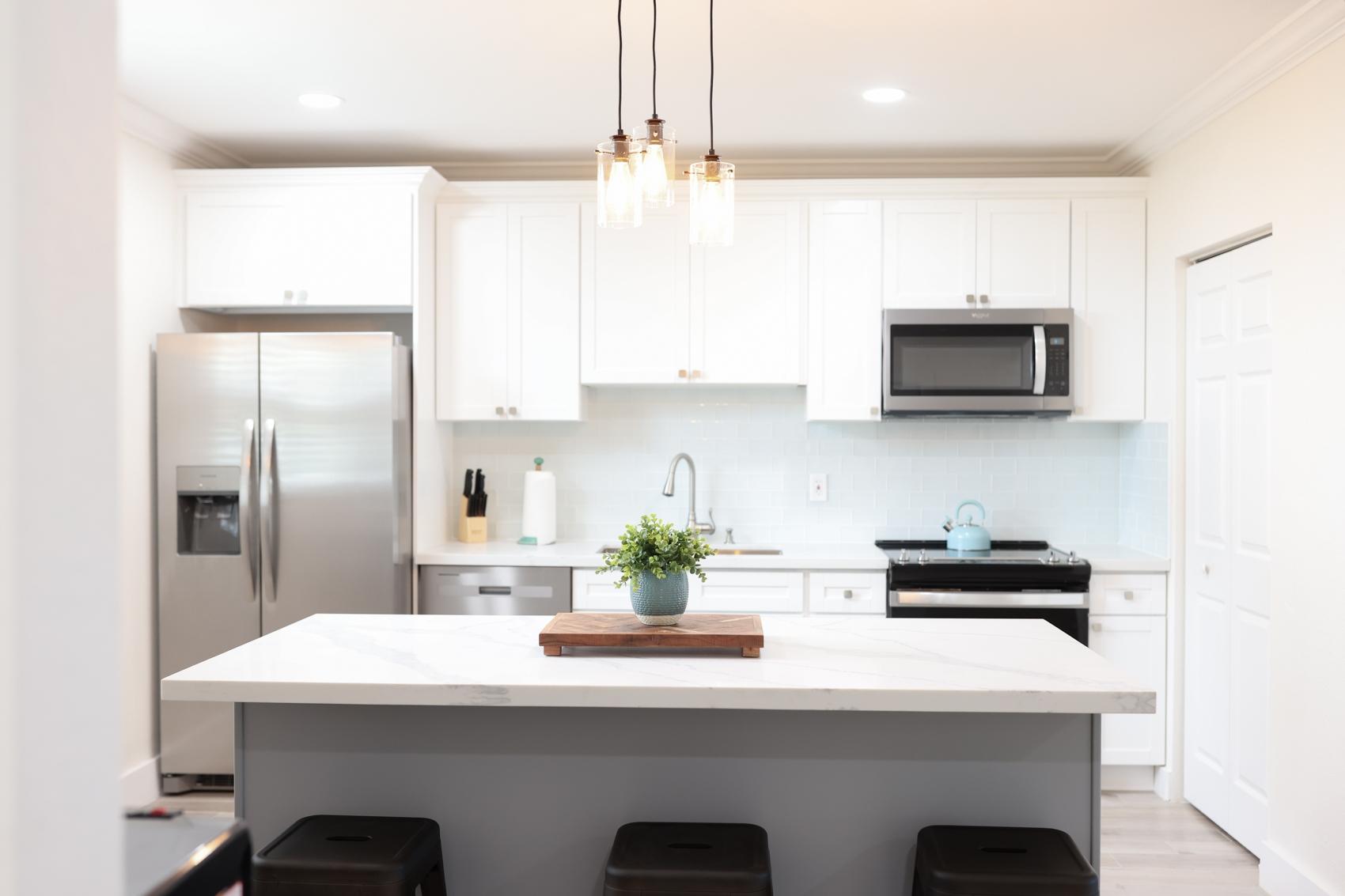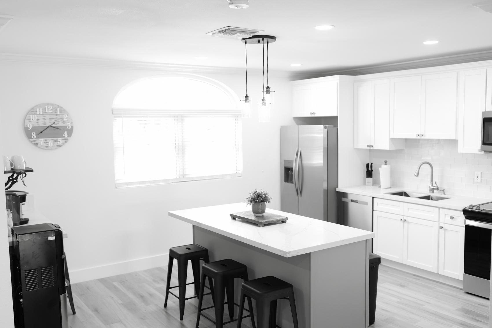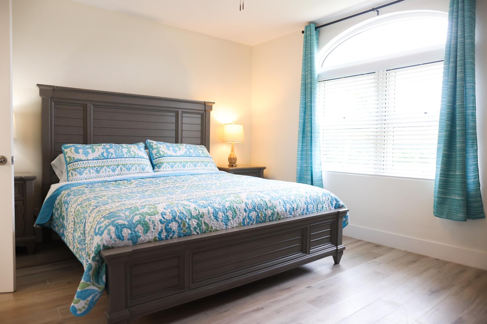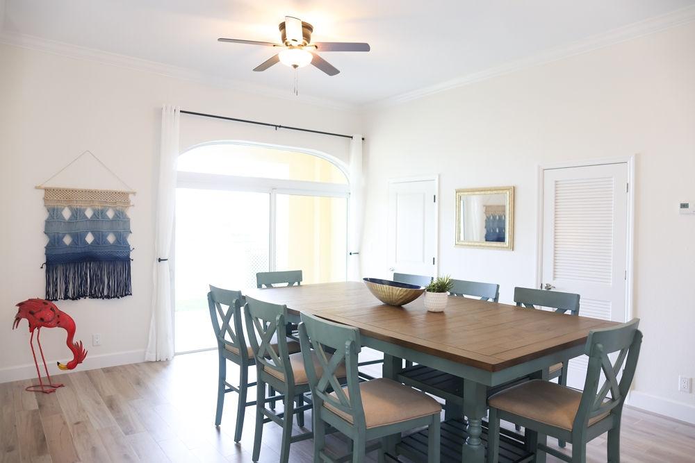 The Andros Villa is 5 bedroom 5.5 bath villa overlooking the marina at Villa Marina Cove. Centrally located on Midshipman Road it is conveniently located between Taino Beach and Port Lucaya. The 5 bedrooms are elegantly furnished with king beds and premium linens with ensuite luxury bathrooms. The living room features an 85-inch TV and the bedrooms are equipped with 55-inch smart TV’s. 3 bedrooms are located on the ground level with the gourmet kitchen, large dining area and living area with patio doors leading to an outdoor patio and the marina. There is also a half bath and full-size washer and dryer located on the ground level. Upstairs features a large master suite equipped with ensuite bathroom with glass shower stall, double vanity, and soaker tub. The 2nd upstairs bedroom has a king size bed, desk and ensuite bath. Covered parking and an outdoor pool are included and the entire property is secured and gated.