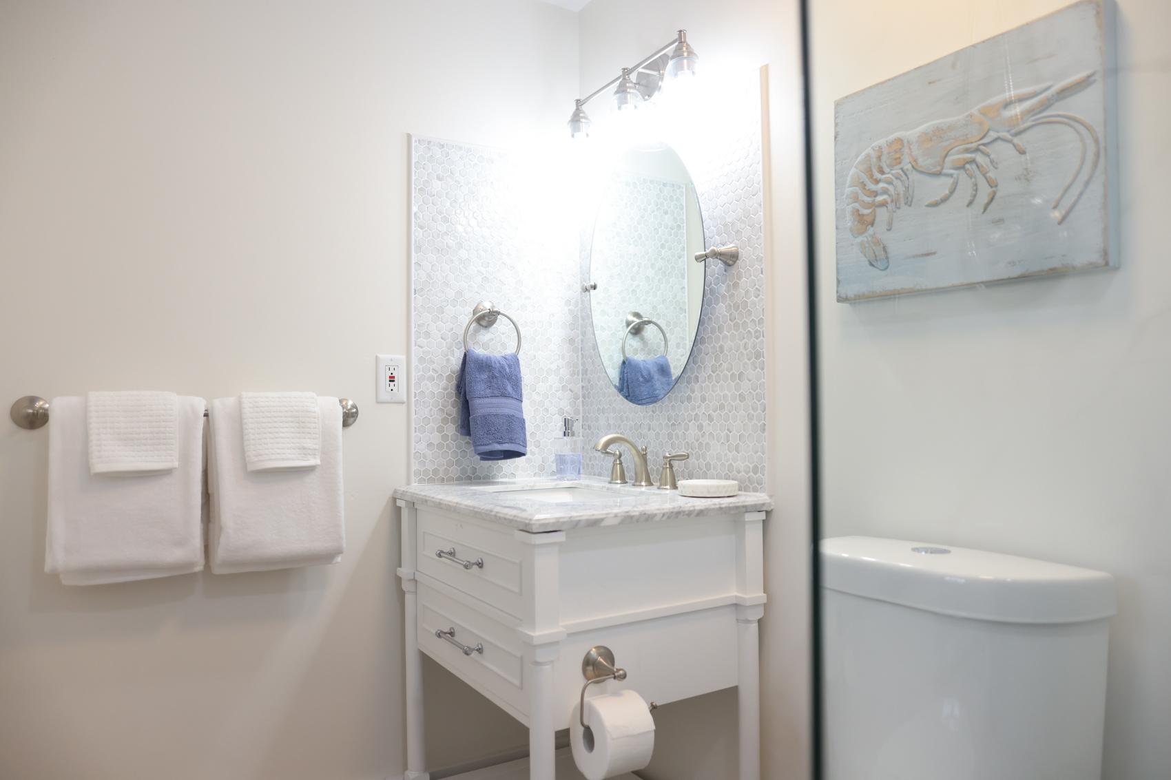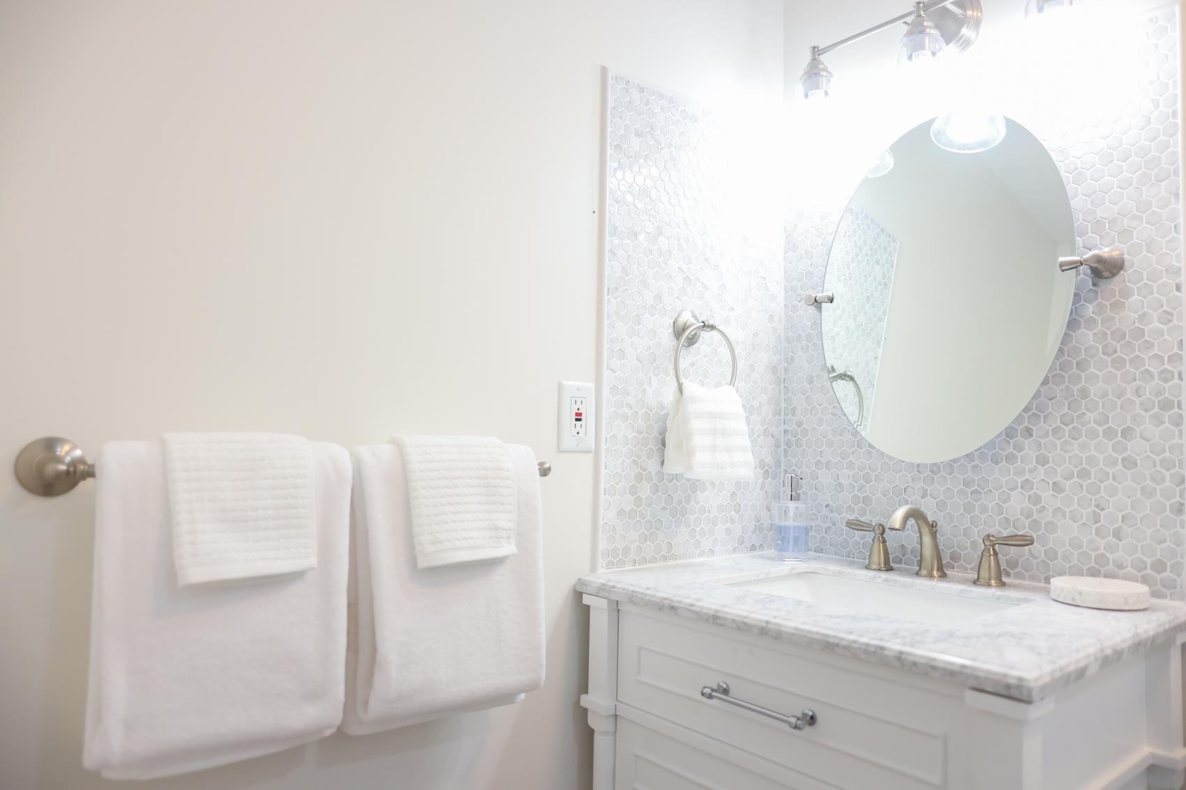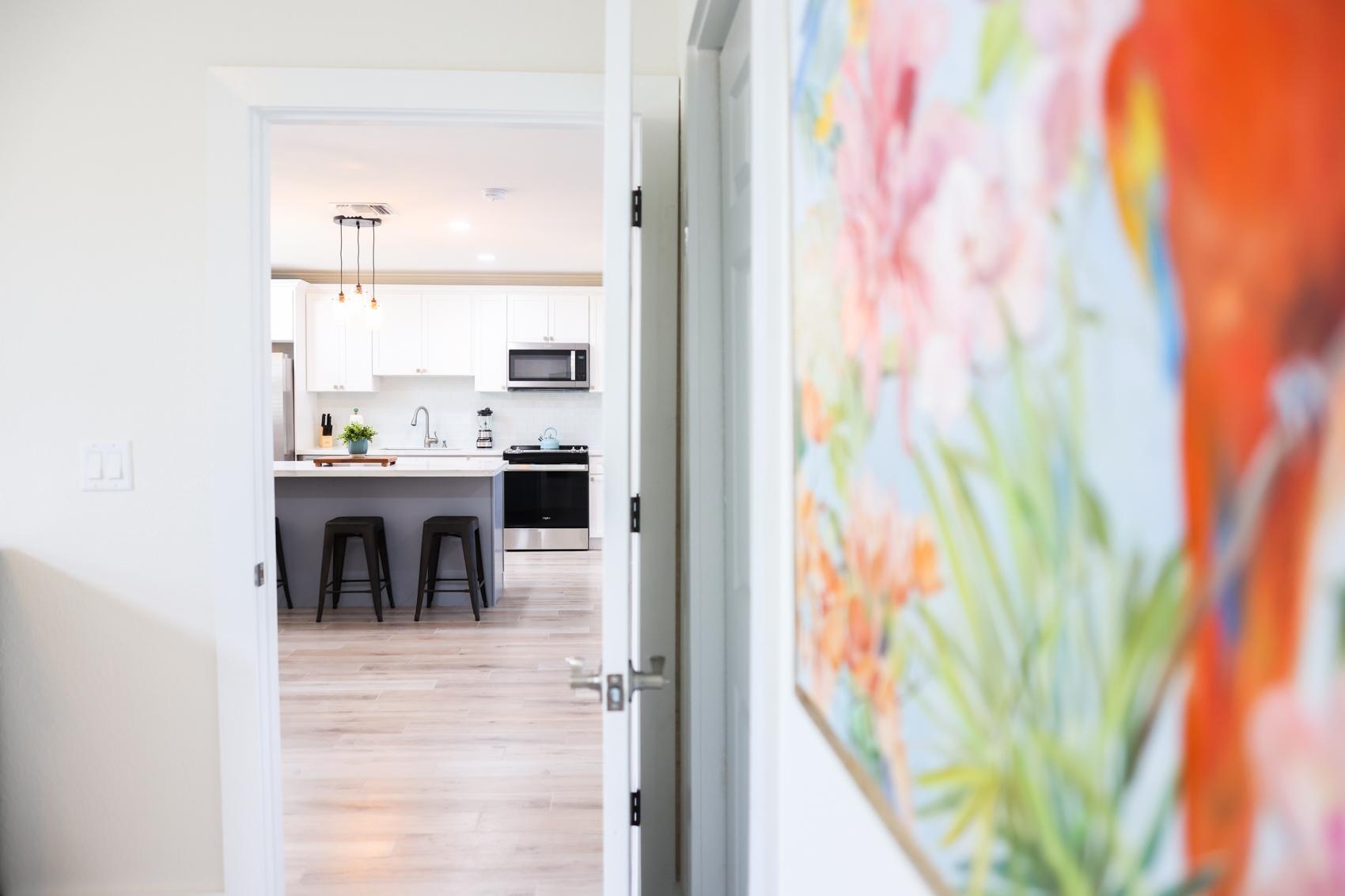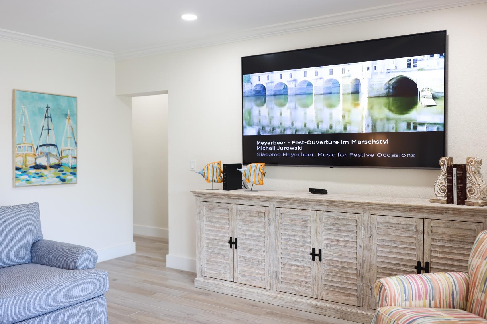 The Andros Villa is 5 bedroom 5.5 bath villa overlooking the marina at Villa Marina Cove. Centrally located on Midshipman Road it is conveniently located between Taino Beach and Port Lucaya. The 5 bedrooms are elegantly furnished with king beds and premium linens with ensuite luxury bathrooms. The living room features an 85-inch TV and the bedrooms are equipped with 55-inch smart TV’s. 3 bedrooms are located on the ground level with the gourmet kitchen, large dining area and living area with patio doors leading to an outdoor patio and the marina. There is also a half bath and full-size washer and dryer located on the ground level. Upstairs features a large master suite equipped with ensuite bathroom with glass shower stall, double vanity, and soaker tub. The 2nd upstairs bedroom has a king size bed, desk and ensuite bath. Covered parking and an outdoor pool are included and the entire property is secured and gated.