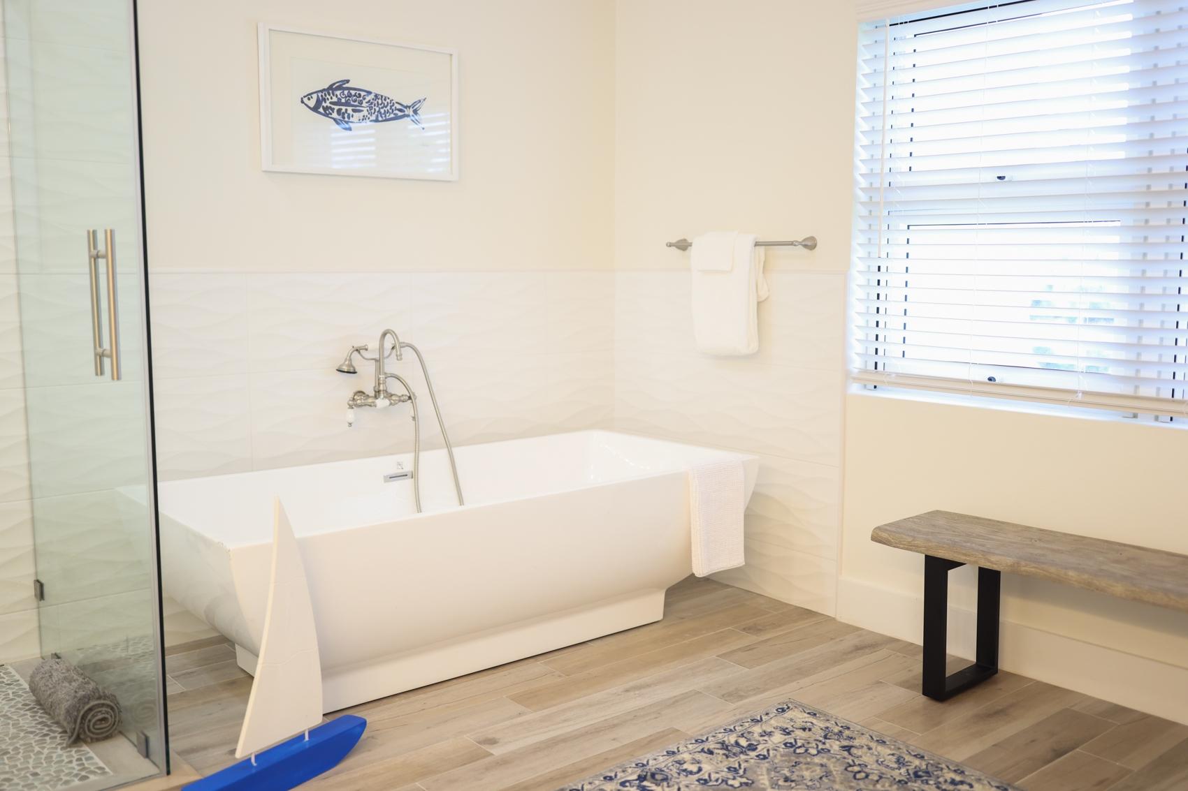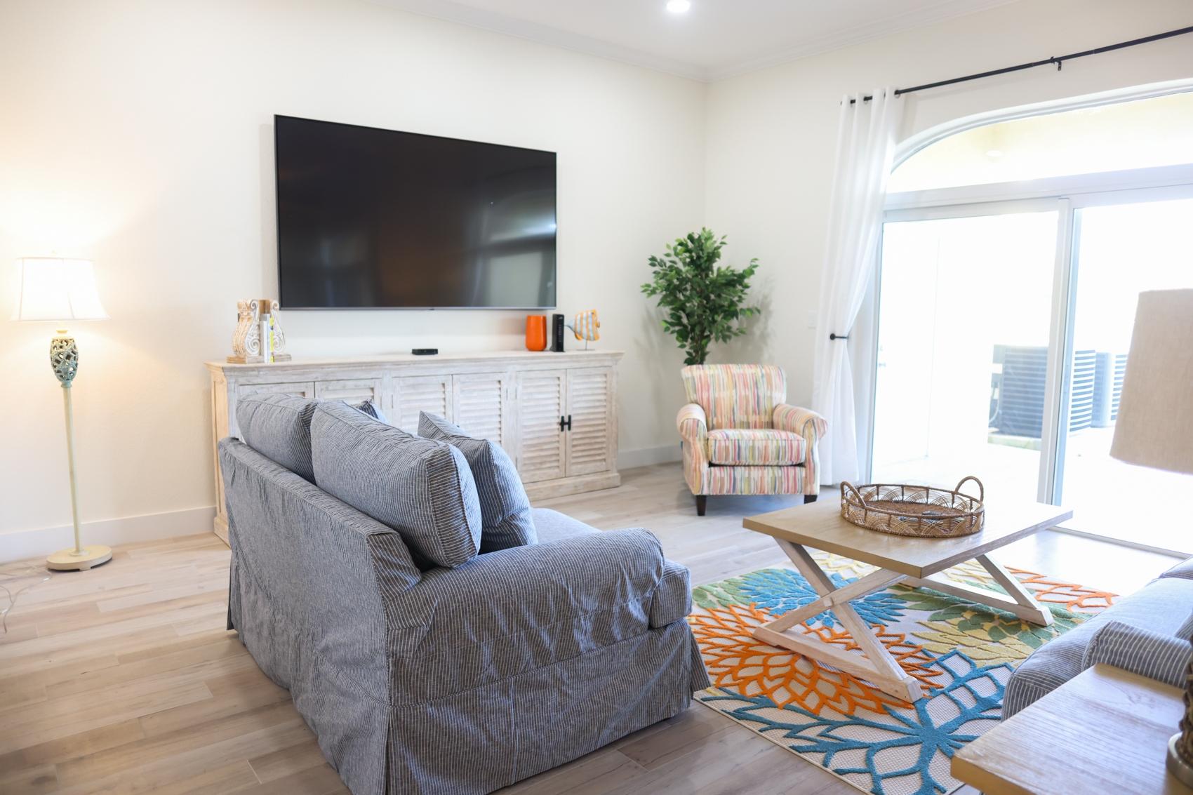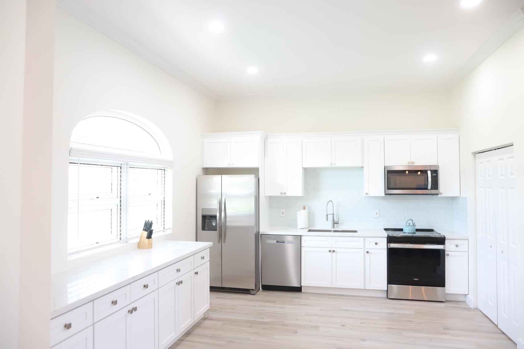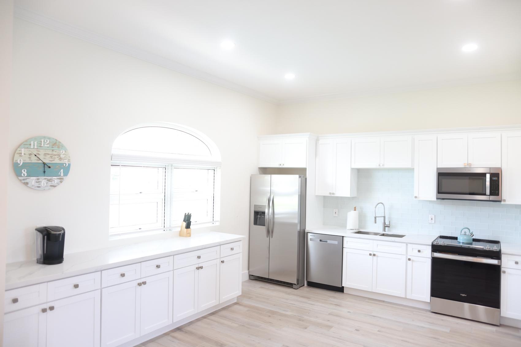 The Eleuthera Villa is 3 bedroom 3.5 bath villa overlooking the marina at Villa Marina Cove. Centrally located on Midshipman Road it is conveniently located between Taino Beach and Port Lucaya. The 3 bedrooms are elegantly furnished with king beds and premium linens with ensuite luxury bathrooms. The living room features an 85-inch TV and the bedrooms are equipped with 55-inch smart TV’s. 1 bedroom is located on the ground level with the gourmet kitchen, large dining area and living area with patio doors leading to an outdoor patio and the marina. There is also a half bath and full-size washer and dryer located on the ground level. Upstairs features a large master suite equipped with ensuite bathroom with glass shower stall, double vanity, and soaker tub. It also has its own private terrace. The 2nd upstairs bedroom has a king size bed, desk and ensuite bath. Covered parking and an outdoor pool are included and the entire property is secured and gated.