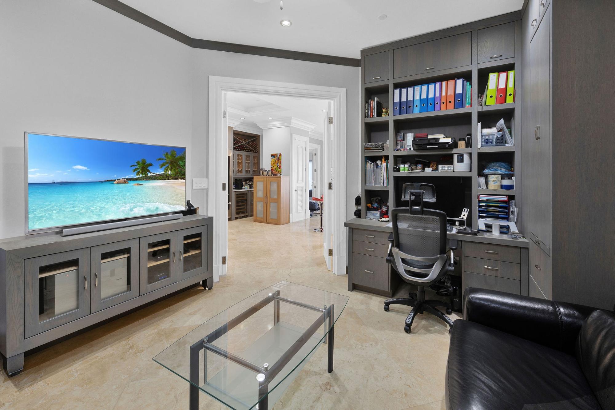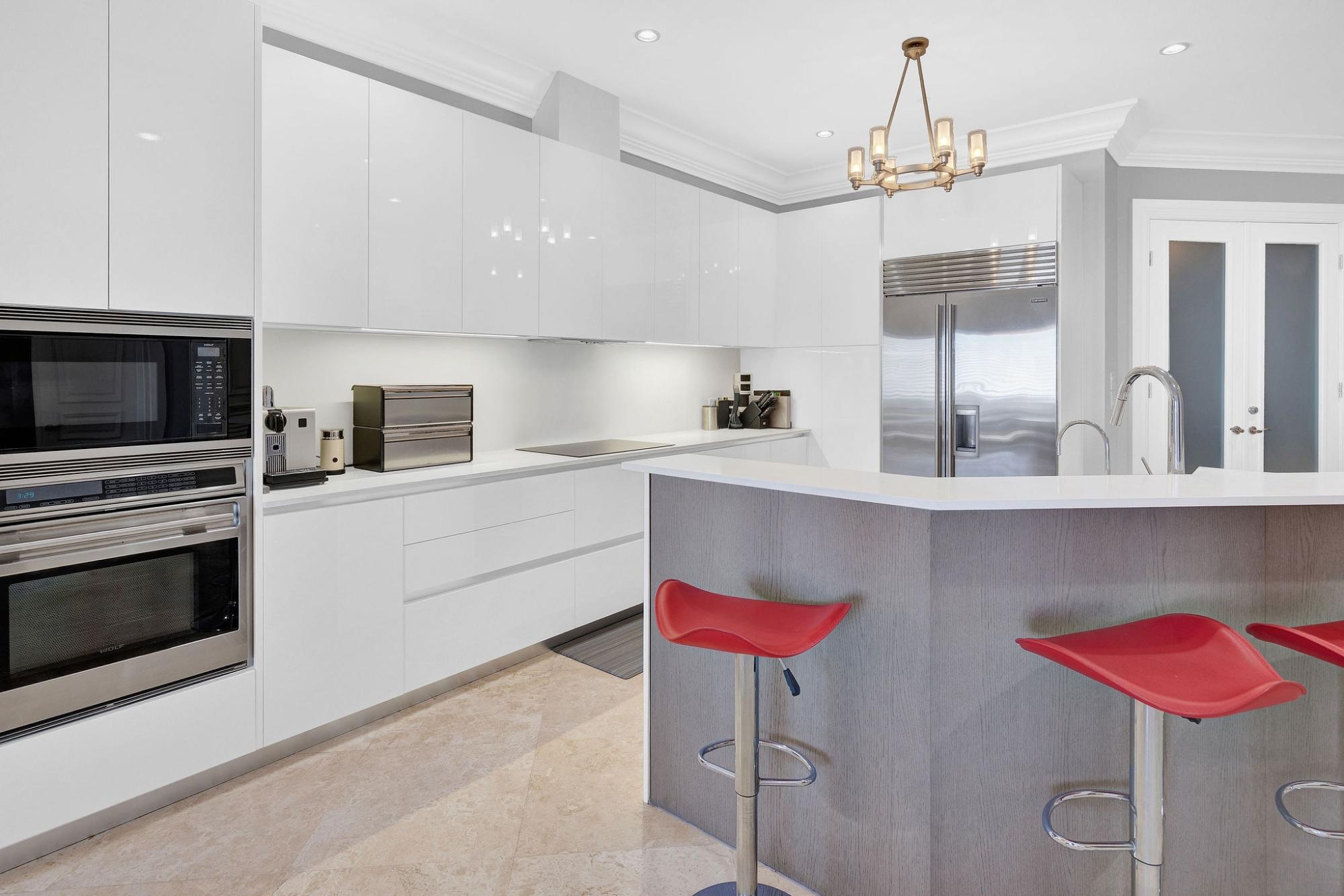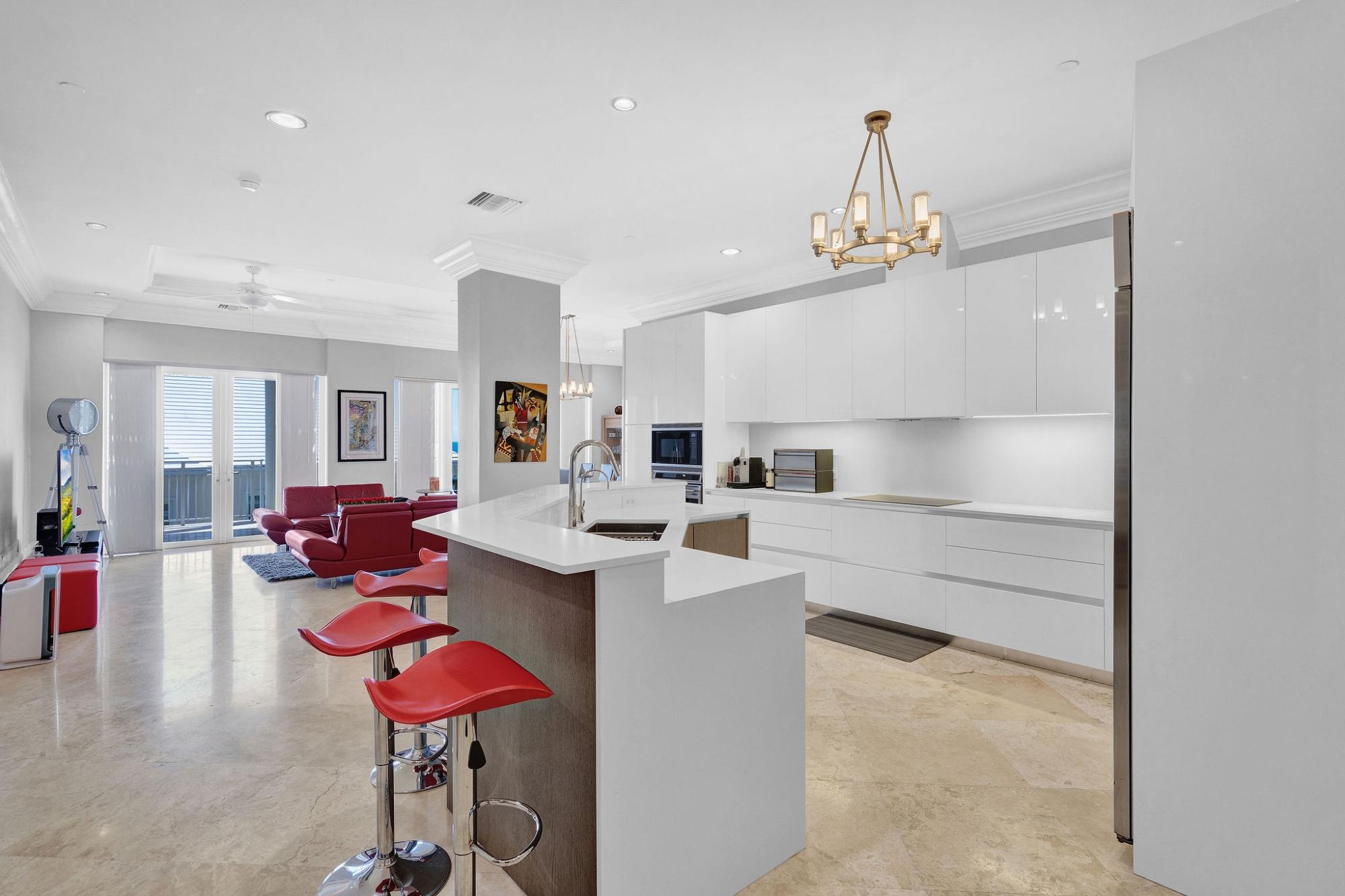 Situated on the fifth floor, this refined 3-bedroom, 2.5-bath residence offers sweeping ocean and golf course views across approximately 2,798 sq. ft. of elegant indoor-outdoor living. A private elevator opens directly into a bright, open-concept living area that flows seamlessly onto a spacious covered balcony, perfect for entertaining. The home showcases a custom Italkraft Italian kitchen designed as a social hub, featuring island seating, custom wine racks and glass shelving, two Sub-Zero wine refrigerators, and two Sub-Zero freezer drawers. The primary suite is a private retreat with balcony access, a custom walk-in closet, and a spa-style en-suite bath with Jacuzzi tub. A versatile den with custom cabinetry serves as a third bedroom or office. Upgrades include a monitored alarm system, GE TR5000 surge protection, Aquaboon 3-stage filtration, Pure H2O reverse osmosis, impact windows and doors, stone flooring, and a new LG washer and dryer. Two assigned parking spaces included.