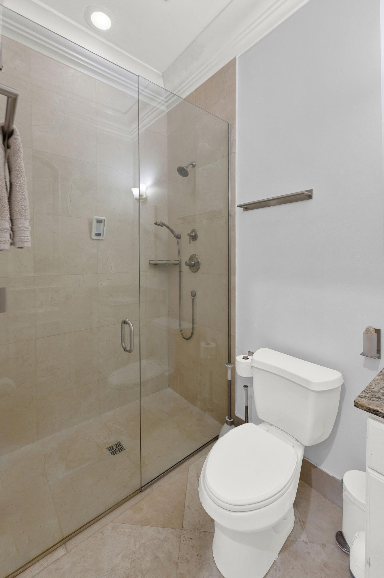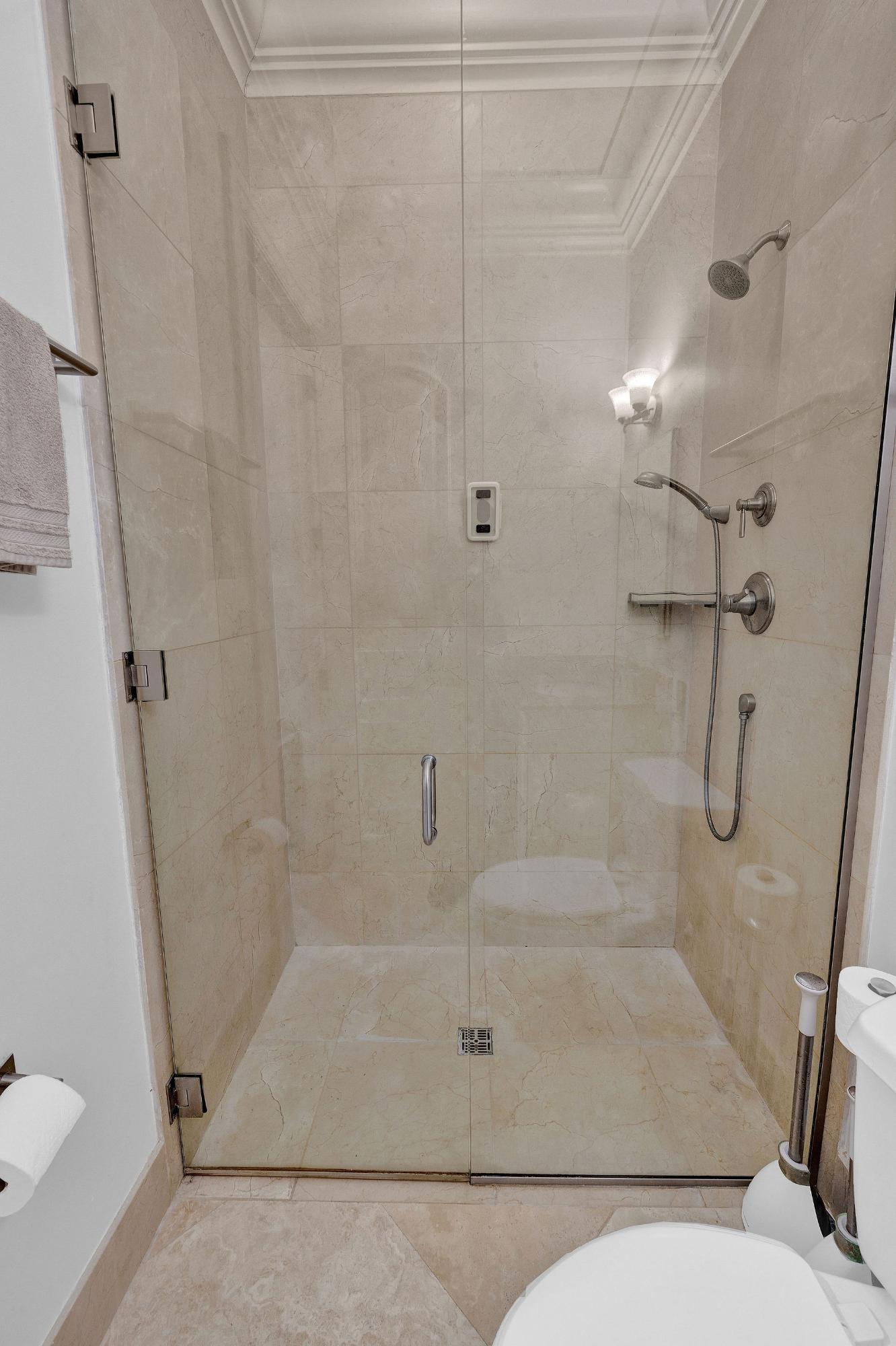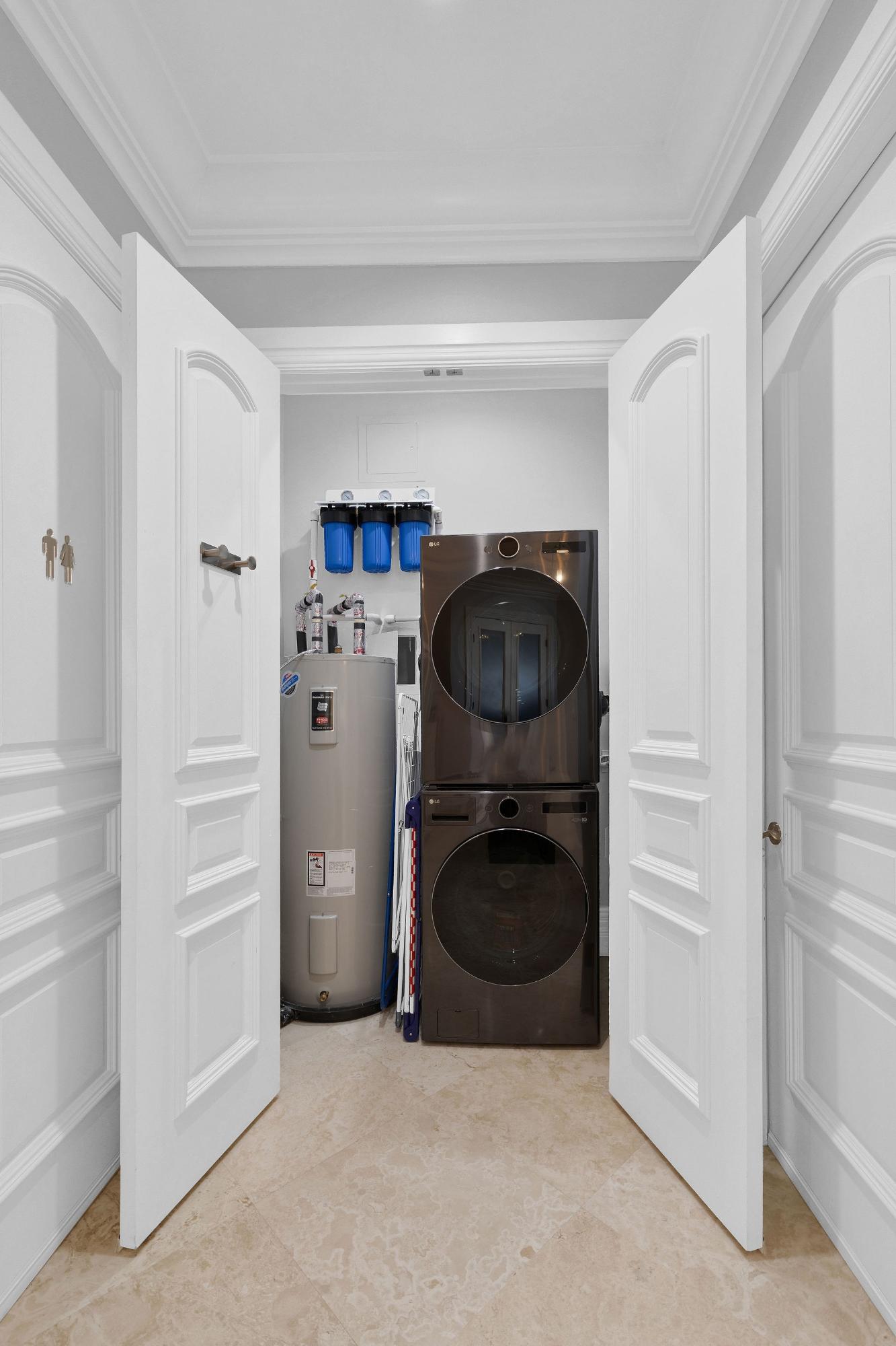 Situated on the fifth floor, this refined 3-bedroom, 2.5-bath residence offers sweeping ocean and golf course views across approximately 2,798 sq. ft. of elegant indoor-outdoor living. A private elevator opens directly into a bright, open-concept living area that flows seamlessly onto a spacious covered balcony, perfect for entertaining. The home showcases a custom Italkraft Italian kitchen designed as a social hub, featuring island seating, custom wine racks and glass shelving, two Sub-Zero wine refrigerators, and two Sub-Zero freezer drawers. The primary suite is a private retreat with balcony access, a custom walk-in closet, and a spa-style en-suite bath with Jacuzzi tub. A versatile den with custom cabinetry serves as a third bedroom or office. Upgrades include a monitored alarm system, GE TR5000 surge protection, Aquaboon 3-stage filtration, Pure H2O reverse osmosis, impact windows and doors, stone flooring, and a new LG washer and dryer. Two assigned parking spaces included.