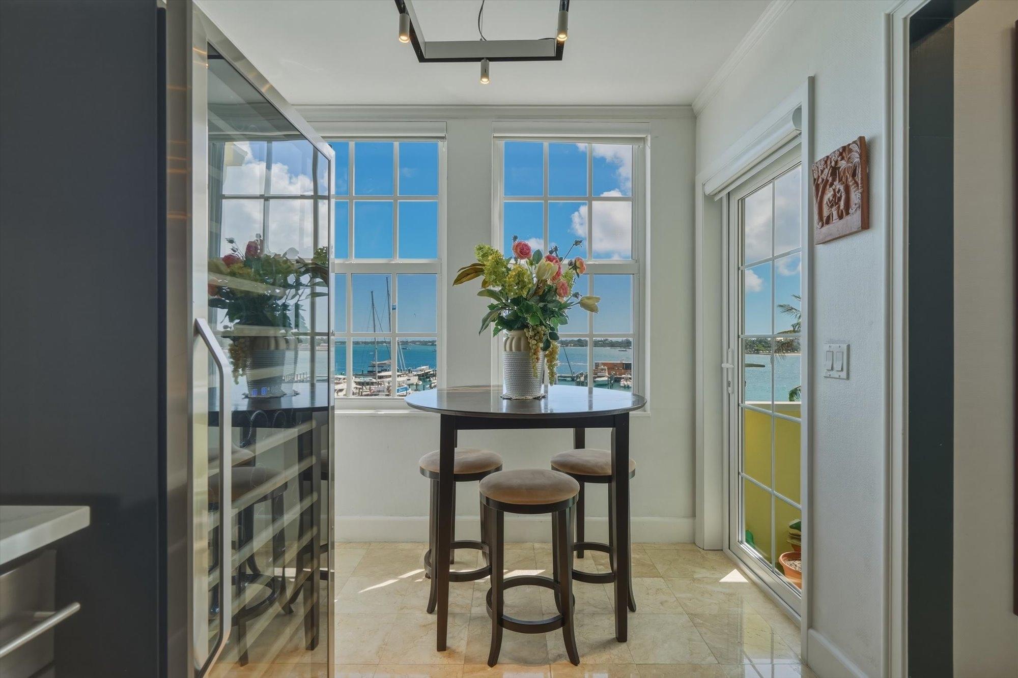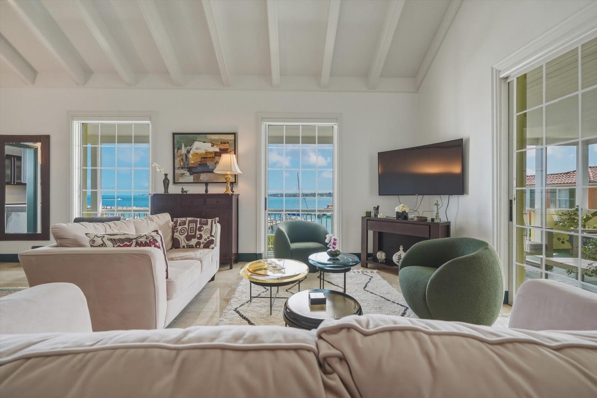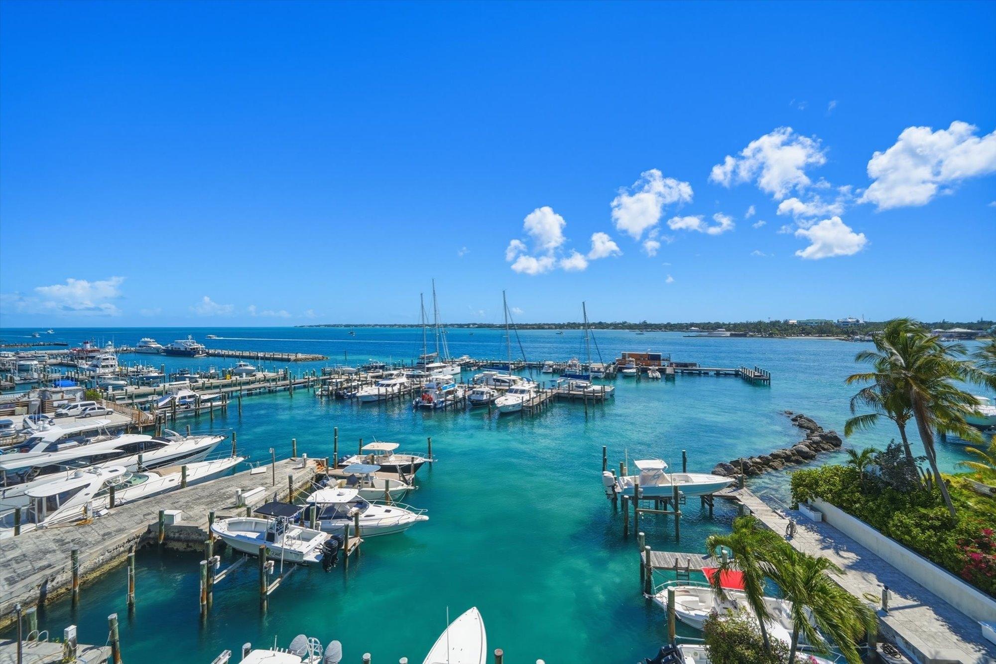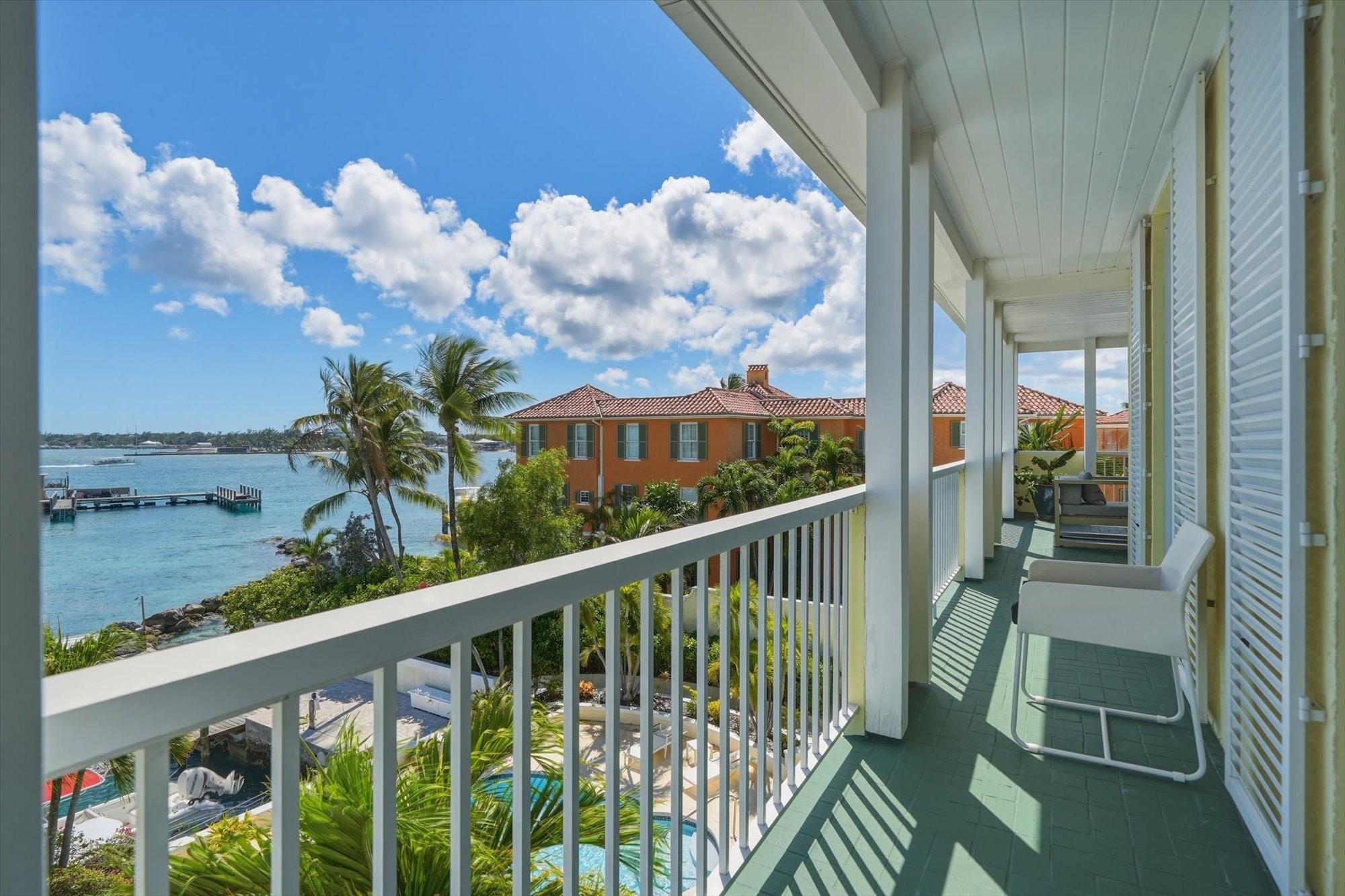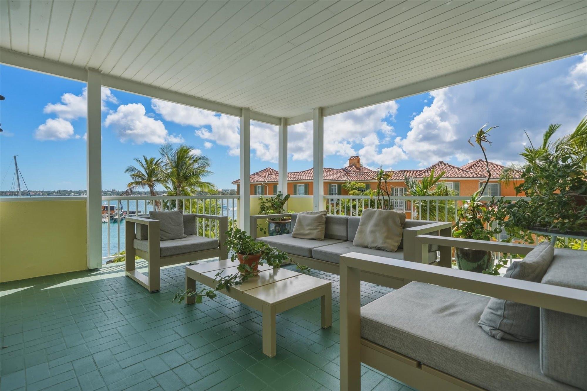 Noble House #6 is a beautifully renovated 3 bedroom, 3.5 bathroom waterfront residence on Paradise Island, offered fully furnished and turnkey following a 2024 renovation. The condo features high pitched ceilings in the bright open living and dining areas and enjoys harbor views from the living room, dining room, kitchen, and primary suite. The separate kitchen is appointed with stainless steel appliances, quartz countertops, and a wine fridge, while all bathrooms also feature quartz finishes. The primary suite includes a spacious dressing area and the residence offers abundant storage throughout. Outdoor living includes a large furnished patio overlooking the harbor and a rare 900 sq. ft. private rooftop terrace, one of only two in the building, ideal for entertaining and relaxing with sweeping views. Additional highlights include a 35 ft. dock slip, rooftop storage area, gated entrance, swimming pool, two parking spaces, and backup generator.