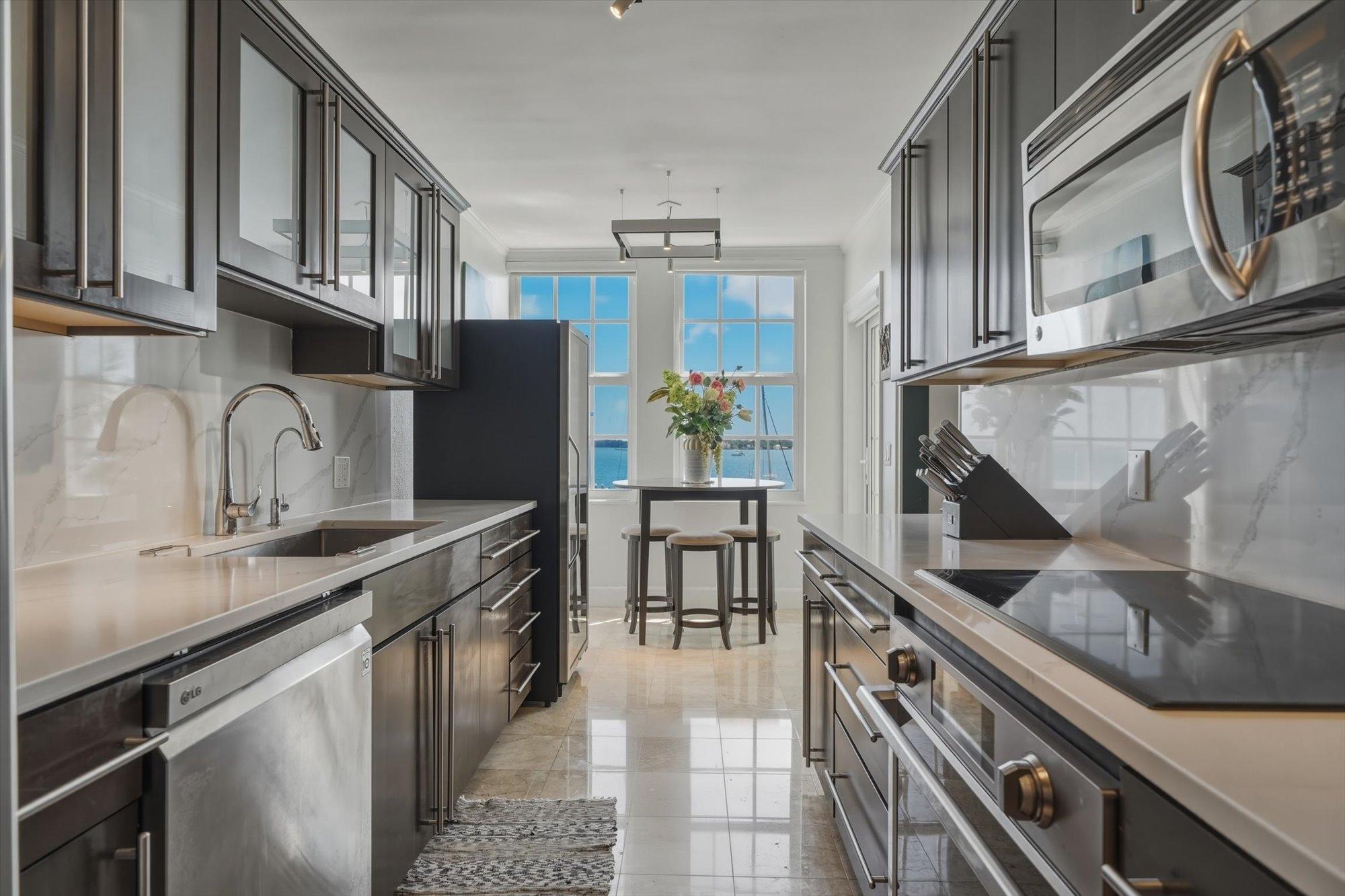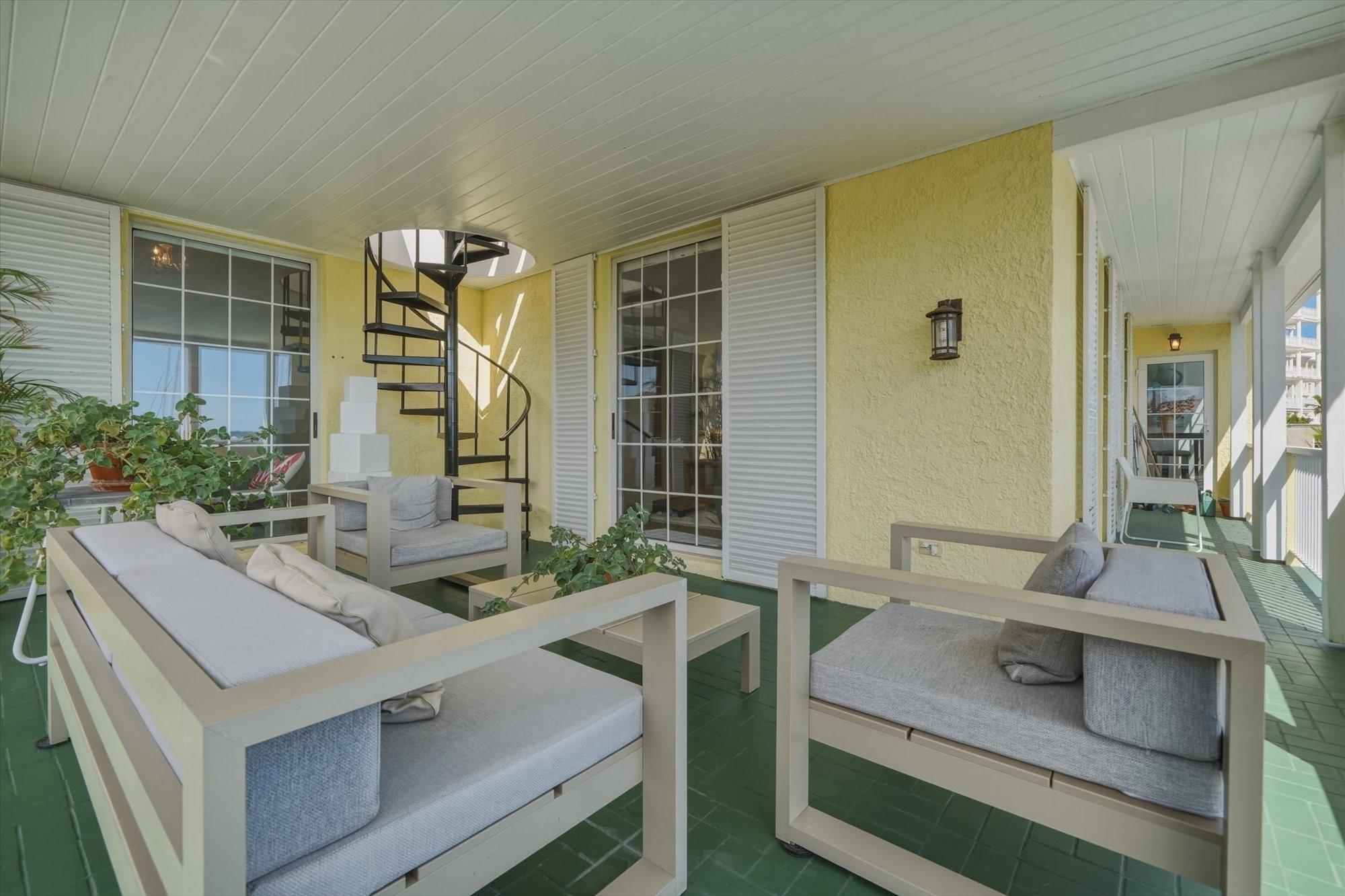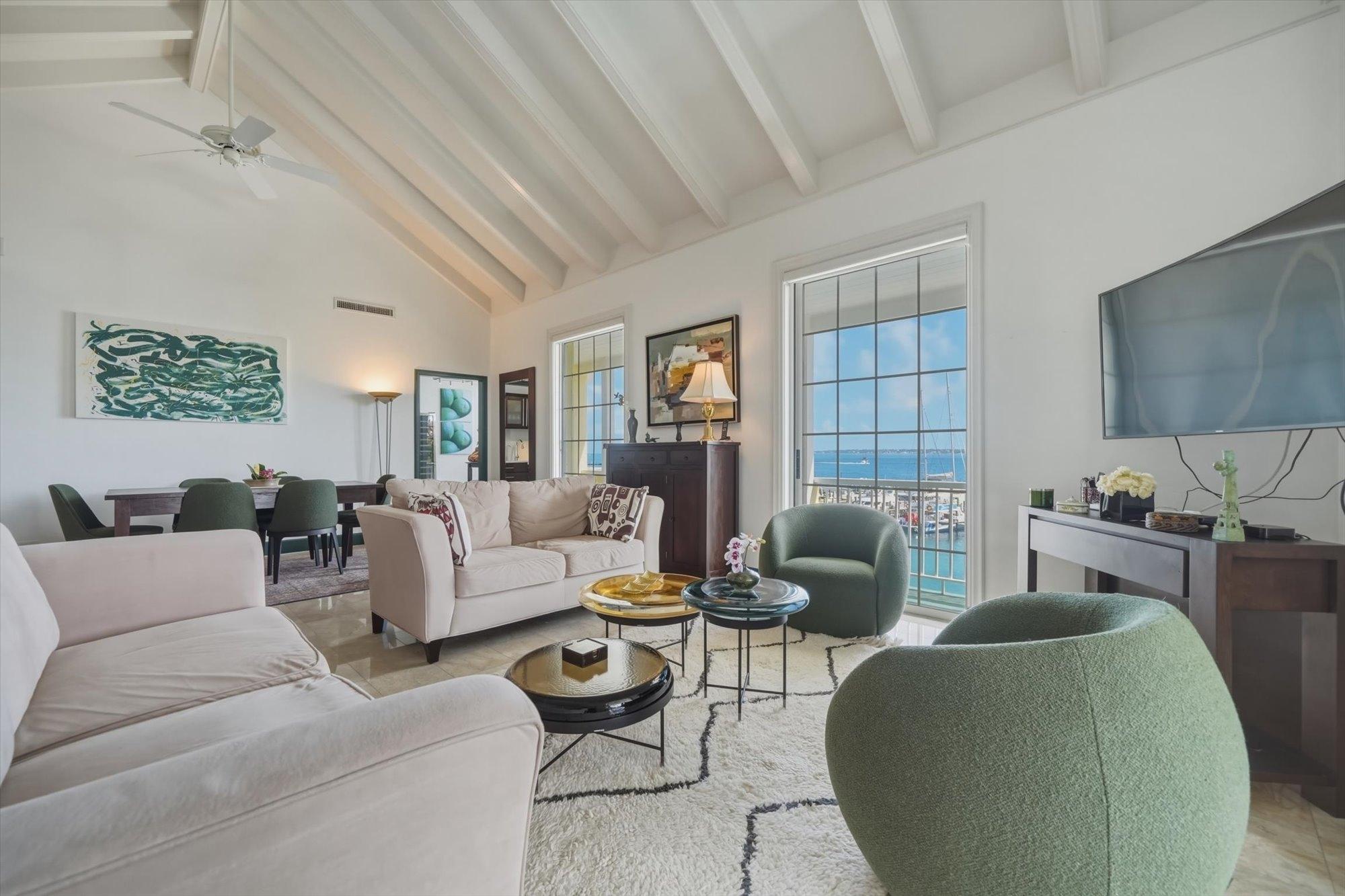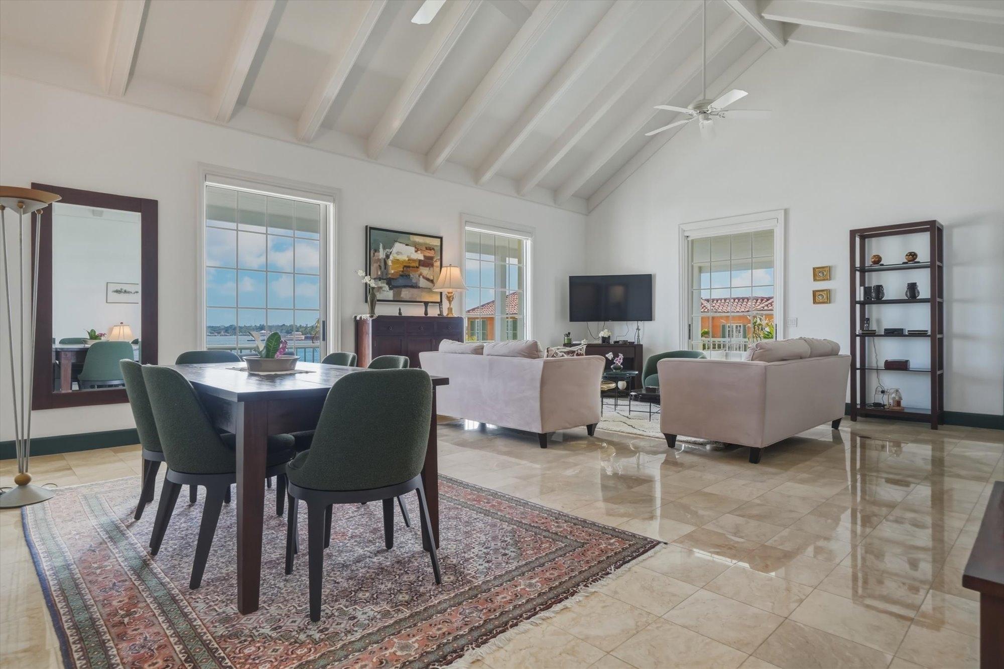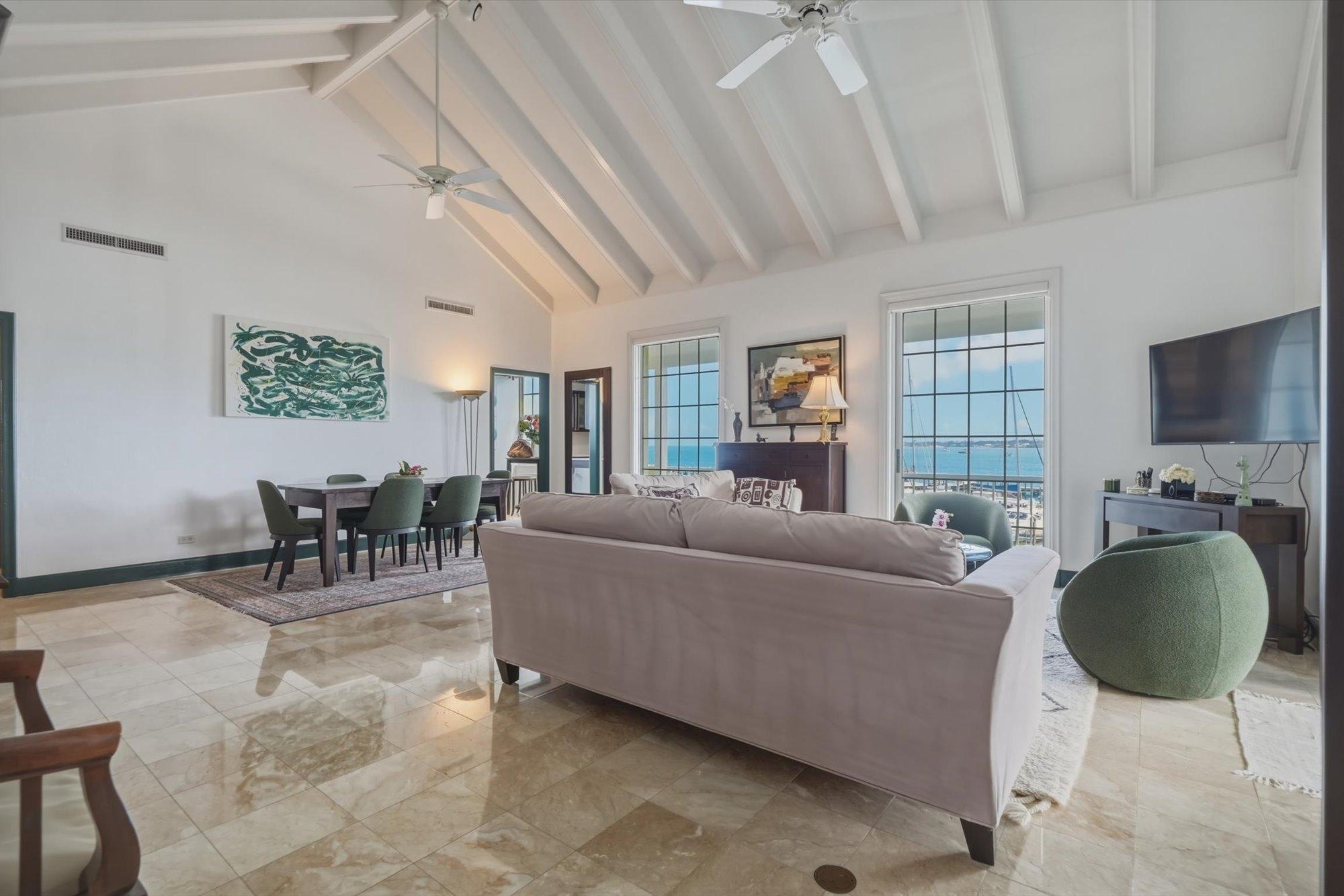 Noble House #6 is a beautifully renovated 3 bedroom, 3.5 bathroom waterfront residence on Paradise Island, offered fully furnished and turnkey following a 2024 renovation. The condo features high pitched ceilings in the bright open living and dining areas and enjoys harbor views from the living room, dining room, kitchen, and primary suite. The separate kitchen is appointed with stainless steel appliances, quartz countertops, and a wine fridge, while all bathrooms also feature quartz finishes. The primary suite includes a spacious dressing area and the residence offers abundant storage throughout. Outdoor living includes a large furnished patio overlooking the harbor and a rare 900 sq. ft. private rooftop terrace, one of only two in the building, ideal for entertaining and relaxing with sweeping views. Additional highlights include a 35 ft. dock slip, rooftop storage area, gated entrance, swimming pool, two parking spaces, and backup generator.