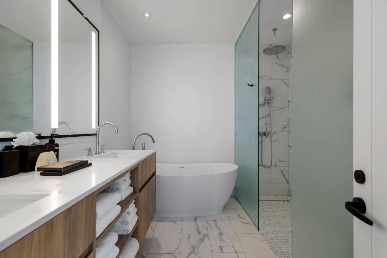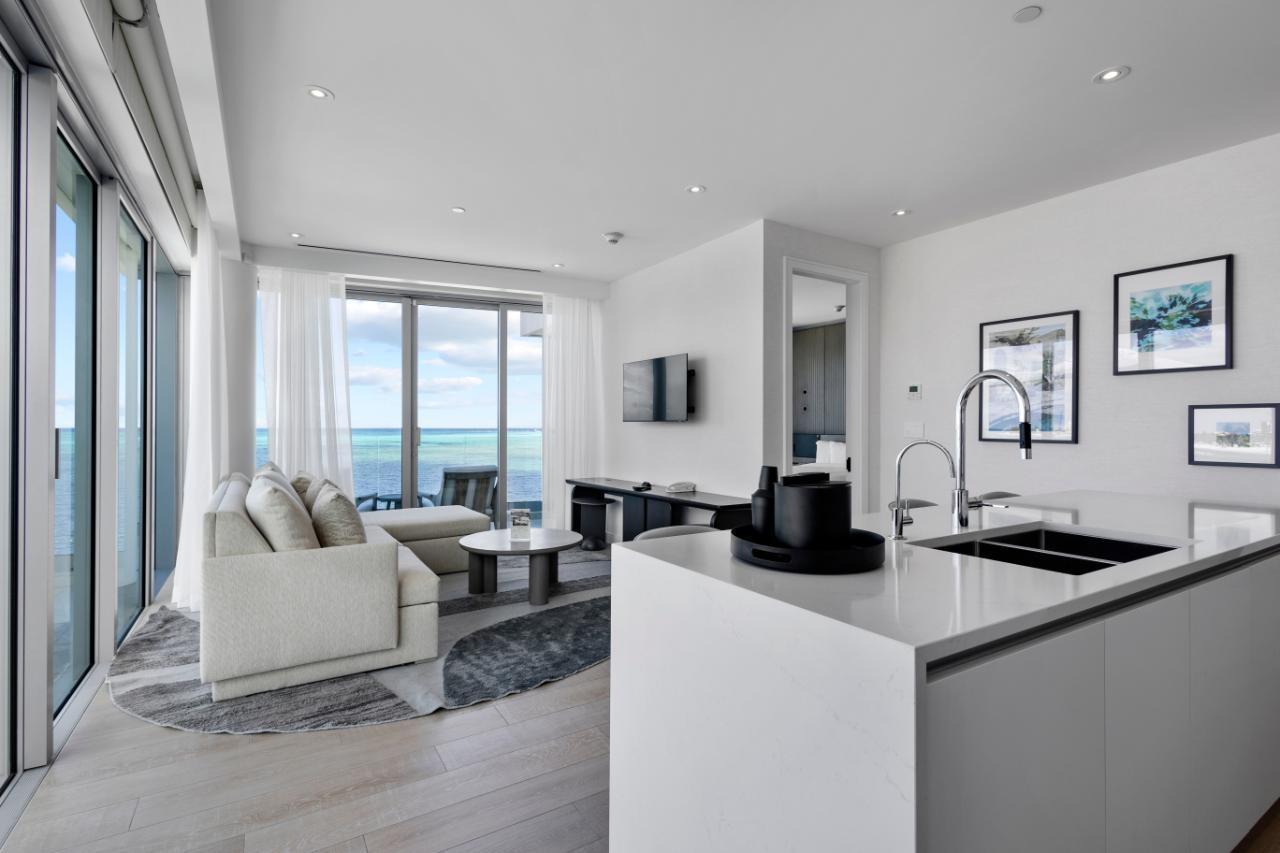 Goldwynn resort features a soft and modern design that blends with the shoreline just steps away from the water. This stunning 2-bed suite is located on the hotel side of the complex. The residence offers almost 1400 sq ft of living space with 1213 sq ft for the main unit plus an additional 712 sq ft for the balcony alone. The full kitchen has high-end appliances, cabinets and countertops. Both bedrooms have ensuite bathrooms with premium fixtures and amenities. The residence features a lock off option allowing you to either enjoy the entire space or close off one side for yourself while you rent out the other. The best part of this suite is the private balcony that gives you amazing views of the ocean and the island. The suite also has custom blackout drapes, individual air-conditioning and access to all resort facilities, such as 3 dining options, spa, rooftop bar & pool for condo owners only, state of the art gym and more!