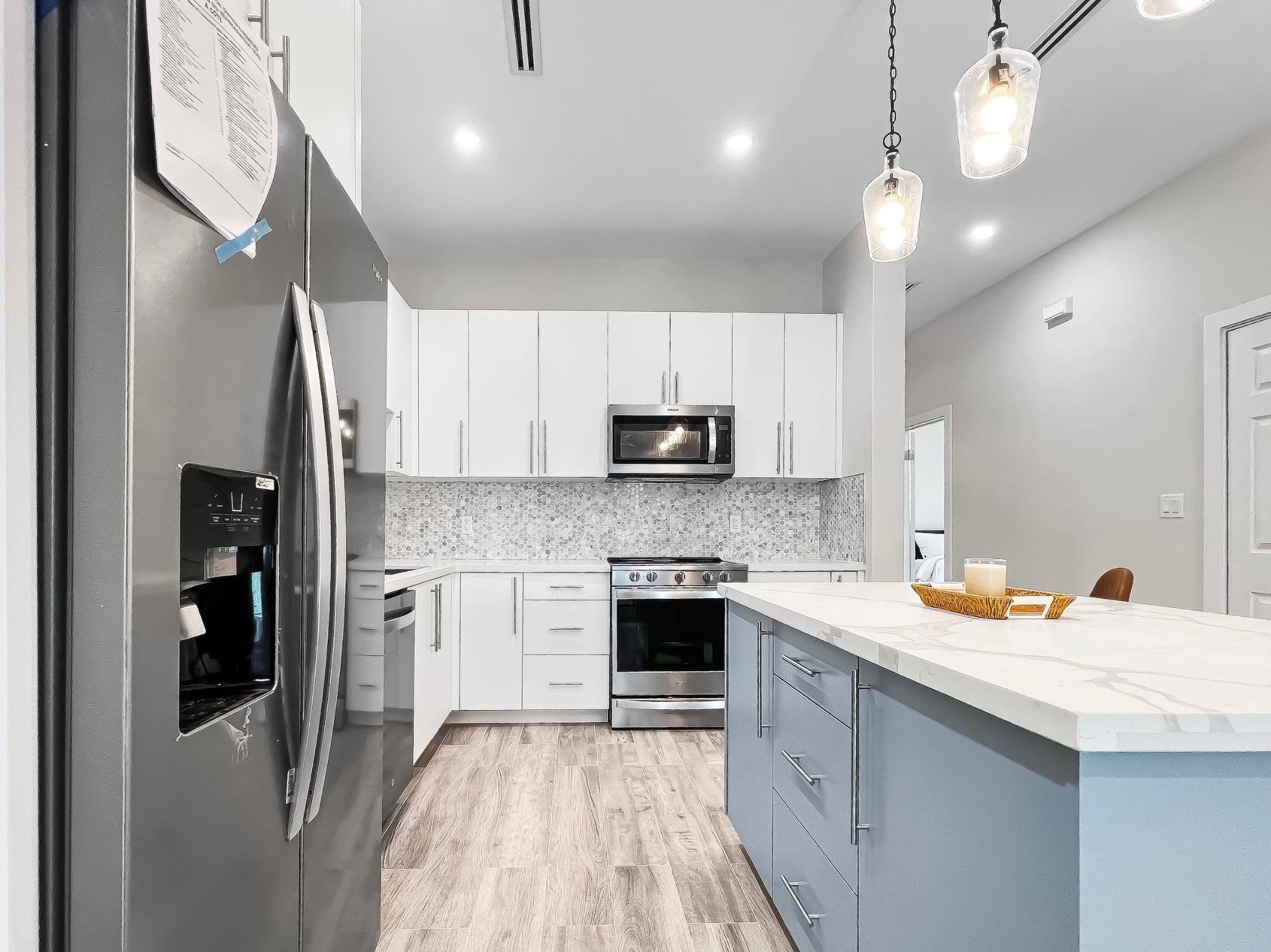 This brand-new rental, just steps away from the iconic The Island "Caves" and a pristine stretch of white sandy beachfront, is now available for rent. Offered fully furnished, the unit is located within the gated community of Caves Terrace, a section of the increasingly popular Westlake Plantation community. From the moment you walk through the impressive 8-foot entryway, you are welcomed into a contemporary interior featuring high ceilings and stylish modern accents. Each room is thoughtfully designed with generous space, built-in closets with shelving, and an abundance of natural light. The guest bedroom features a contemporary queen bed, while the primary suite offers a king bed, a spacious walk-in closet, and a well-appointed bathroom with dual vanities and a frameless glass walk-in shower. The primary bedroom also features tall impact doors that open onto the patio, creating approximately 250 sq. ft. of outdoor living space. Other amenities include, pool, gazebo and full standby generator. With multiple units this property is an excellent option for companies or organizations.