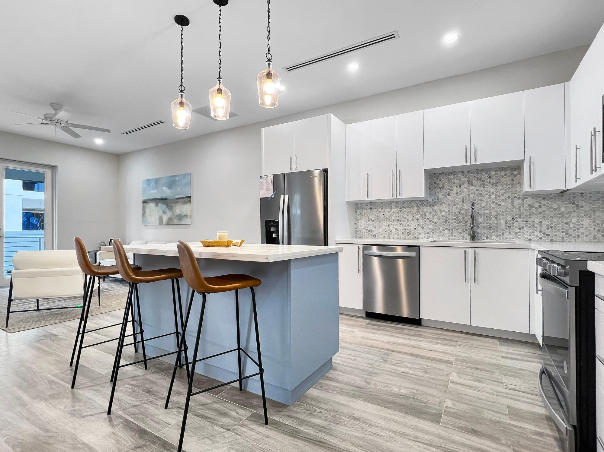This brand-new rental, just steps away from the iconic The Island "Caves" and a pristine stretch of white sandy beachfront, is now available for rent. Offered fully furnished, the unit is located within the gated community of Caves Terrace, a section of the increasingly popular Westlake Plantation community. From the moment you walk through the impressive 8-foot entryway, you are welcomed into a contemporary interior featuring high ceilings and stylish modern accents. Each room is thoughtfully designed with generous space, built-in closets with shelving, and an abundance of natural light. The guest bedroom features a contemporary queen bed, while the primary suite offers a king bed, a spacious walk-in closet, and a well-appointed bathroom with dual vanities and a frameless glass walk-in shower. The primary bedroom also features tall impact doors that open onto the patio, creating approximately 250 sq. ft. of outdoor living space. Other amenities include, pool, gazebo and full standby generator. With multiple units this property is an excellent option for companies or organizations.