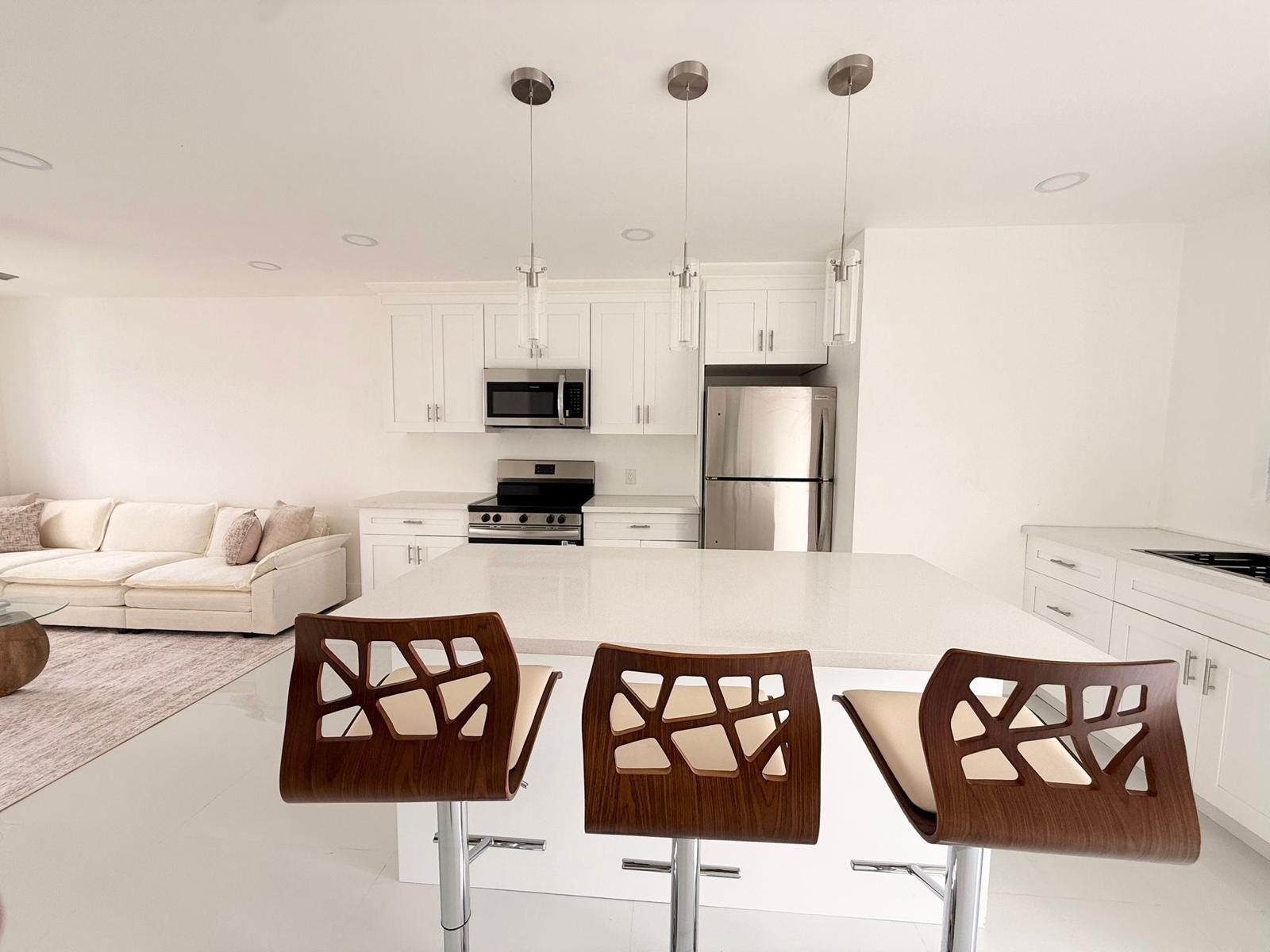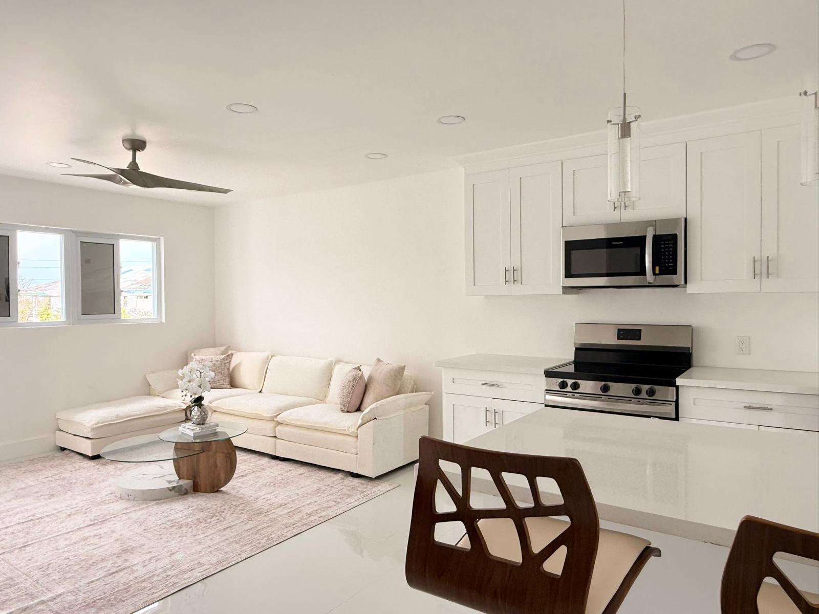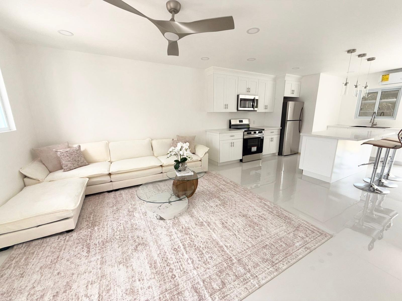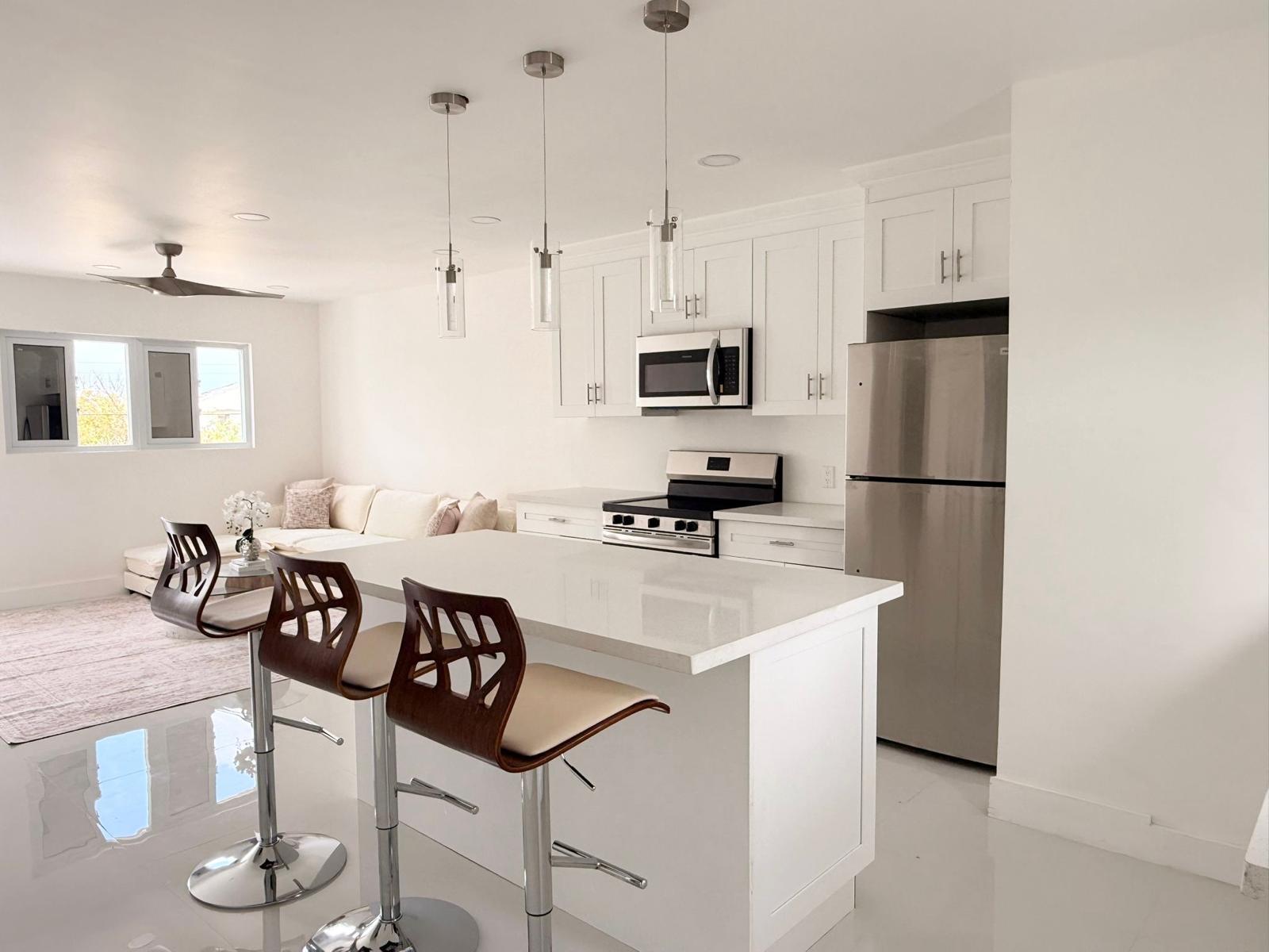 Step into this newly built, modern 2-bedroom, 1-bathroom apartment designed for comfort and convenience. Fully furnished with contemporary finishes, this space features an open layout complemented by a stylish breakfast bar. The apartment is equipped with sleek stainless steel appliances, ample cabinet space, recessed lighting and convenient washer and dryer, ductless A/C units, LED mirrors, and hurricane-impact windows which provide added safety and peace of mind. Ideally located near shopping, dining, and everyday conveniences, this apartment offers the perfect blend of style, functionality, and accessibility. Water is included.