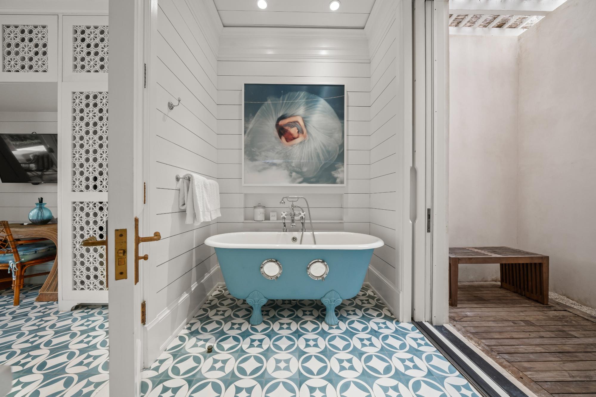 The home features six beautifully appointed bedroom suites, including a private guest residence in Palm Cottage. Each suite enjoys its own entrance, ensuite bath, and outdoor connection through a balcony or terrace, with select rooms offering open-air showers. The primary suite is a secluded retreat unto itself, complete with an ocean-facing terrace, dual dressing areas, soaking tub, and private outdoor shower designed for quiet moments overlooking the sea.