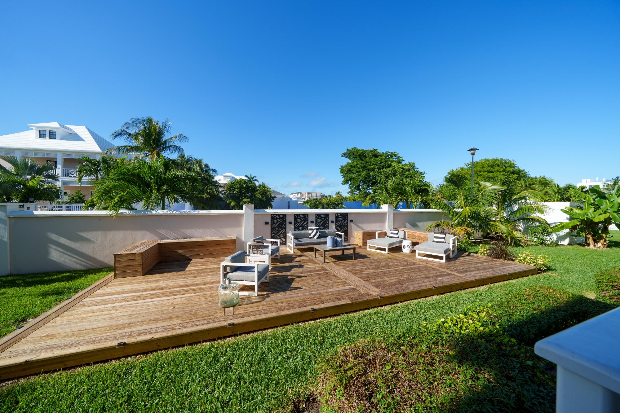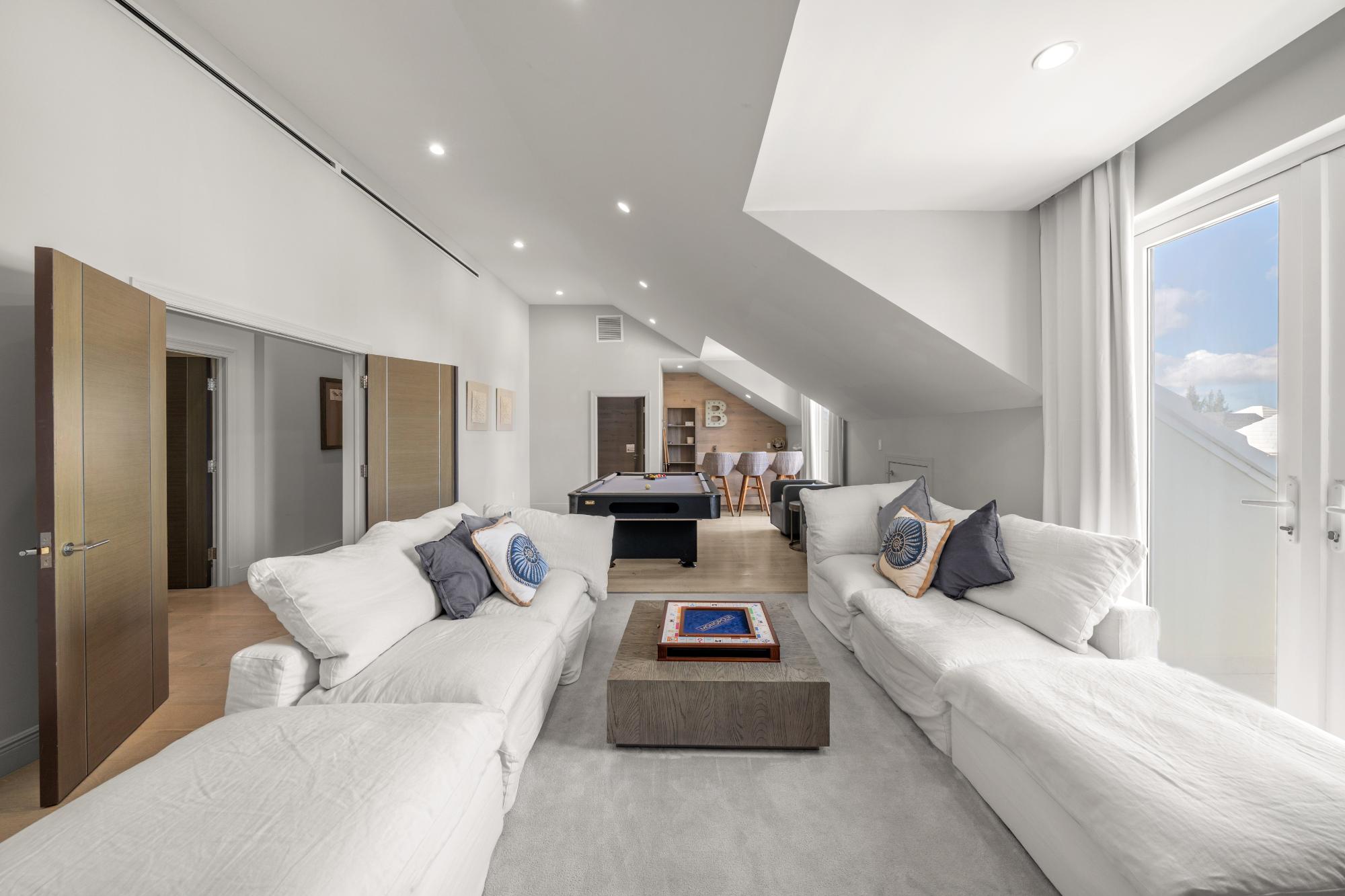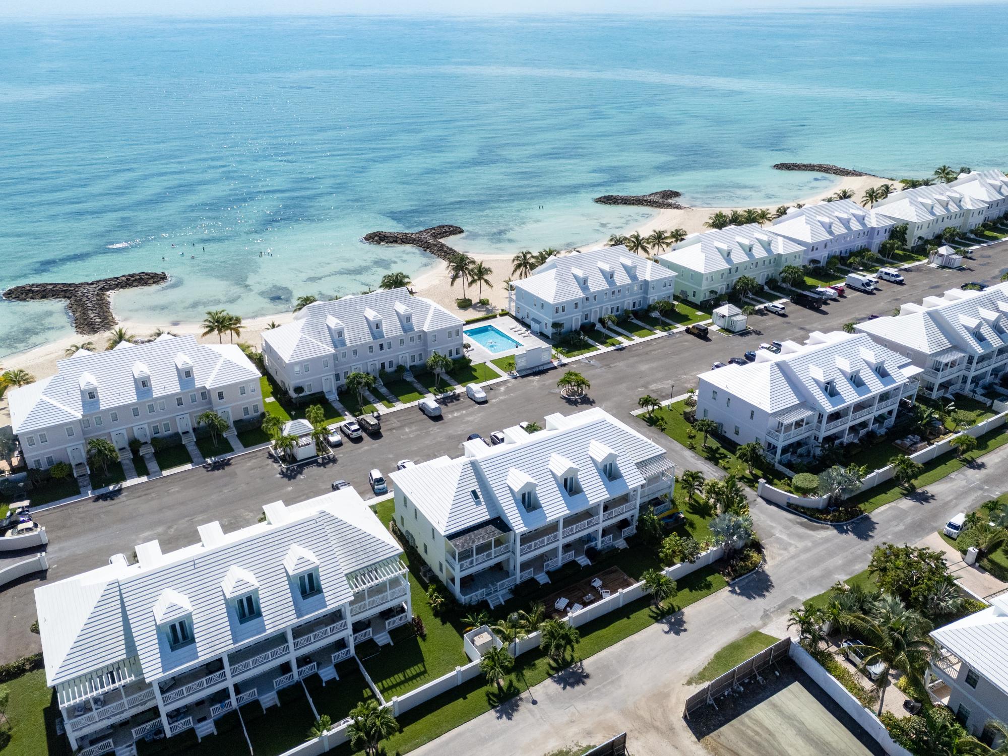 Discover refined island living in this exceptional double-unit townhome located within the exclusive gated community of Palm Cay, Nassau. Offering five bedrooms, four full bathrooms, and two powder rooms, this beautifully appointed residence is sold turnkey and fully furnished for effortless ownership. The open-concept living, dining, and kitchen area features porcelain tile flooring, recessed lighting, and high-end finishes throughout. A chef’s kitchen with solid wood cabinetry, a large island with seating for four, built-in coffee maker, double ovens, microwave, and wine storage flows seamlessly into the spacious living area and out to an inviting covered patio. Upstairs, the luxurious primary suite includes a large soaking tub, separate shower, double sinks, and dual rain showerheads, while the third-floor lounge with a bar, balconies, powder room, and pool table provides an ideal entertainment space. Outdoor living is maximised with a double garden, oversized patio, and garden deck for relaxing or entertaining. Just steps from one of New Providence’s most beautiful beaches.