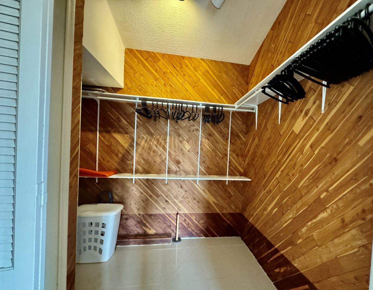 Upstairs, an open sitting area offers the perfect nook for a home office or lounge. The upper level also includes two well-appointed ensuite bedrooms. The spacious primary suite features a generous walk-in closet and direct access to the covered balcony overlooking the private pool and landscaped garden. An additional ensuite bedroom on this floor also opens onto the balcony, creating a serene shared outdoor space.