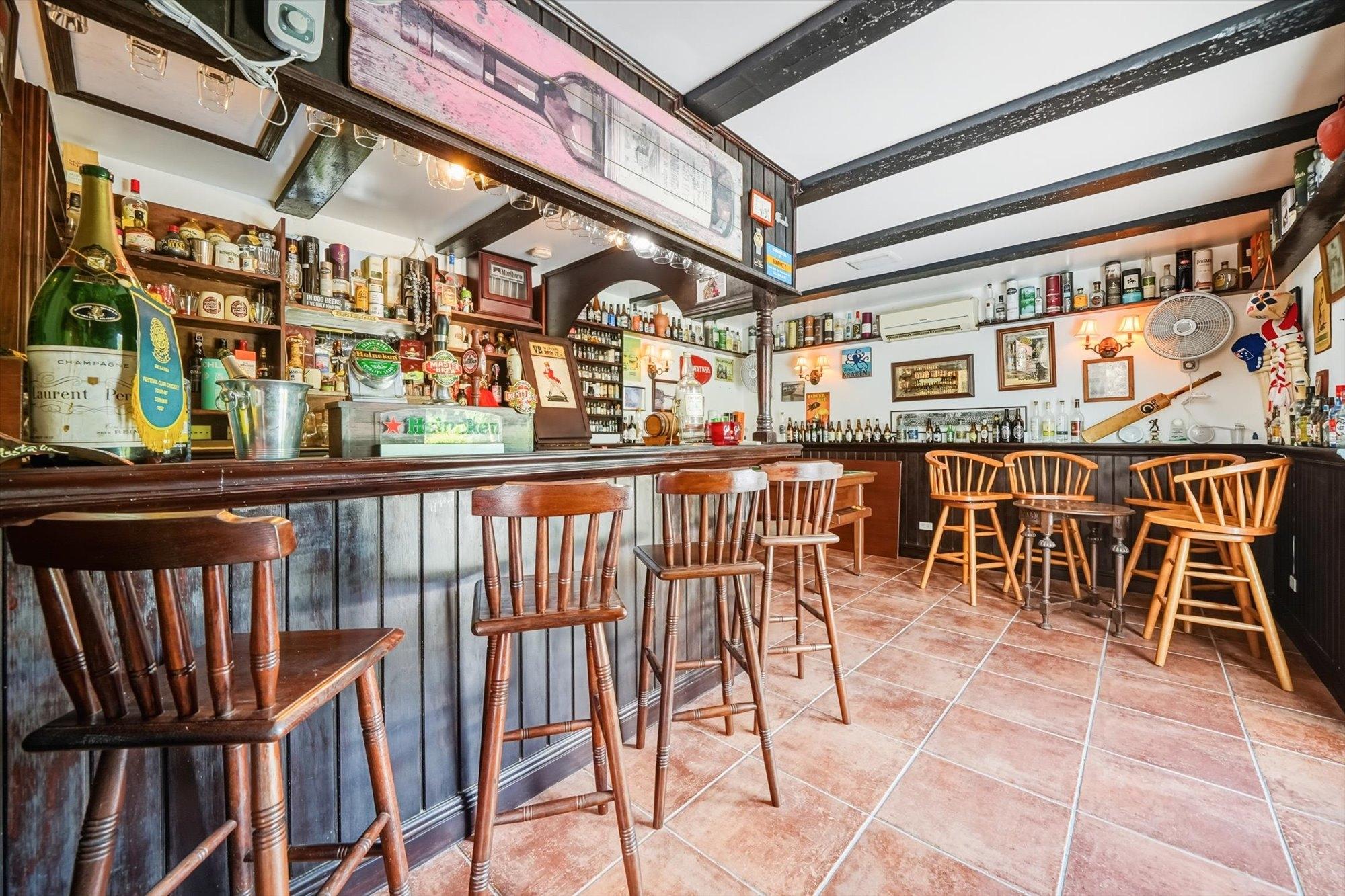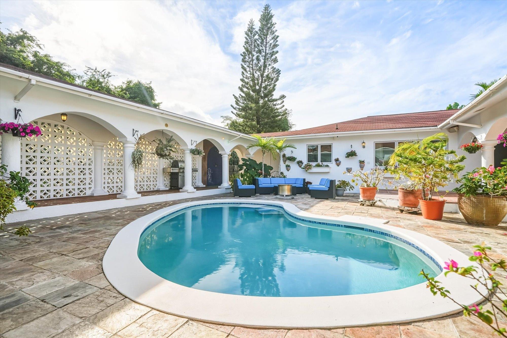 Situated in the quiet neighborhood just off the historic Eastern Road, this fully furnished and meticulously maintained home offers privacy, charm, and exceptional indoor-outdoor living. This 3,235sf residence is centered around a sunny courtyard with an inviting swimming pool and 1,835 sq. ft. of covered patios. An open-concept living, dining and kitchen area features tray wooden ceilings, courtyard views, a central island, granite countertops, SS appliances, a trash compactor, and an RO water system. The home includes a second bedroom with adjacent bath, a primary bedroom with cedar-lined walk-in closet and en-suite bath, and a large adjoining study suitable for conversion to a bedroom. A replica British pub provides a unique entertainment space, while a guest cottage offers its own living room, kitchen, and bathroom. The fully enclosed half-acre property includes automatic gates, hurricane-rated windows and doors, roll-down shutters, central and split A/C, garage, 20KW generator, solar pool heating, alarm system, fruit trees, gardens, sheds, and rainwater collection.