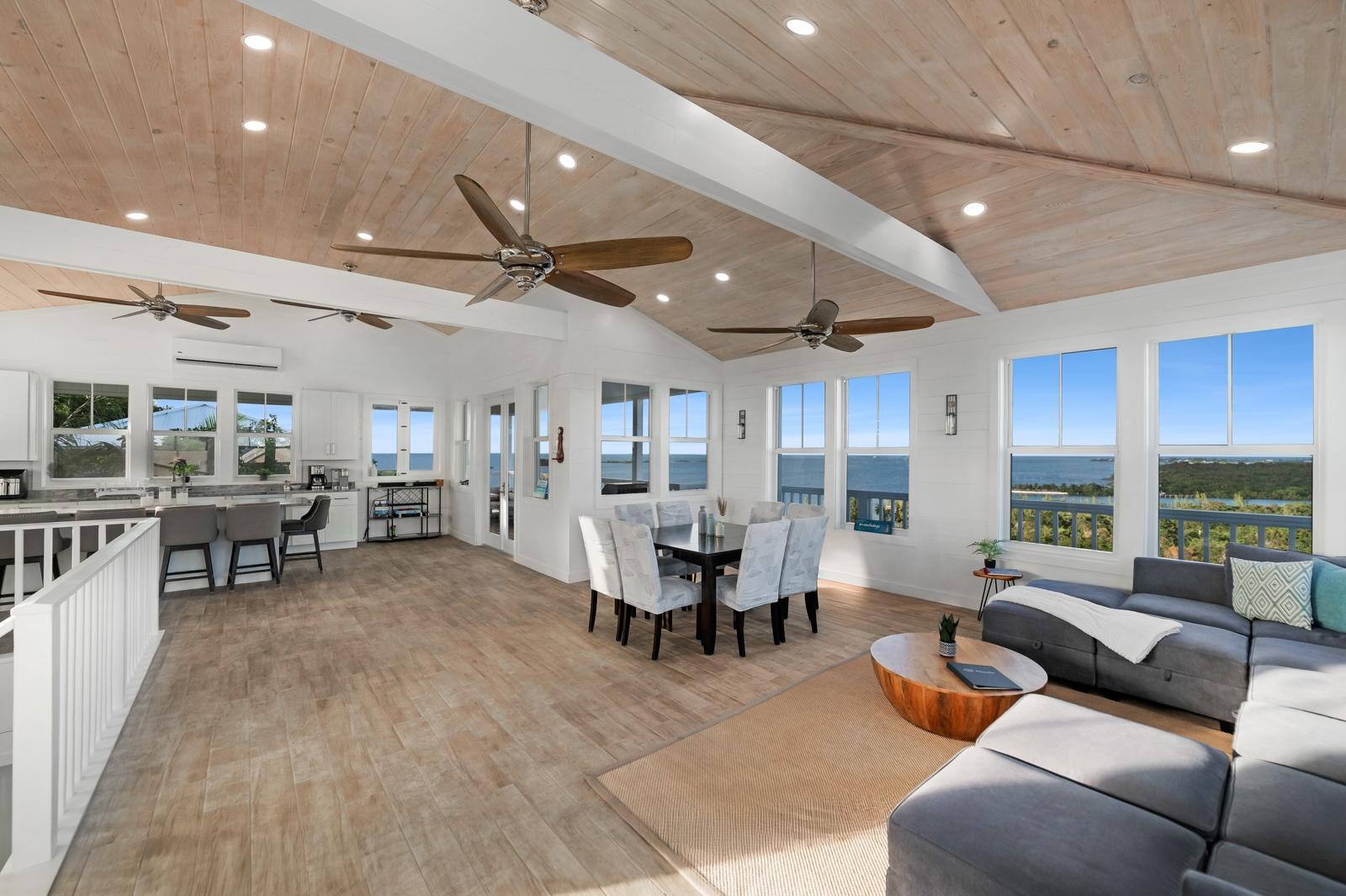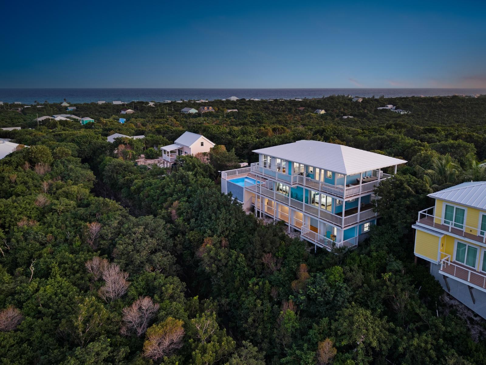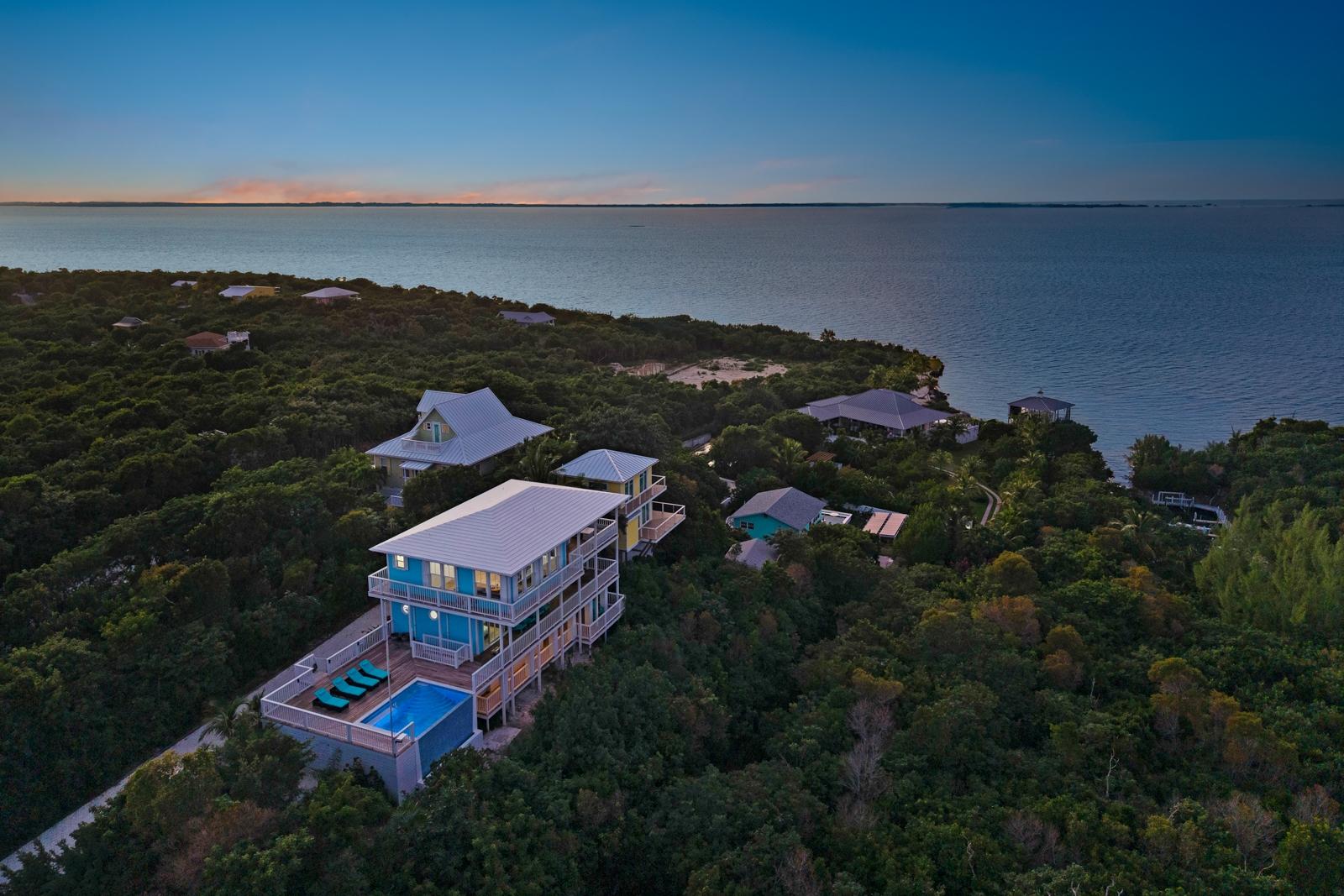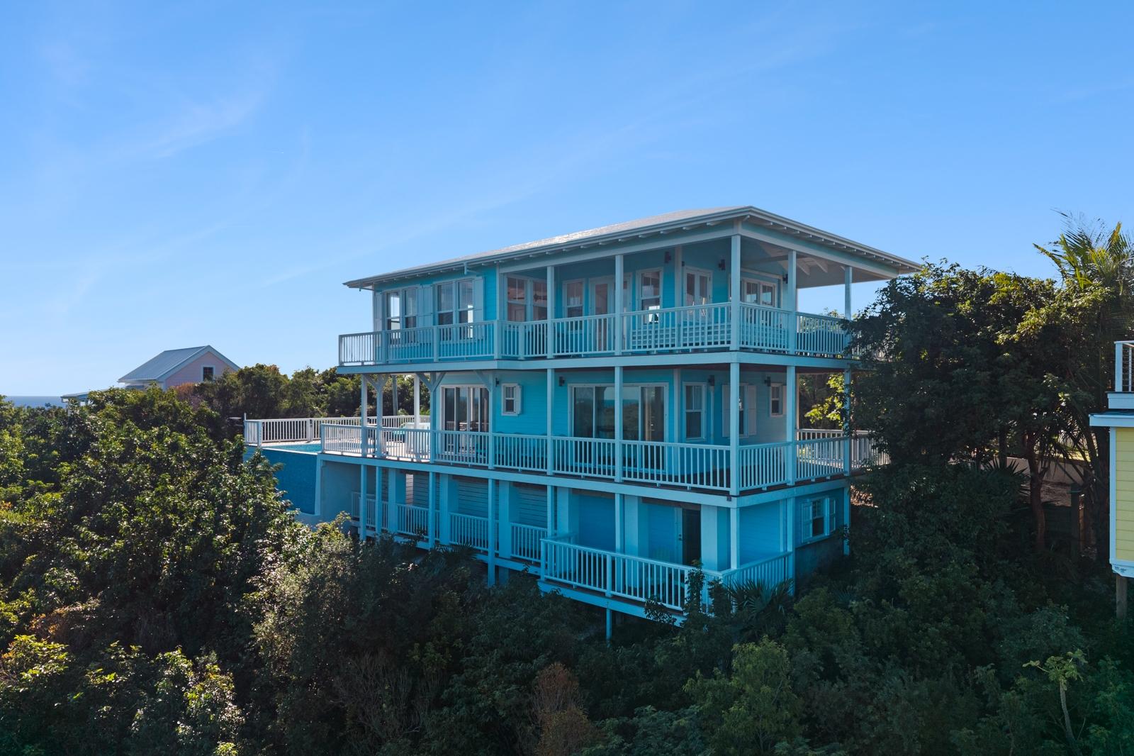 TRIPLE VISTAS: Sea of Abaco, Atlantic Ocean & Hope Town Harbour! This 3-story island retreat is located on one of the highest elevations Elbow Cay has to offer, with a falling grade that ensures panoramic water views and a gentle Bahama breeze. 4 bed/ 3.5 bath, and 1858 sq ft of fully air-conditioned living space with the crown jewel being the 1000 sq.’ sun deck with infinity pool overlooking the Sea of Abaco. Designed for a laid-back lifestyle, the expansive wrap-around decks on every level create ideal lounging havens. The top floor features indoor and outdoor great rooms. Perfect for family gatherings and entertaining! On the entrance floors of this inverted plan is a spacious master ensuite, guest room, bunk bedroom, laundry and 3rd bathroom. On the lower level, off the pool deck is another spacious en-suite with separate entrance and private balcony. Features include: wood-look ceramic tile, shiplap walls, 18KW diesel generator (auto-transfer), Starlink, and per-bedroom AC controls. Close to Sunset Exclusive Dockage, where the current owner has moorage. Proven rental history.
