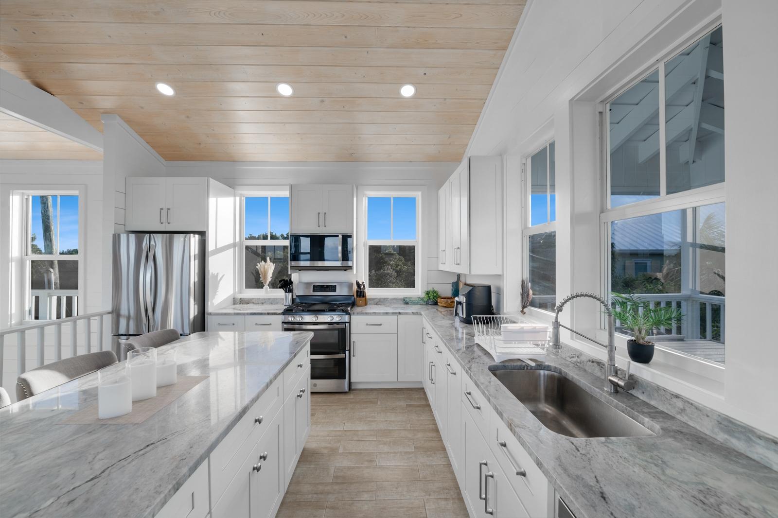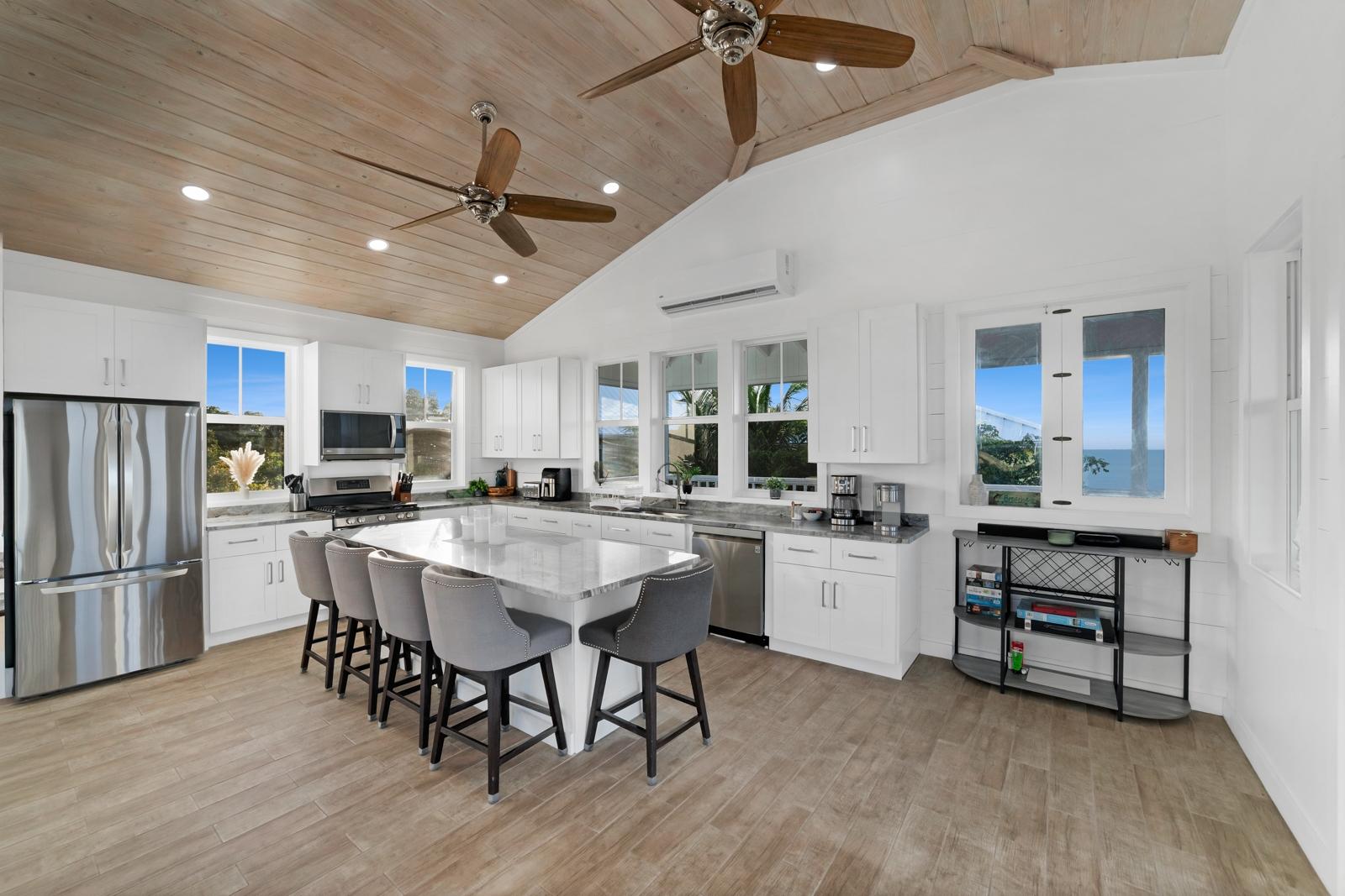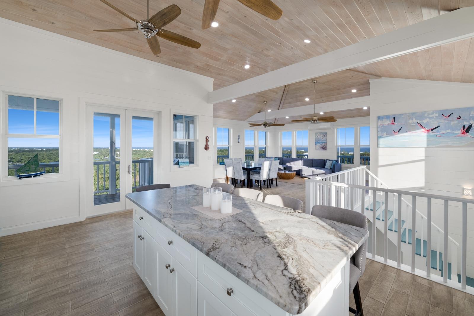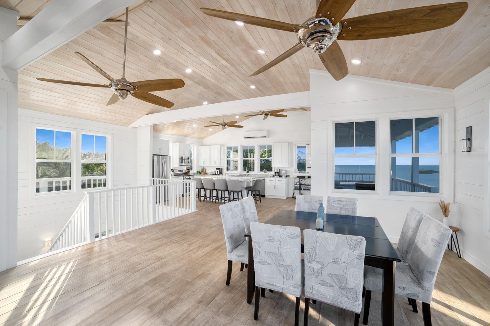 TRIPLE VISTAS: Sea of Abaco, Atlantic Ocean & Hope Town Harbour! This 3-story island retreat is located on one of the highest elevations Elbow Cay has to offer, with a falling grade that ensures panoramic water views and a gentle Bahama breeze. 4 bed/ 3.5 bath, and 1858 sq ft of fully air-conditioned living space with the crown jewel being the 1000 sq.’ sun deck with infinity pool overlooking the Sea of Abaco. Designed for a laid-back lifestyle, the expansive wrap-around decks on every level create ideal lounging havens. The top floor features indoor and outdoor great rooms. Perfect for family gatherings and entertaining! On the entrance floors of this inverted plan is a spacious master ensuite, guest room, bunk bedroom, laundry and 3rd bathroom. On the lower level, off the pool deck is another spacious en-suite with separate entrance and private balcony. Features include: wood-look ceramic tile, shiplap walls, 18KW diesel generator (auto-transfer), Starlink, and per-bedroom AC controls. Close to Sunset Exclusive Dockage, where the current owner has moorage. Proven rental history.