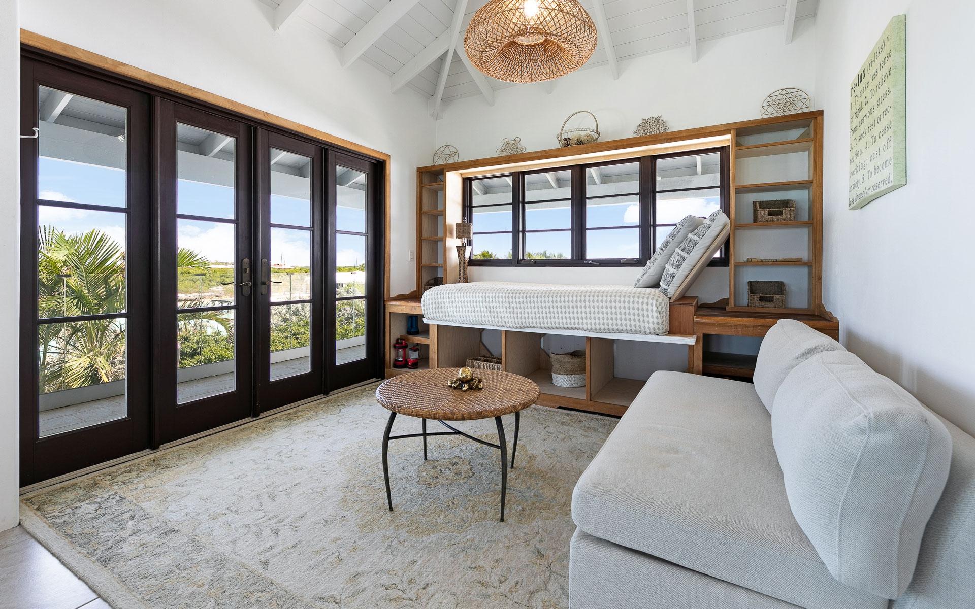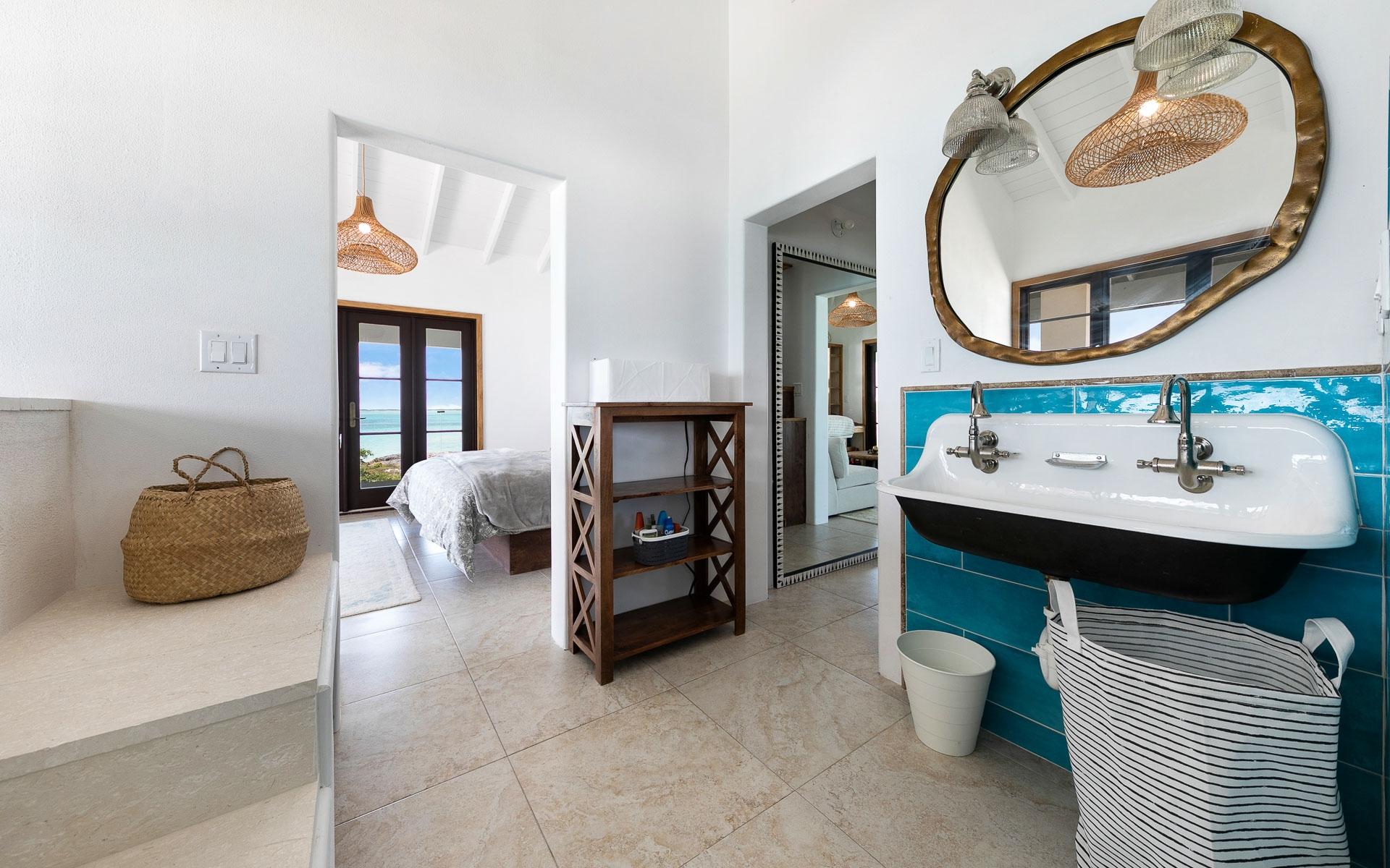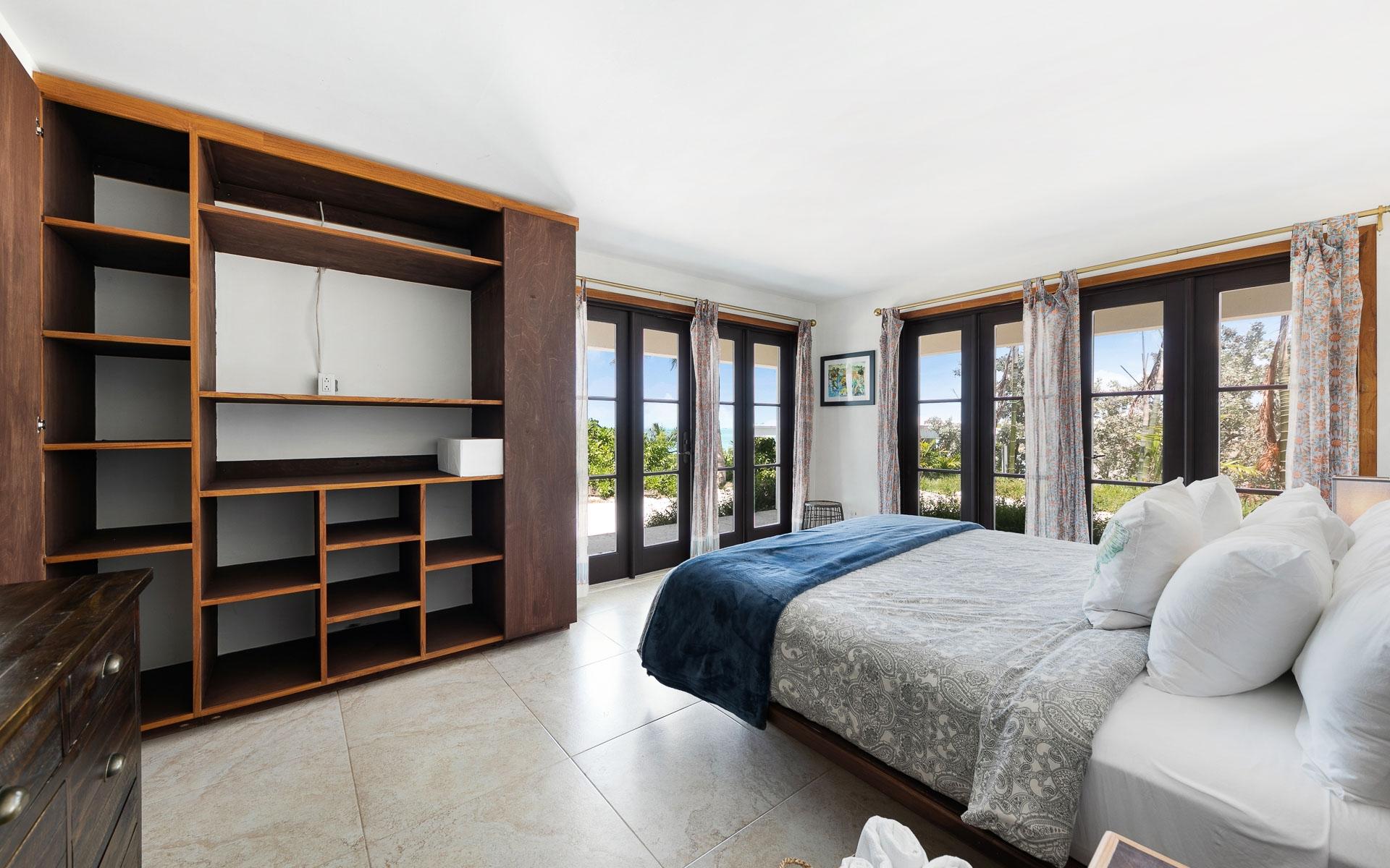 Set on the largest available acreage parcel on Staniel Cay, Narikela is situated on 12.5 acres on the southern peninsula on Staniel Cay. The property is set on 15 individual lots on the Staniel Cay Subdivision, making future development of the property a breeze. The lots reach from the southern tip of Staniel Cay around a beautiful turquoise private harbour with a stunning coconut grove beach and two docks giving the estate a fully "private island" experience with all the benefits of being located on Staniel Cay. While there is immense value in all the readily developable land, the estate's existing spacious dwellings provide a comfortable haven for owners and guests with panoramic views of the nearby cays. The entire upper floor of the main villa features an extensive living area with a king bed, and an ensuite bath featuring both a shower and a tub that overlooks the ocean. The suite also features a private dining table and seating area, a full kitchen with appliances, and a large pantry. The upper floor has a wrap-around deck with glass walls and beautiful 360-degree views.