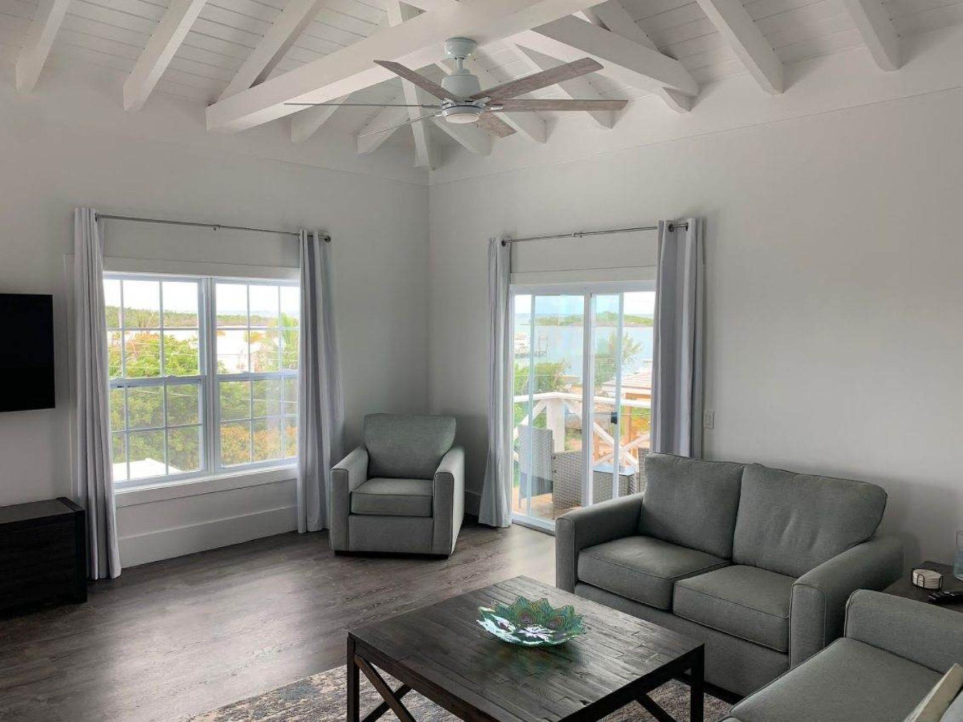 Off Course is a newly rebuilt 2,100 sq ft, 4-bedroom, 2-bath hillside home in the heart of Guana Cay settlement, offering beautiful views of the harbour and Fishers Bay anchorage. Just steps from the public dock, ferry landing, and Fishers Bay beach, the home enjoys a highly convenient location near town amenities and Atlantic beach access. Finished in a modern cottage style, the home features a stunning high custom ceiling in the living area with large sliding doors on each level leading to expansive decks and a trellised patio—ideal for outdoor living and entertaining. Impact doors and windows, high-efficiency air conditioning, and low-maintenance exterior finishes provide comfort, durability, and lower operating costs. Additional highlights include a 65,000-gallon freshwater cistern, an automated standby generator, a partially fenced backyard, and paved parking. An excellent full-time residence or popular income-producing property in a prime settlement location. Call for a chance to view Off Course today!