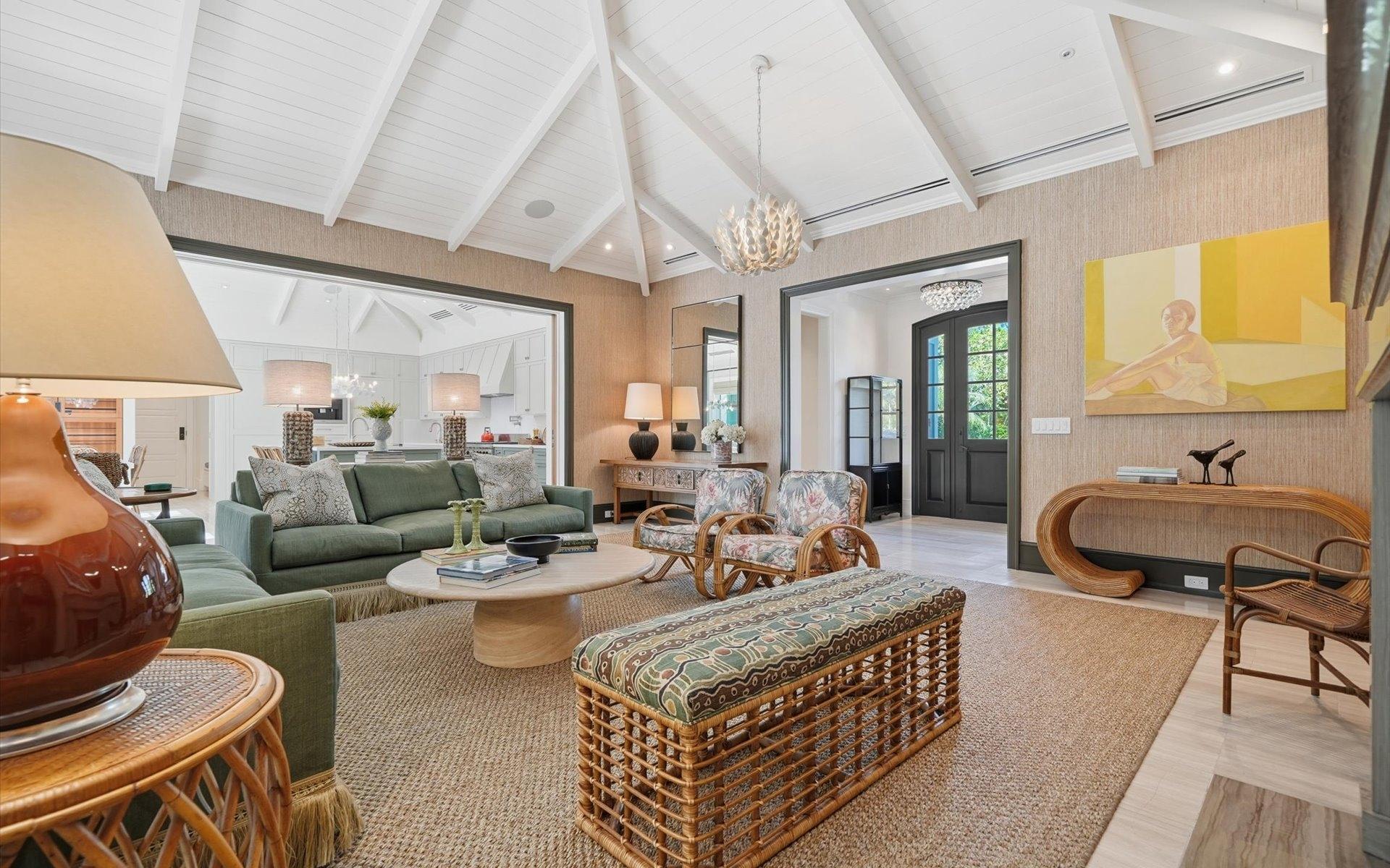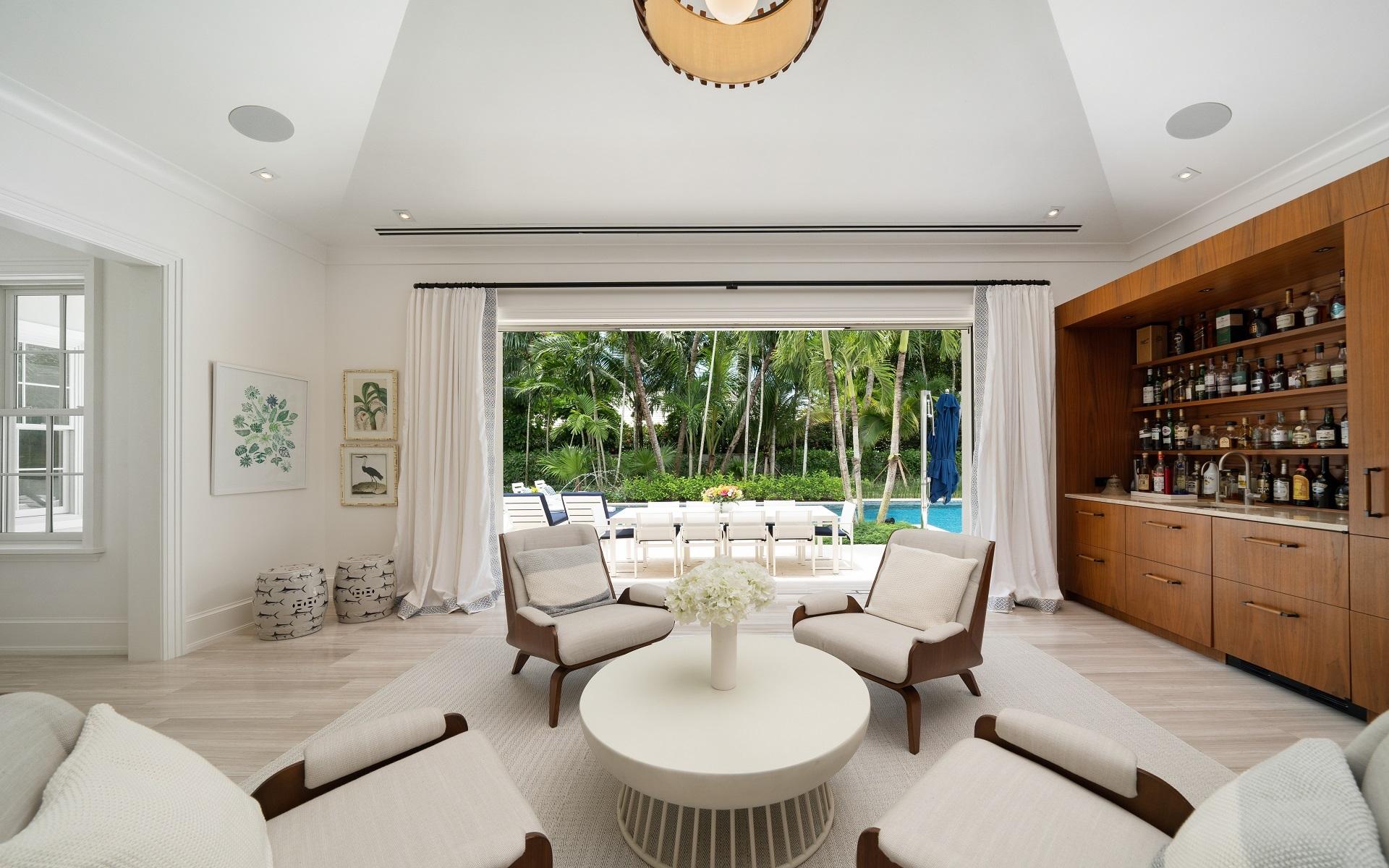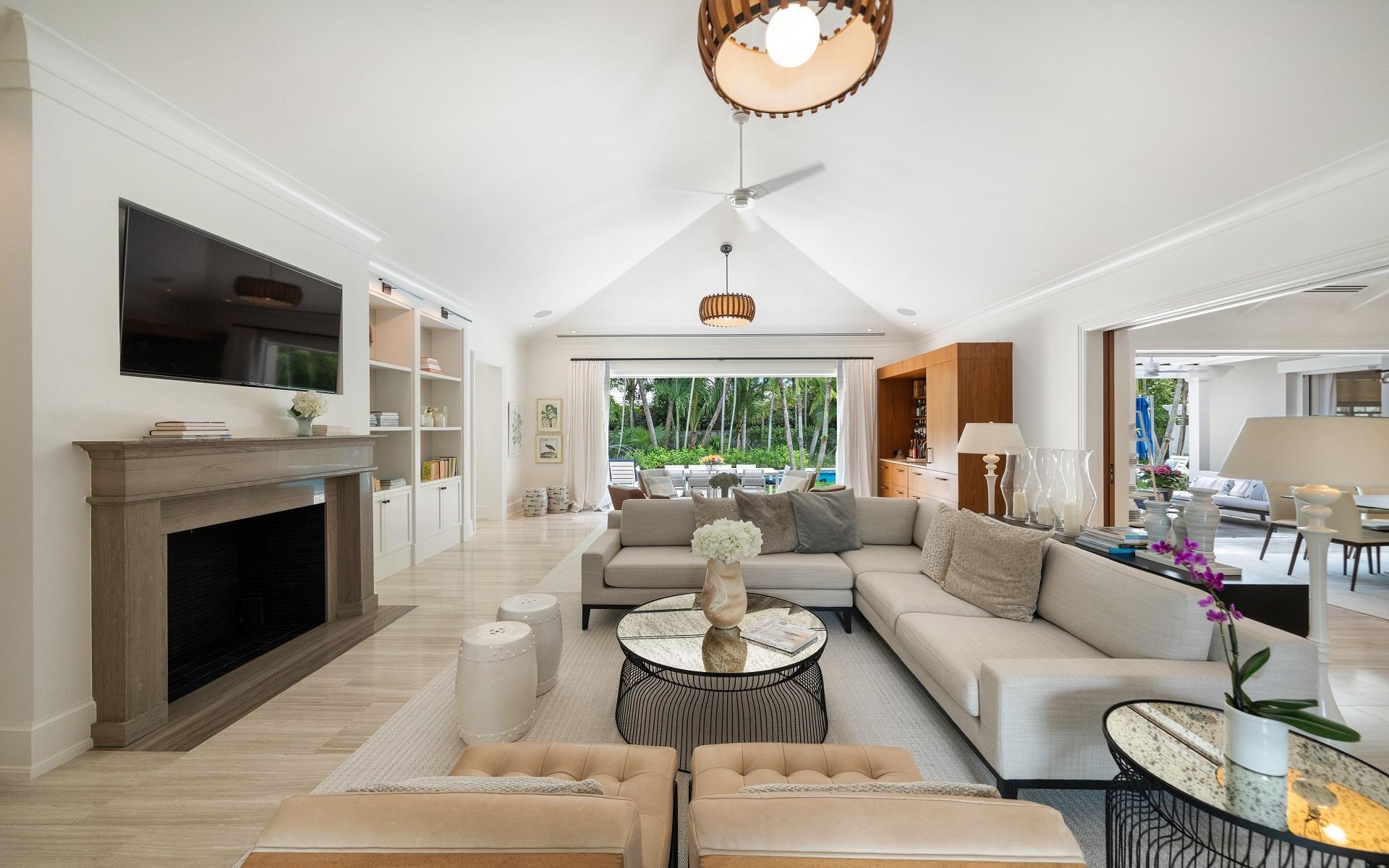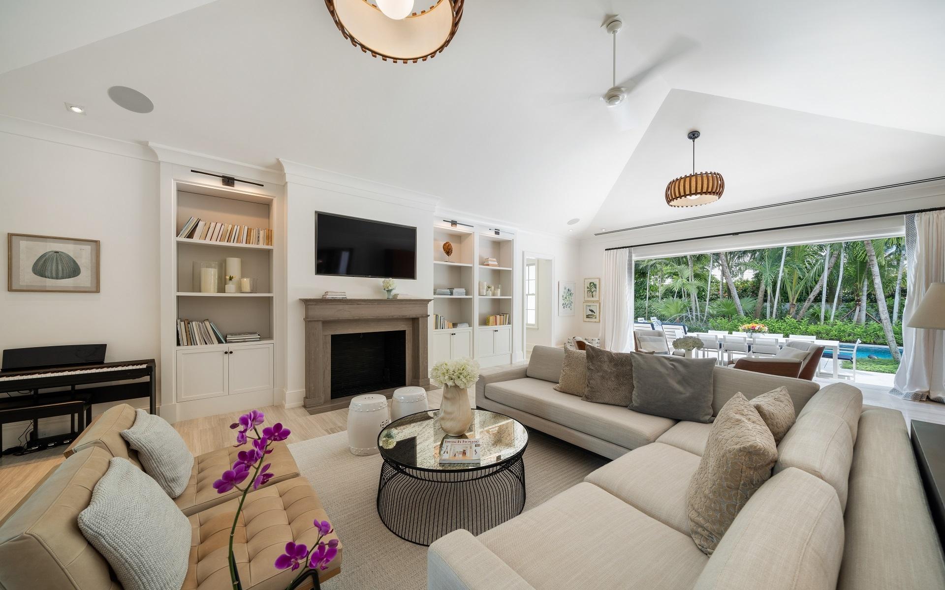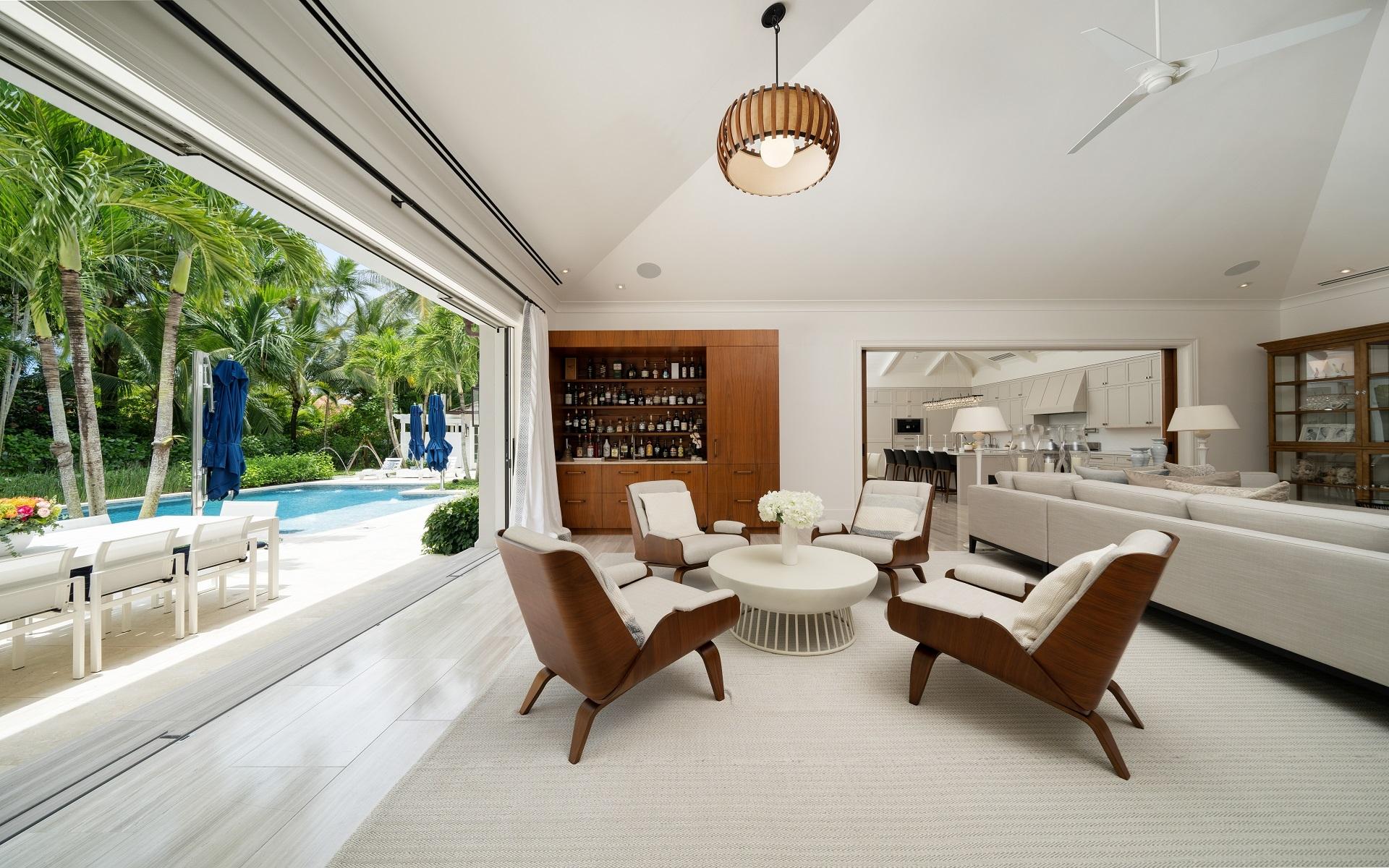 Carlea House is a beautifully renovated four-bedroom residence situated on Chelsea Place in the prestigious Lyford Cay community. The 5,214 sq ft home sits on 0.55 acres. Built by E.P Taylor and designed by John Volk, it was home to the original manager of the Lyford Cay Club. Although the home underwent a complete modern, custom renovation in 2019, the original front wall façade and the classic Lyford Cay rooflines preserve the charm. Then in 2024, it was reimagined in the eyes of international architectural and interior design firm Noorani Greiner who brought a warmth and comfort to a this contemporary island home. At the front of the house, one is greeted by six Hong Kong orchid trees, spaced along the street easement. Many of the palm trees were original to the property and preserved during construction, then replanted to maximize the new layout. The mature and extensive landscaping includes the original rubber trees flanking the east and west boundary and over 100 palm trees providing an oasis of privacy in the rear of the property and a sense of belonging from the street.