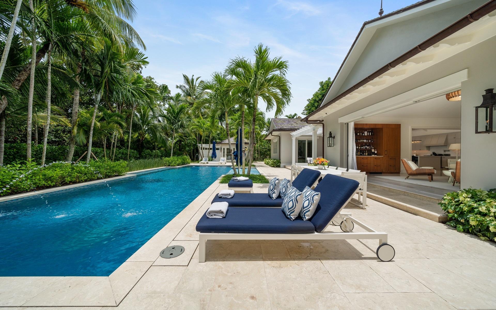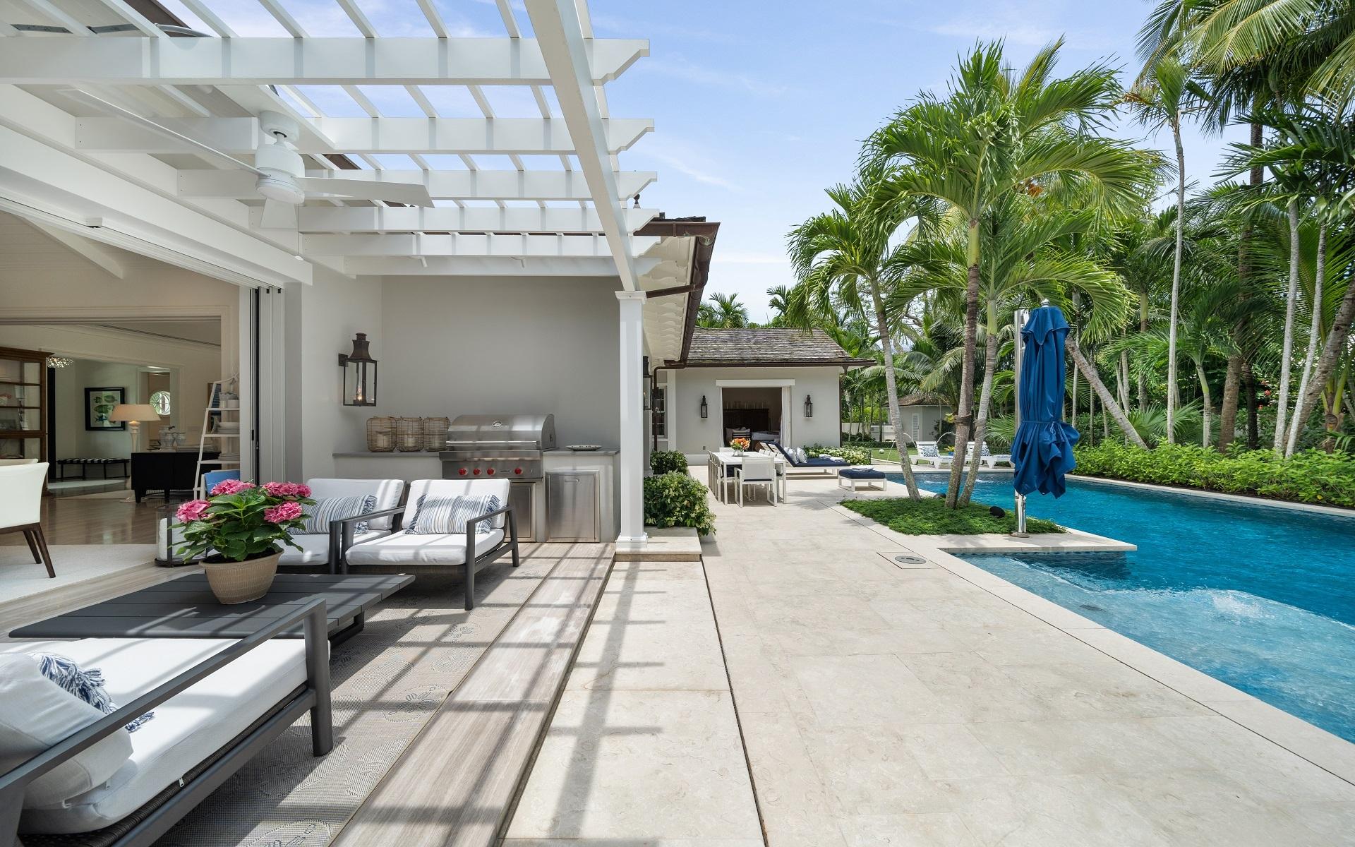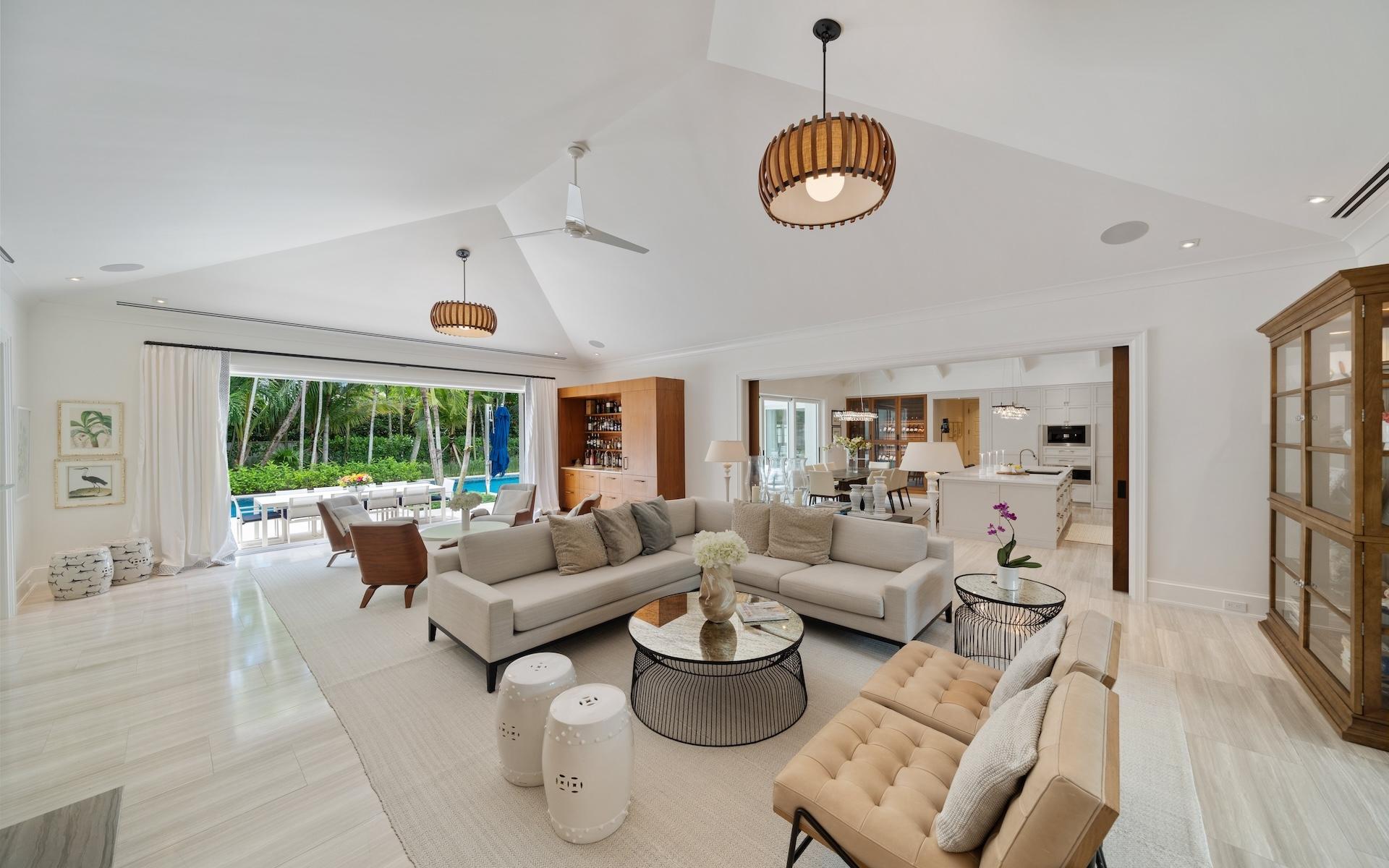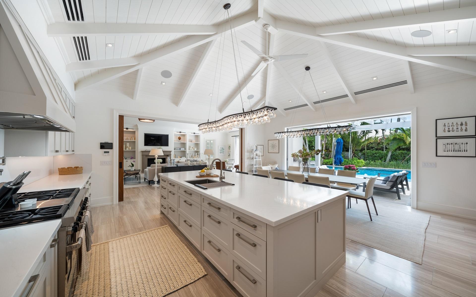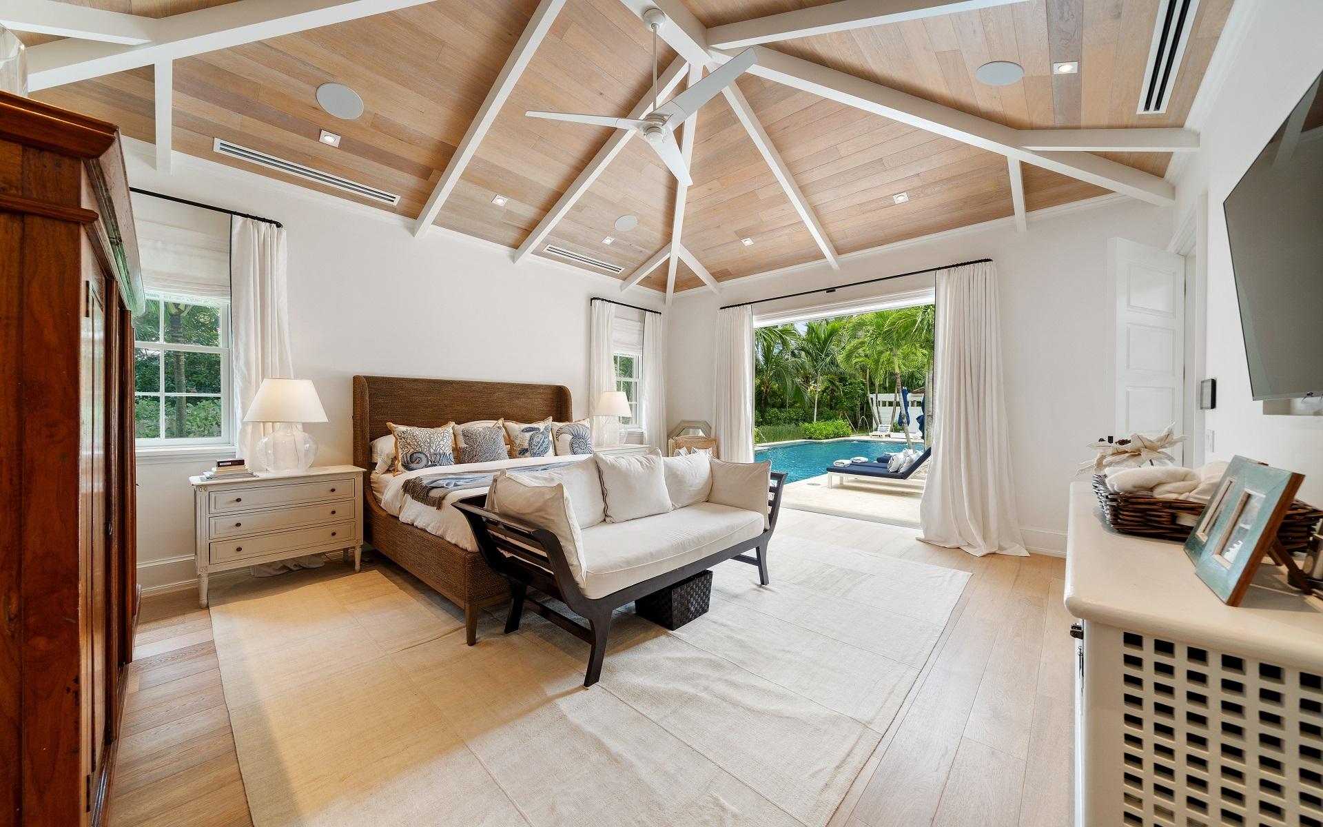 Carlea House is a beautifully renovated four-bedroom residence situated on Chelsea Place in the prestigious Lyford Cay community. The 5,214 sq ft home sits on 0.55 acres. Built by E.P Taylor and designed by John Volk, it was home to the original manager of the Lyford Cay Club. Although the home underwent a complete modern, custom renovation in 2019, the original front wall façade and the classic Lyford Cay rooflines preserve the charm. Then in 2024, it was reimagined in the eyes of international architectural and interior design firm Noorani Greiner who brought a warmth and comfort to a this contemporary island home. At the front of the house, one is greeted by six Hong Kong orchid trees, spaced along the street easement. Many of the palm trees were original to the property and preserved during construction, then replanted to maximize the new layout. The mature and extensive landscaping includes the original rubber trees flanking the east and west boundary and over 100 palm trees providing an oasis of privacy in the rear of the property and a sense of belonging from the street.