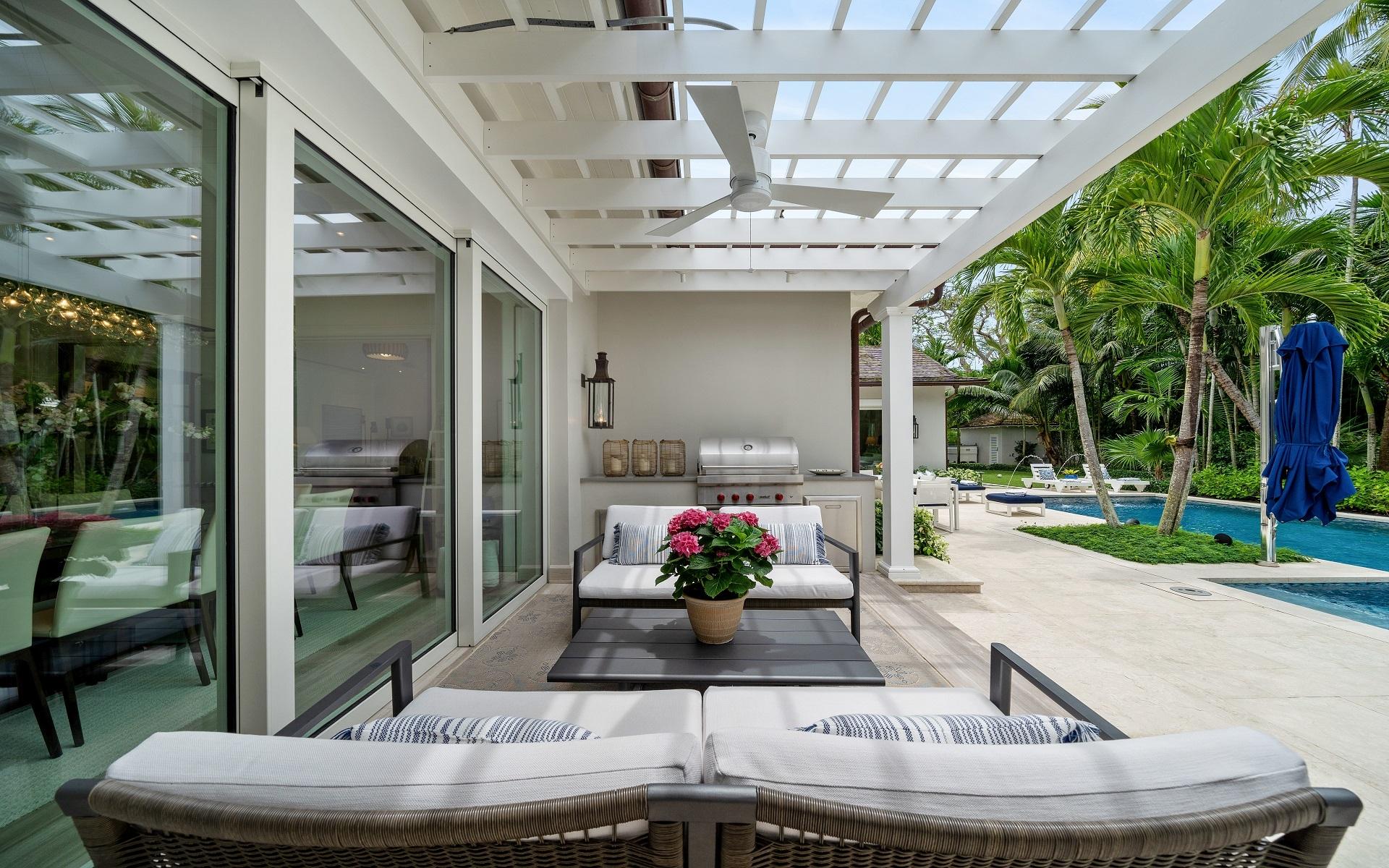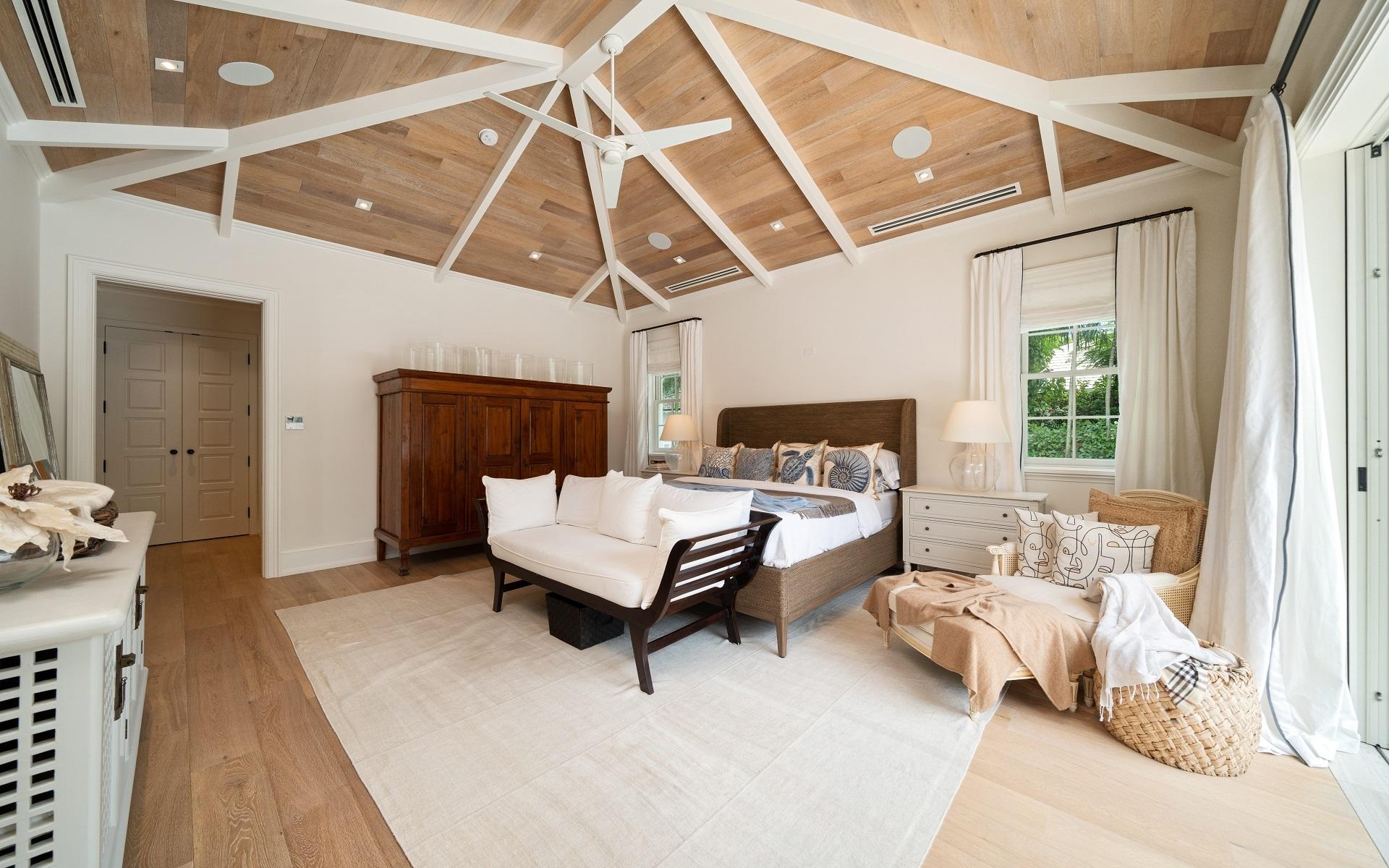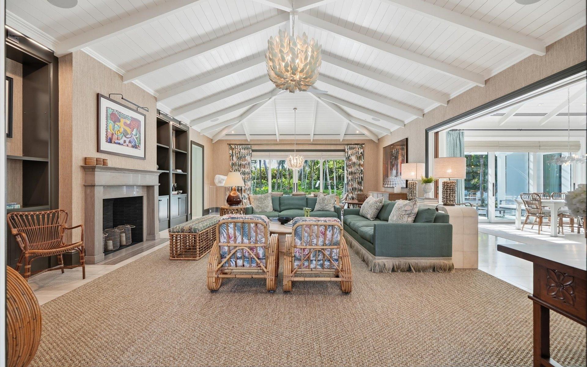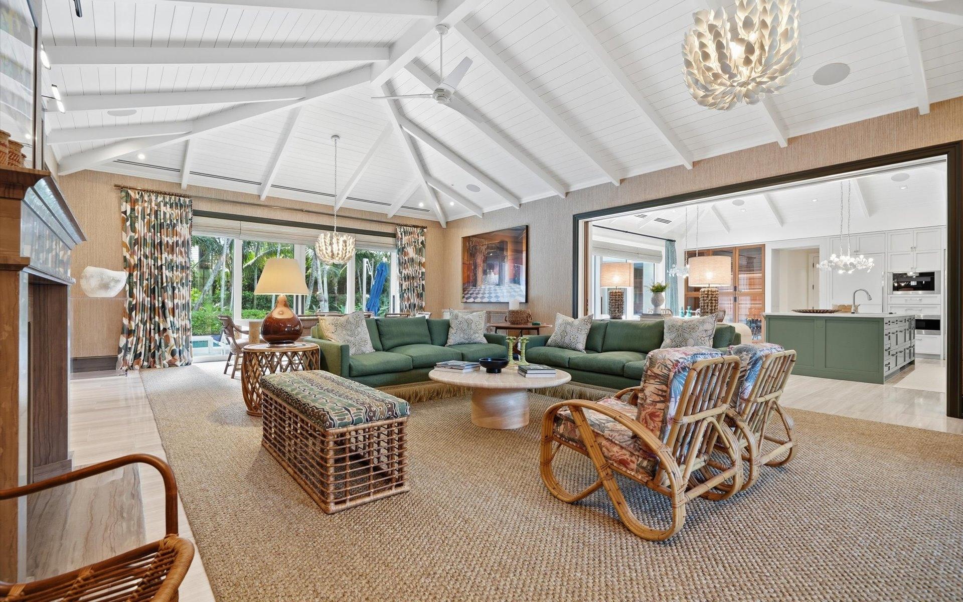 Carlea House is a beautifully renovated four-bedroom residence situated on Chelsea Place in the prestigious Lyford Cay community. The 5,214 sq ft home sits on 0.55 acres. Built by E.P Taylor and designed by John Volk, it was home to the original manager of the Lyford Cay Club. Although the home underwent a complete modern, custom renovation in 2019, the original front wall façade and the classic Lyford Cay rooflines preserve the charm. Then in 2024, it was reimagined in the eyes of international architectural and interior design firm Noorani Greiner who brought a warmth and comfort to a this contemporary island home. At the front of the house, one is greeted by six Hong Kong orchid trees, spaced along the street easement. Many of the palm trees were original to the property and preserved during construction, then replanted to maximize the new layout. The mature and extensive landscaping includes the original rubber trees flanking the east and west boundary and over 100 palm trees providing an oasis of privacy in the rear of the property and a sense of belonging from the street.