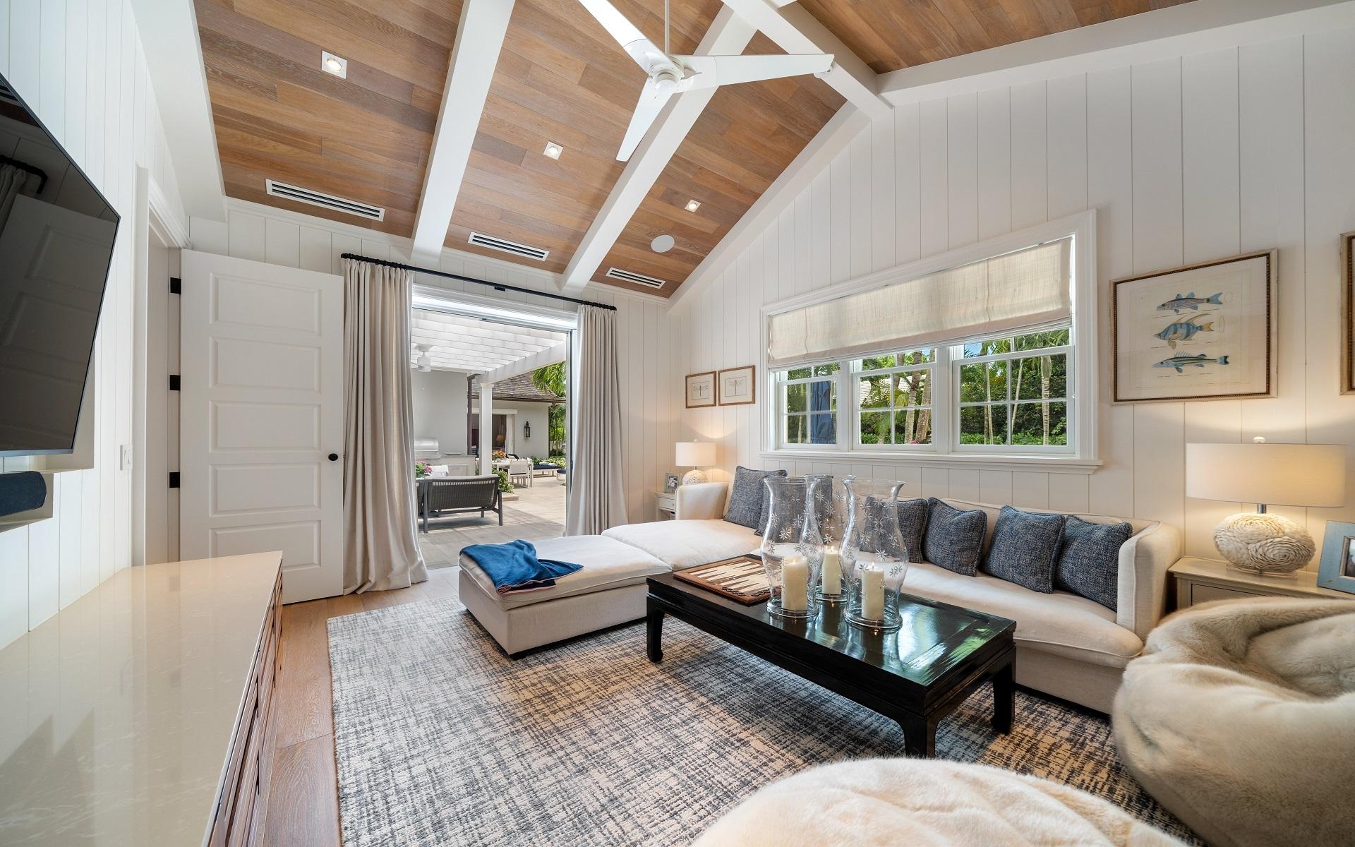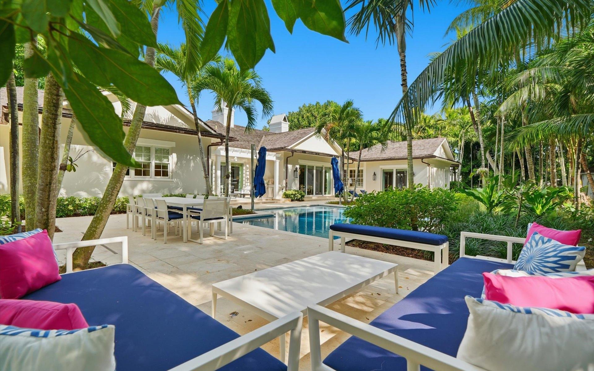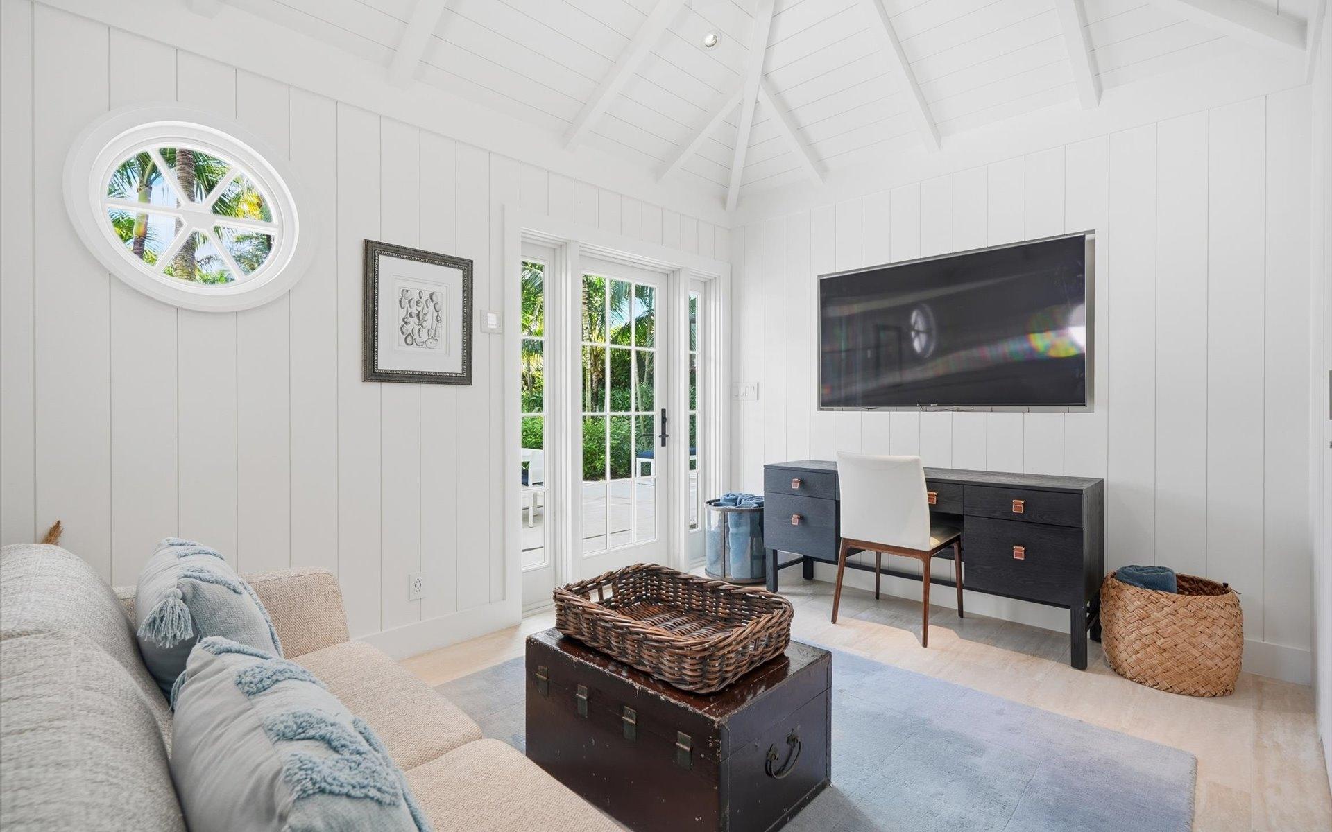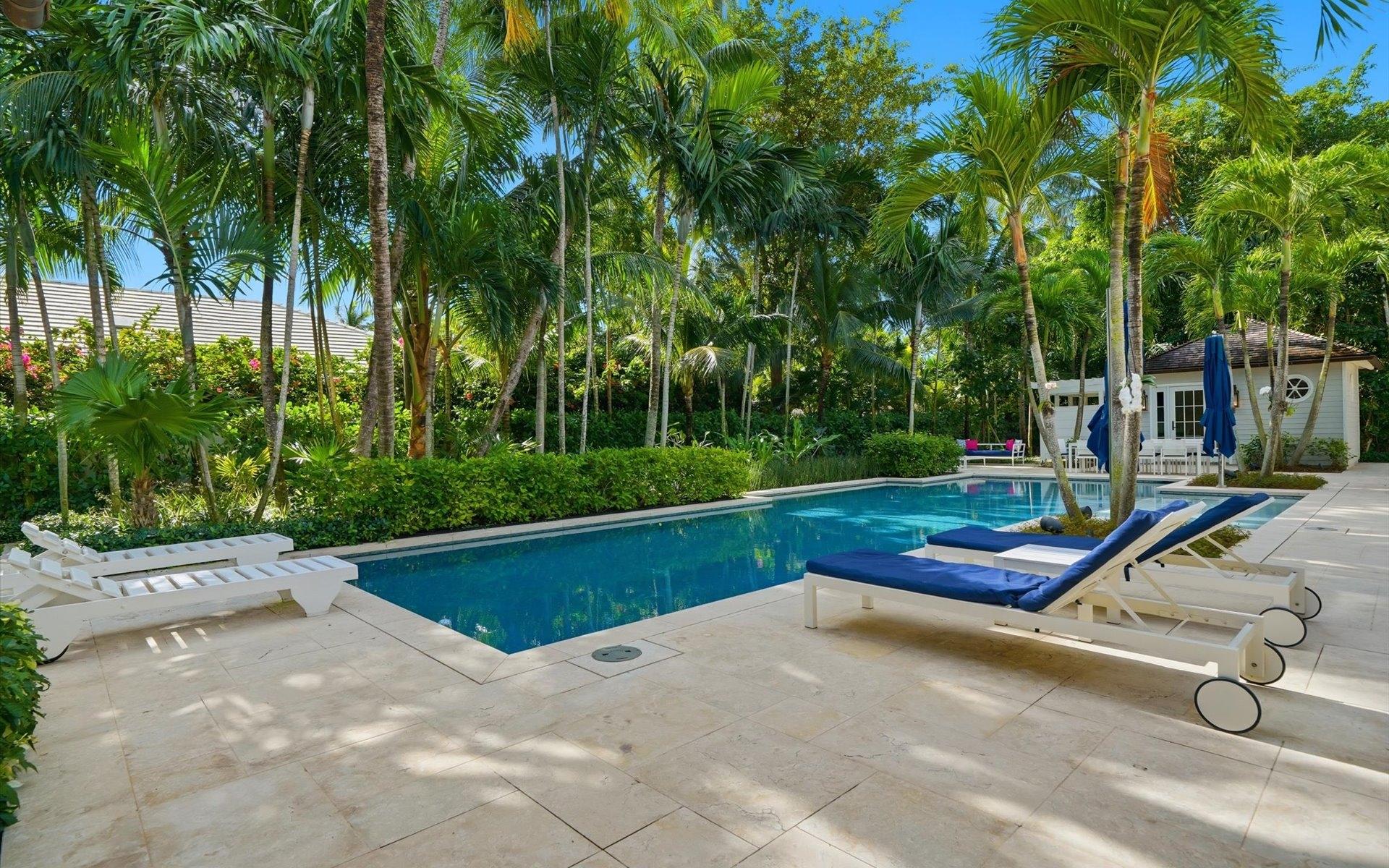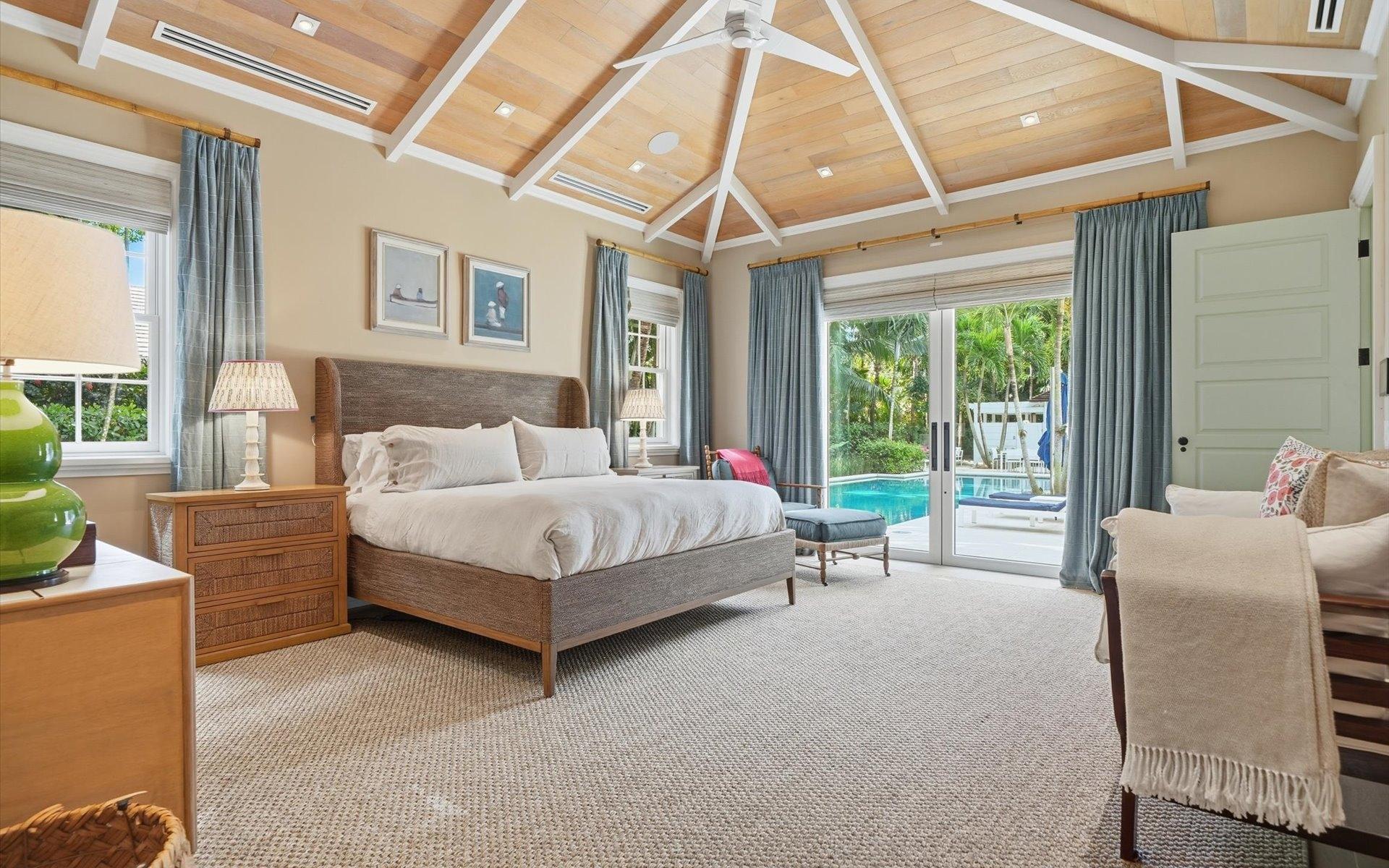 Carlea House is a beautifully renovated four-bedroom residence situated on Chelsea Place in the prestigious Lyford Cay community. The 5,214 sq ft home sits on 0.55 acres. Built by E.P Taylor and designed by John Volk, it was home to the original manager of the Lyford Cay Club. Although the home underwent a complete modern, custom renovation in 2019, the original front wall façade and the classic Lyford Cay rooflines preserve the charm. Then in 2024, it was reimagined in the eyes of international architectural and interior design firm Noorani Greiner who brought a warmth and comfort to a this contemporary island home. At the front of the house, one is greeted by six Hong Kong orchid trees, spaced along the street easement. Many of the palm trees were original to the property and preserved during construction, then replanted to maximize the new layout. The mature and extensive landscaping includes the original rubber trees flanking the east and west boundary and over 100 palm trees providing an oasis of privacy in the rear of the property and a sense of belonging from the street.