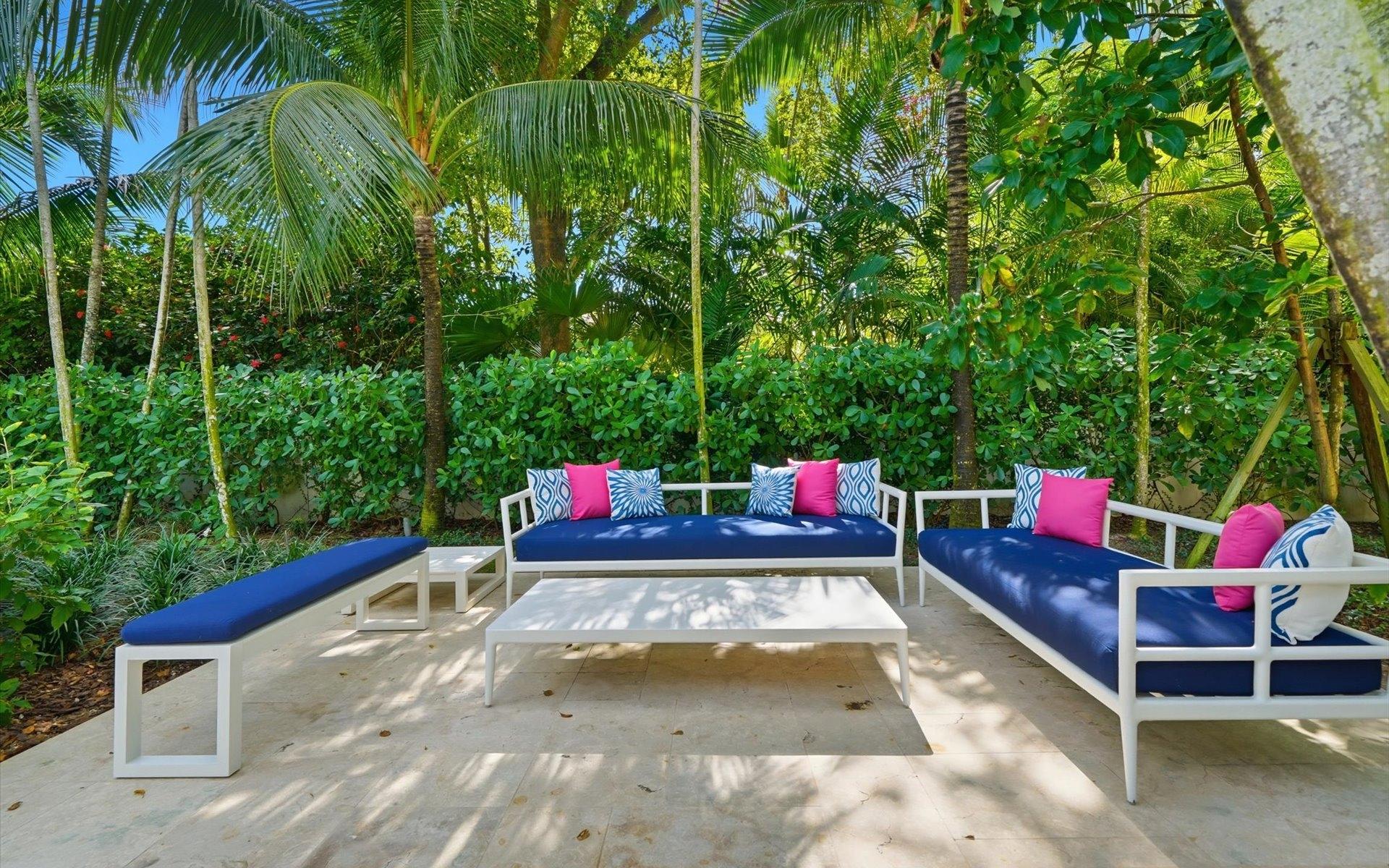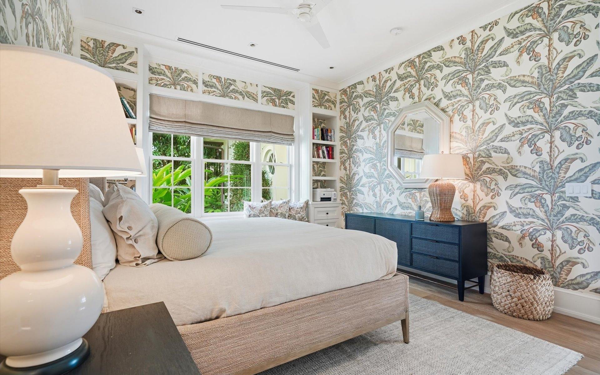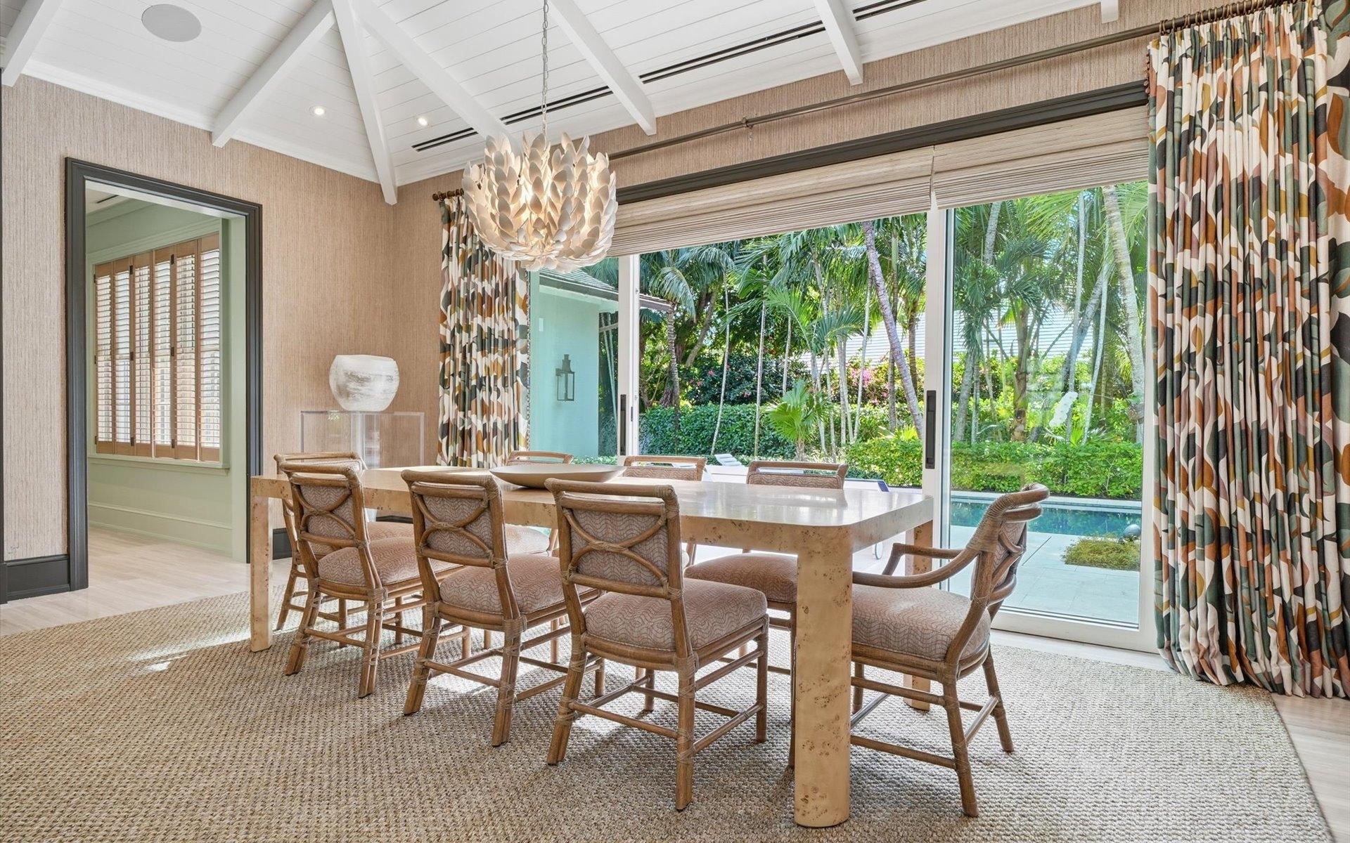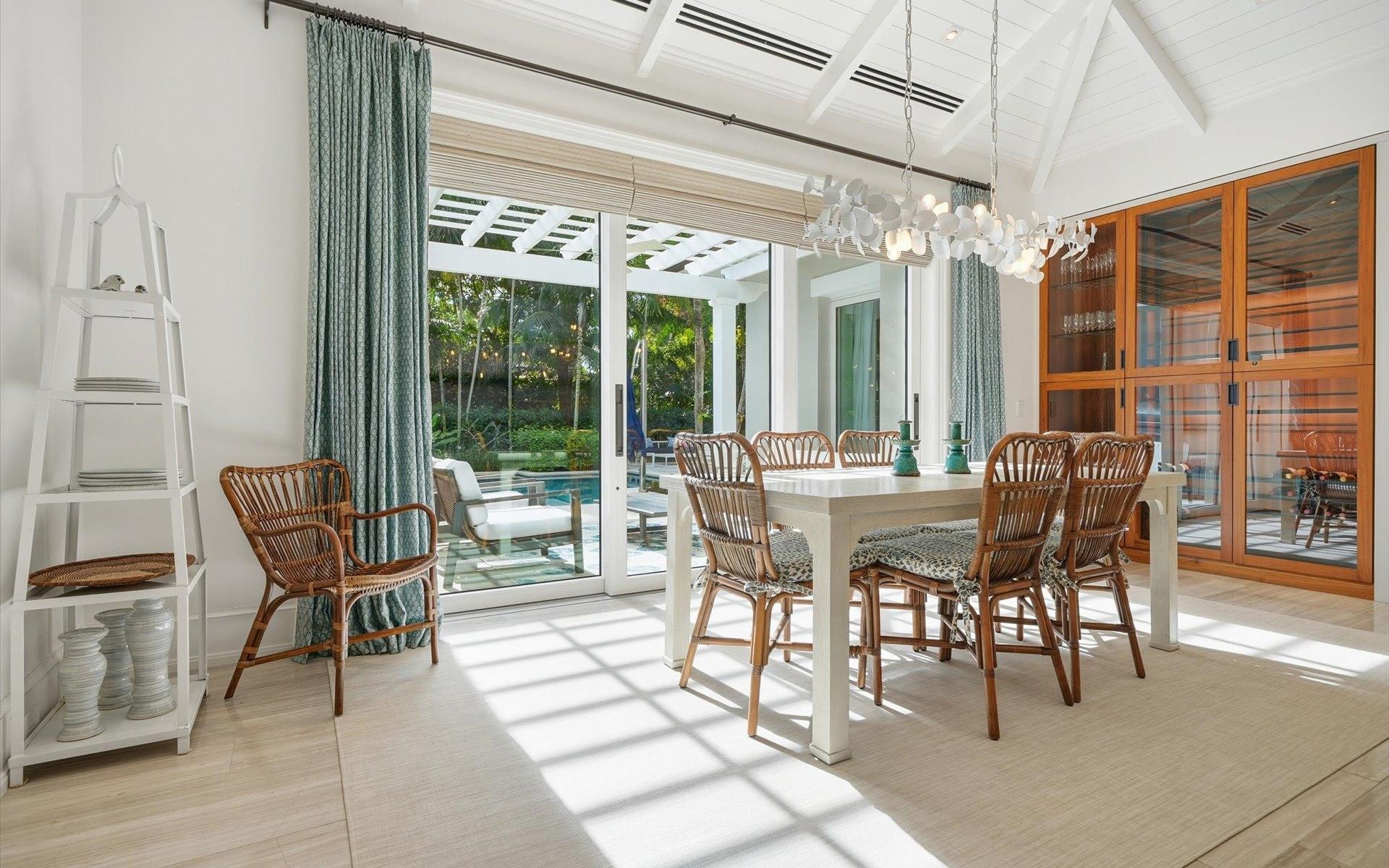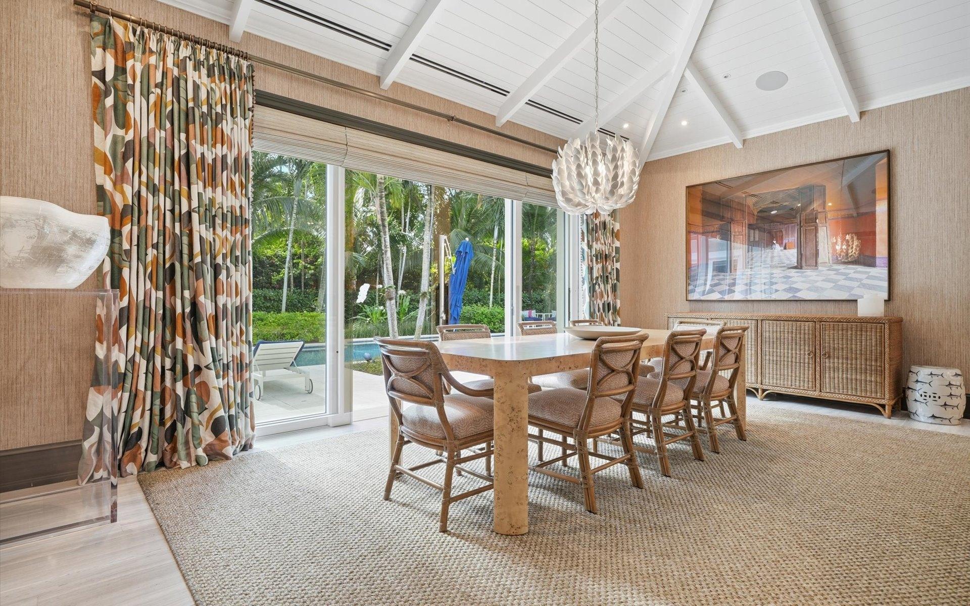 Carlea House is a beautifully renovated four-bedroom residence situated on Chelsea Place in the prestigious Lyford Cay community. The 5,214 sq ft home sits on 0.55 acres. Built by E.P Taylor and designed by John Volk, it was home to the original manager of the Lyford Cay Club. Although the home underwent a complete modern, custom renovation in 2019, the original front wall façade and the classic Lyford Cay rooflines preserve the charm. Then in 2024, it was reimagined in the eyes of international architectural and interior design firm Noorani Greiner who brought a warmth and comfort to a this contemporary island home. At the front of the house, one is greeted by six Hong Kong orchid trees, spaced along the street easement. Many of the palm trees were original to the property and preserved during construction, then replanted to maximize the new layout. The mature and extensive landscaping includes the original rubber trees flanking the east and west boundary and over 100 palm trees providing an oasis of privacy in the rear of the property and a sense of belonging from the street.