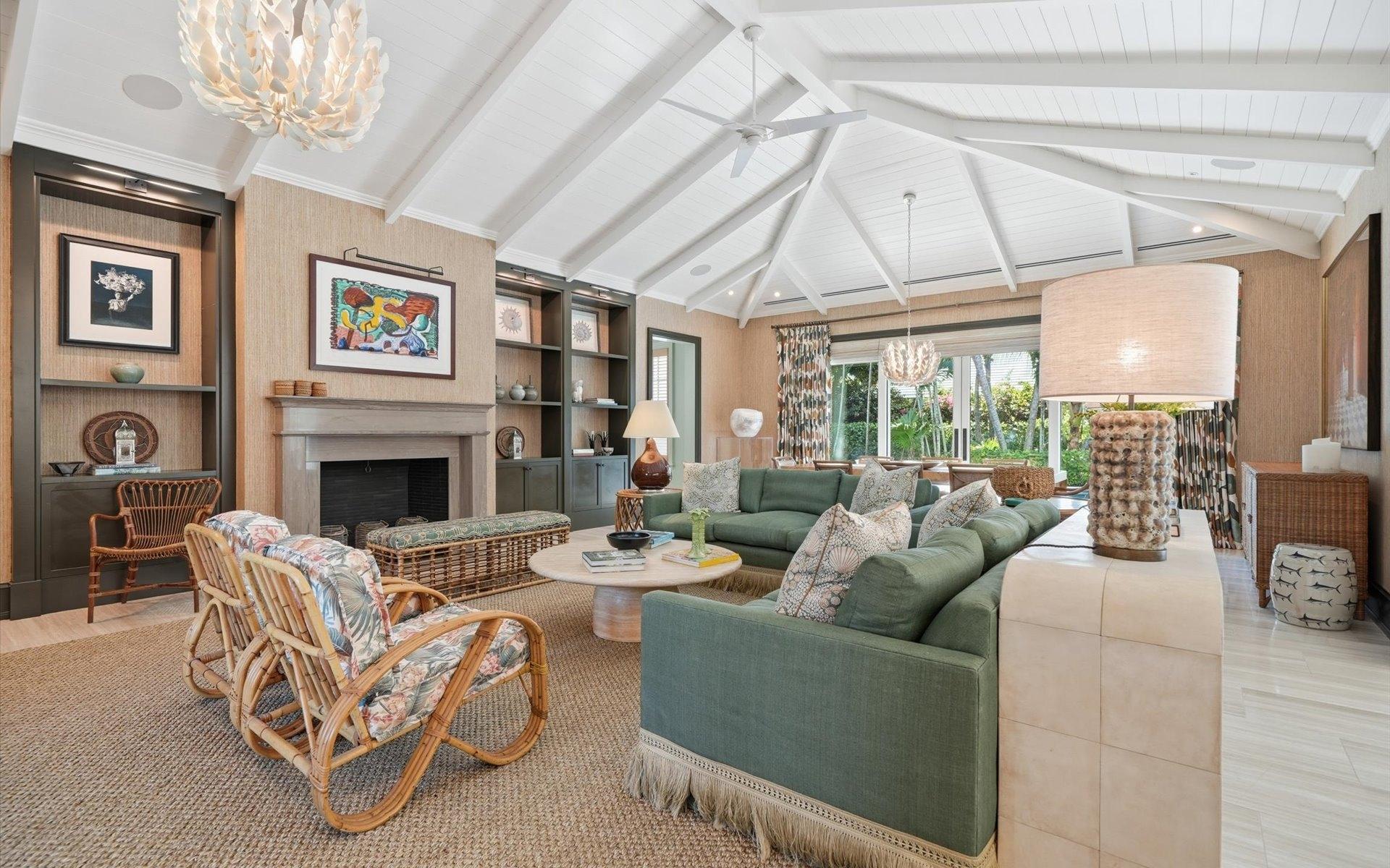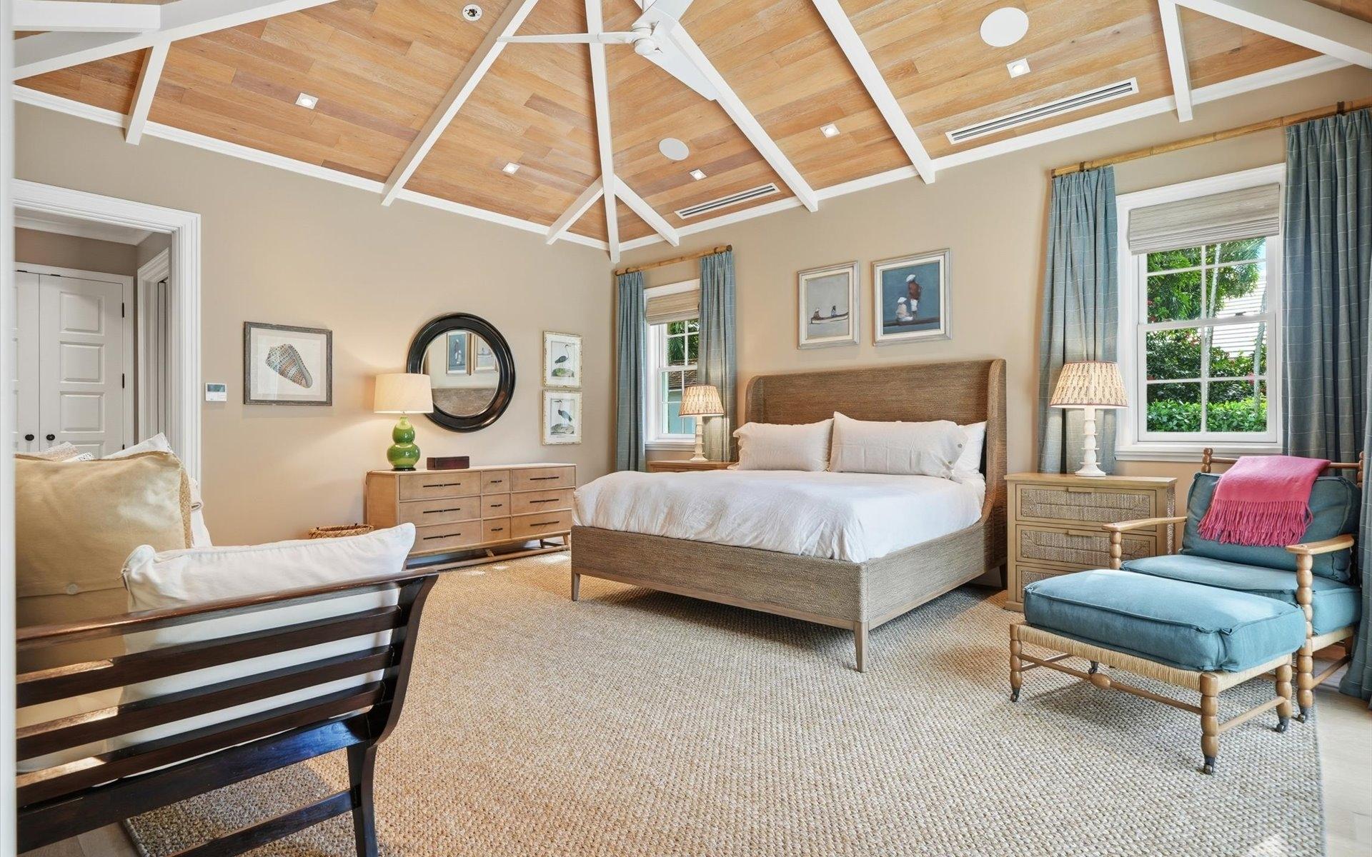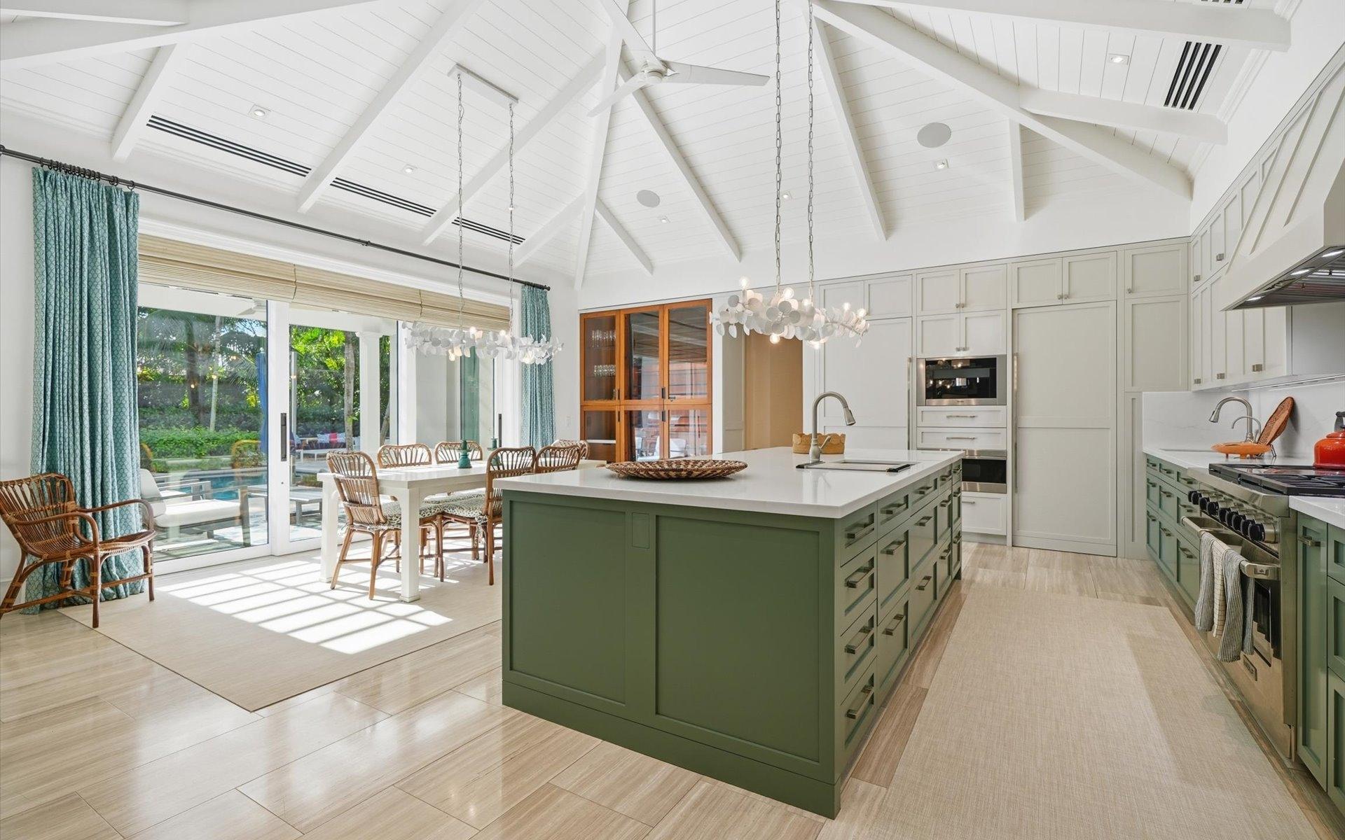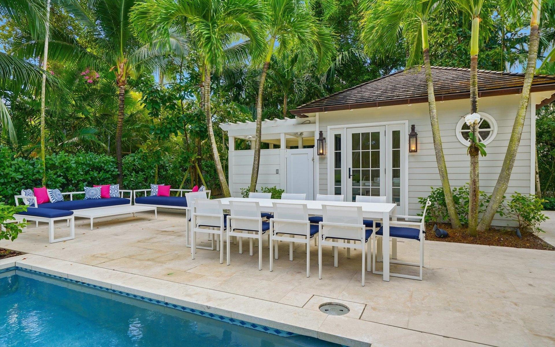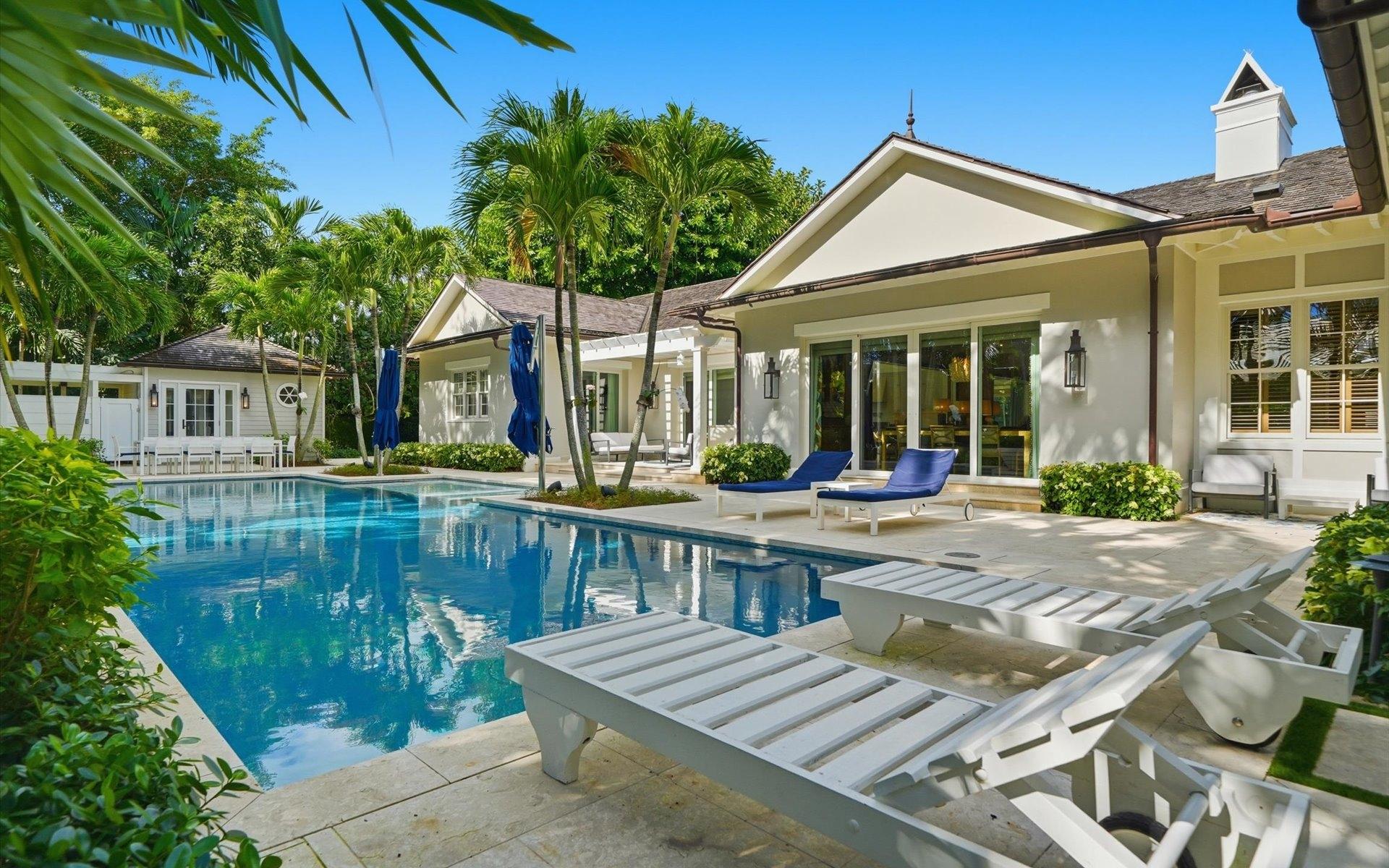 Carlea House is a beautifully renovated four-bedroom residence situated on Chelsea Place in the prestigious Lyford Cay community. The 5,214 sq ft home sits on 0.55 acres. Built by E.P Taylor and designed by John Volk, it was home to the original manager of the Lyford Cay Club. Although the home underwent a complete modern, custom renovation in 2019, the original front wall façade and the classic Lyford Cay rooflines preserve the charm. Then in 2024, it was reimagined in the eyes of international architectural and interior design firm Noorani Greiner who brought a warmth and comfort to a this contemporary island home. At the front of the house, one is greeted by six Hong Kong orchid trees, spaced along the street easement. Many of the palm trees were original to the property and preserved during construction, then replanted to maximize the new layout. The mature and extensive landscaping includes the original rubber trees flanking the east and west boundary and over 100 palm trees providing an oasis of privacy in the rear of the property and a sense of belonging from the street.