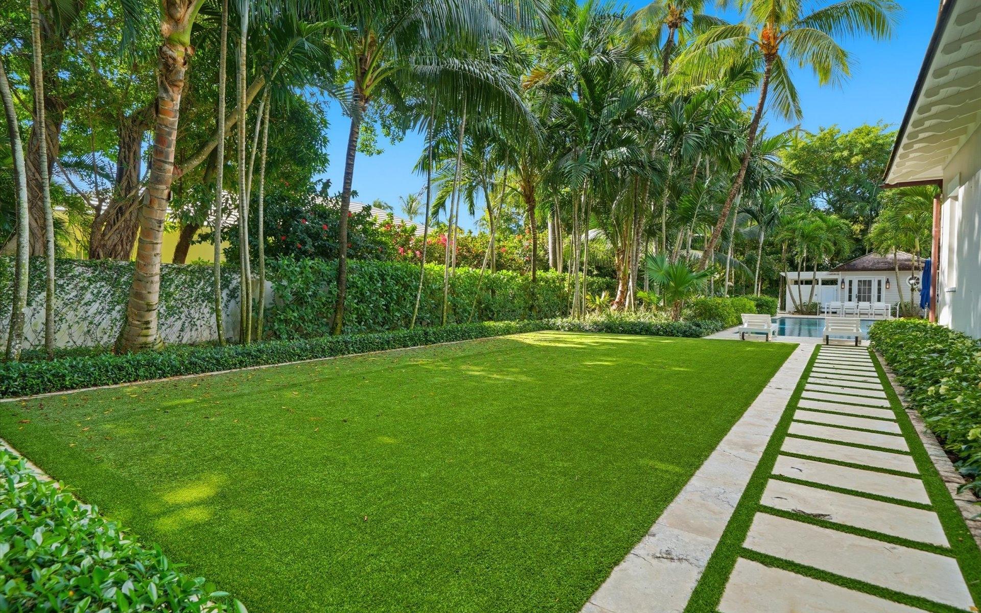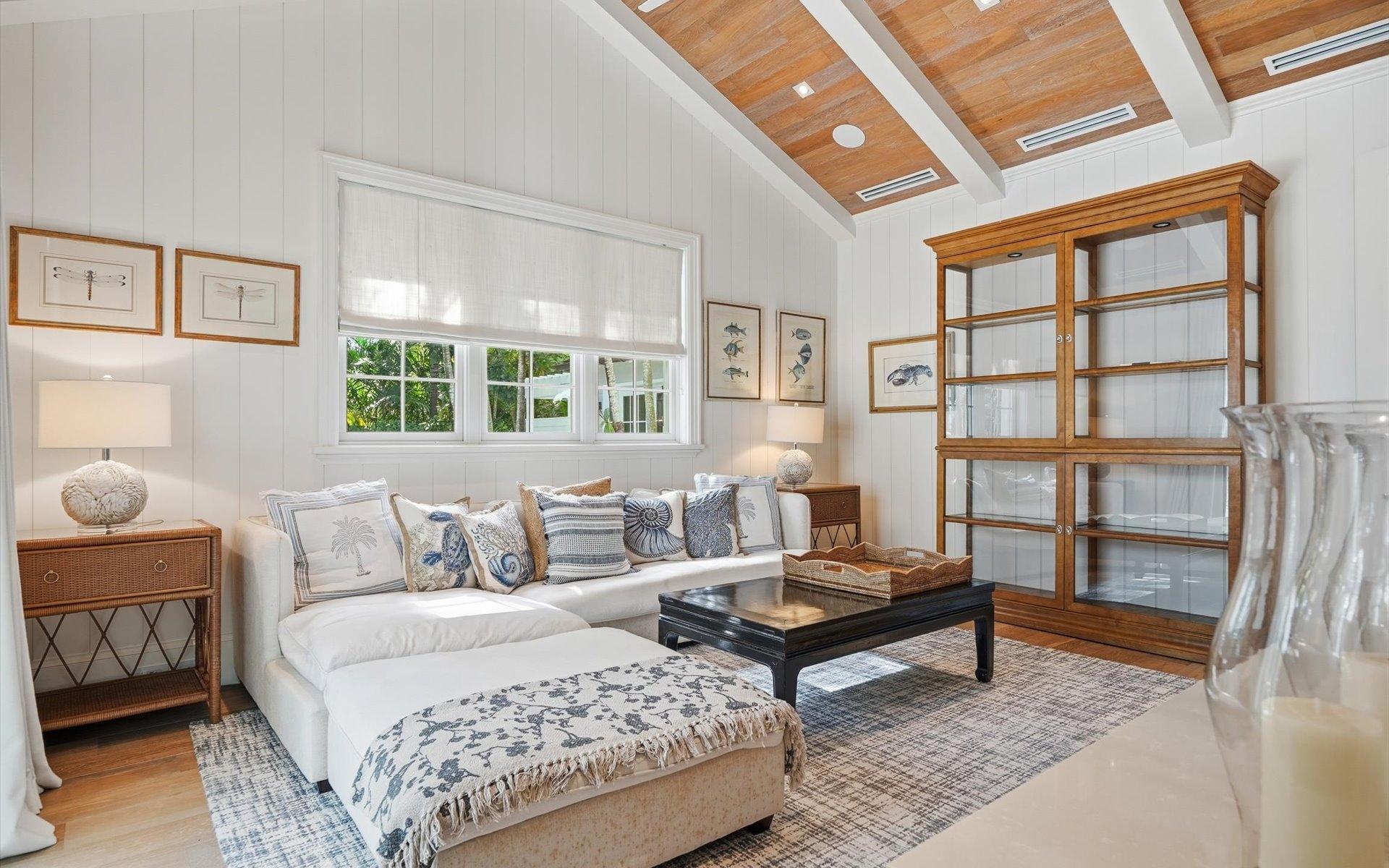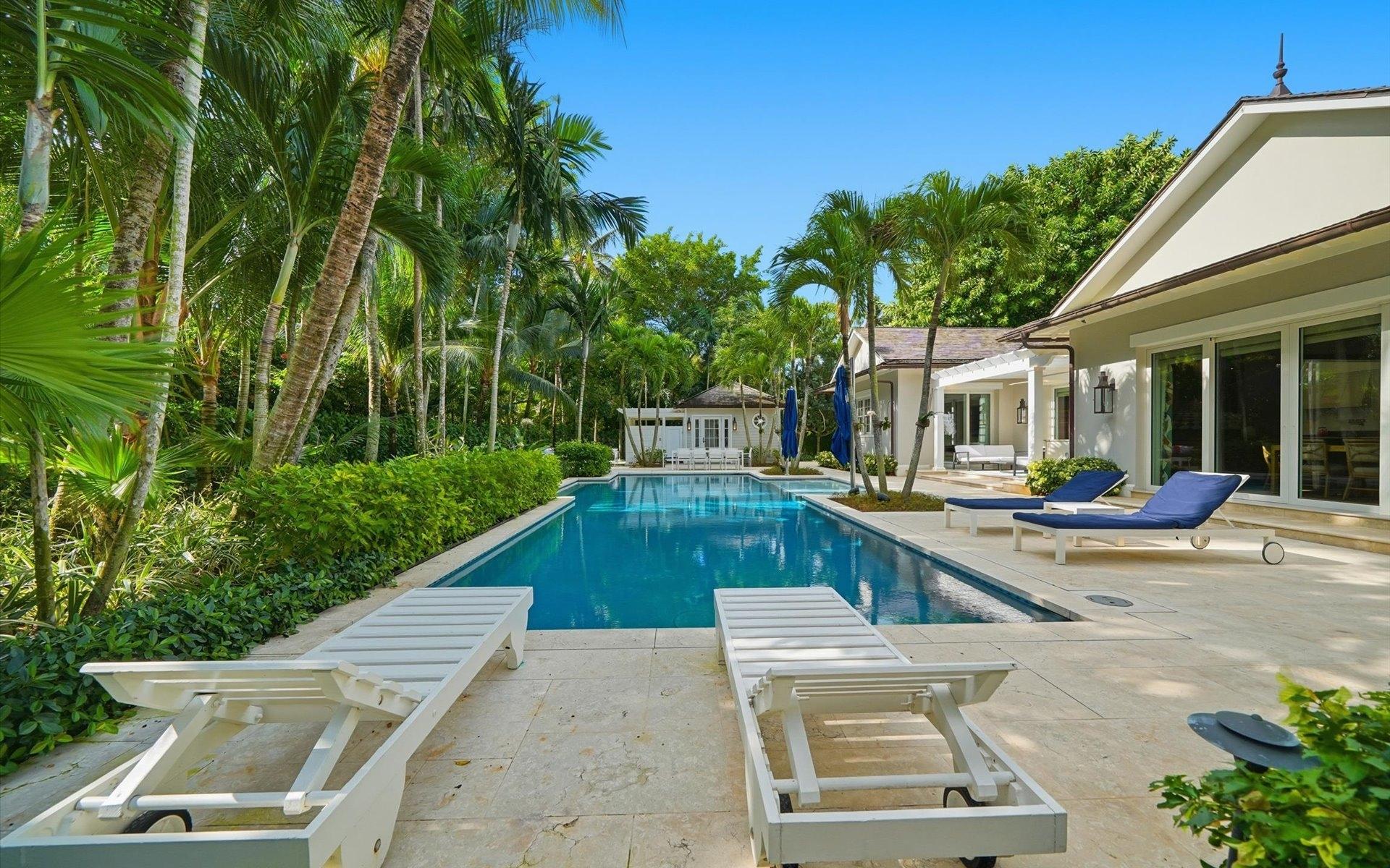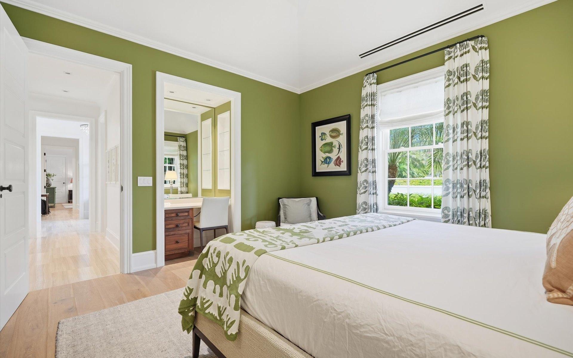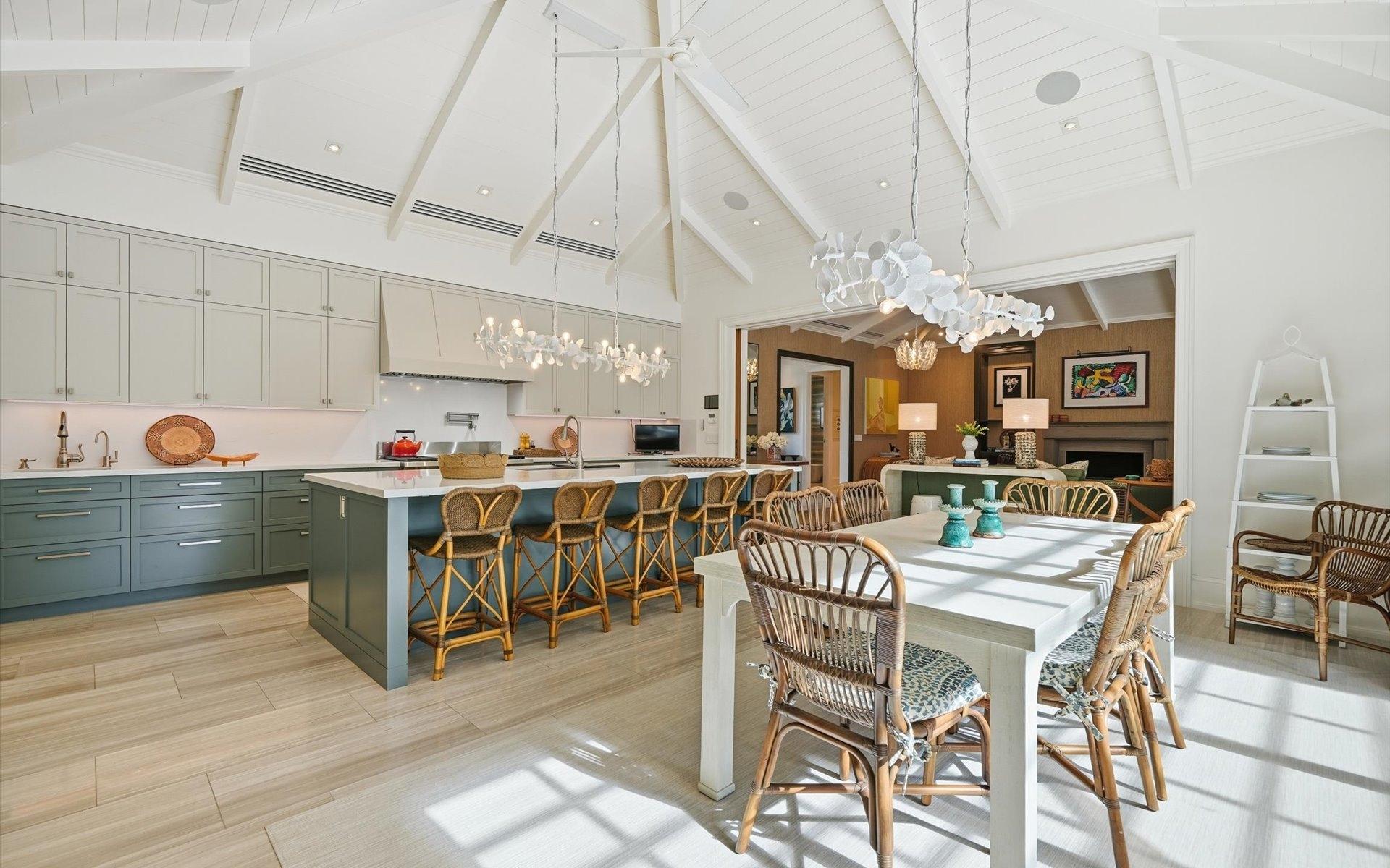 Carlea House is a beautifully renovated four-bedroom residence situated on Chelsea Place in the prestigious Lyford Cay community. The 5,214 sq ft home sits on 0.55 acres. Built by E.P Taylor and designed by John Volk, it was home to the original manager of the Lyford Cay Club. Although the home underwent a complete modern, custom renovation in 2019, the original front wall façade and the classic Lyford Cay rooflines preserve the charm. Then in 2024, it was reimagined in the eyes of international architectural and interior design firm Noorani Greiner who brought a warmth and comfort to a this contemporary island home. At the front of the house, one is greeted by six Hong Kong orchid trees, spaced along the street easement. Many of the palm trees were original to the property and preserved during construction, then replanted to maximize the new layout. The mature and extensive landscaping includes the original rubber trees flanking the east and west boundary and over 100 palm trees providing an oasis of privacy in the rear of the property and a sense of belonging from the street.
