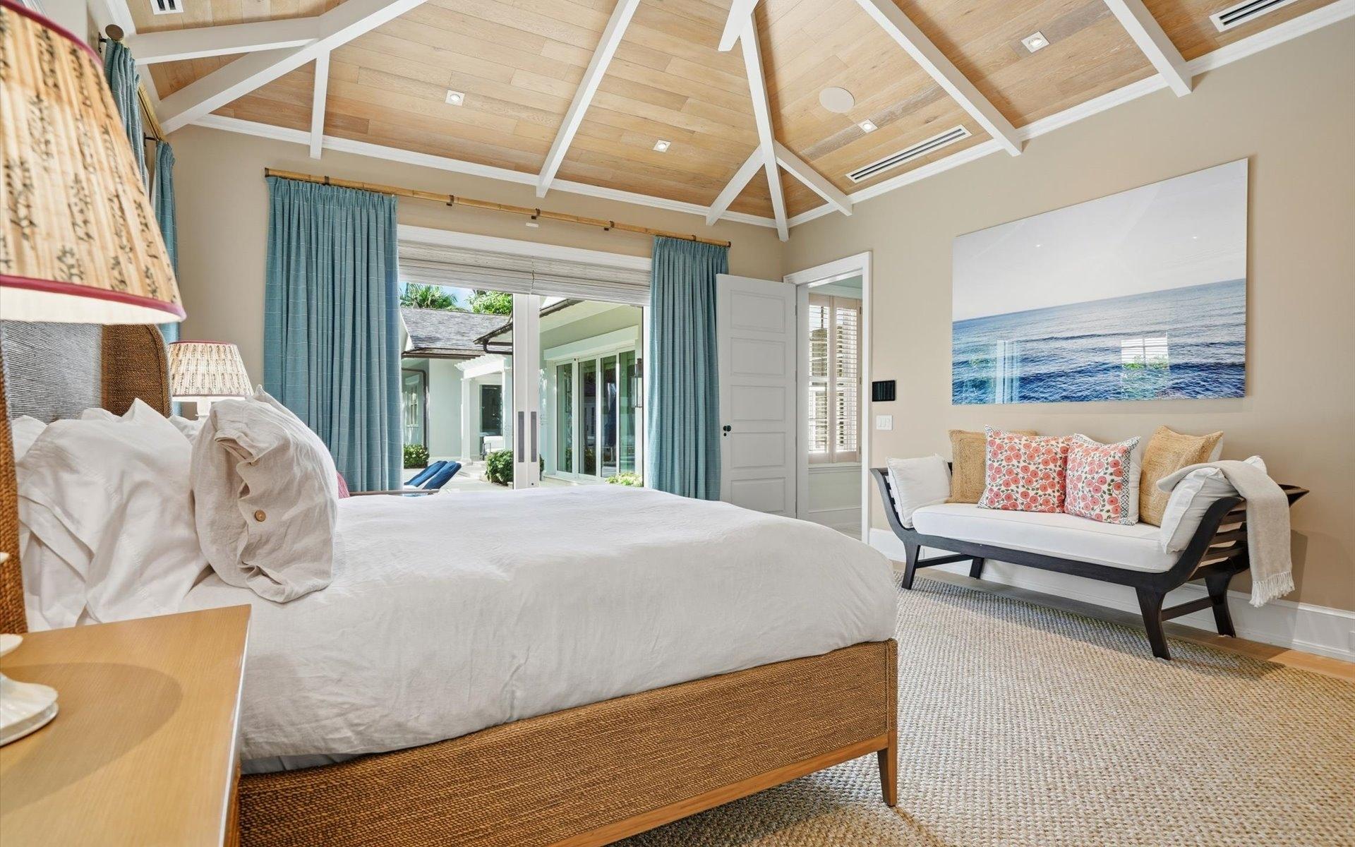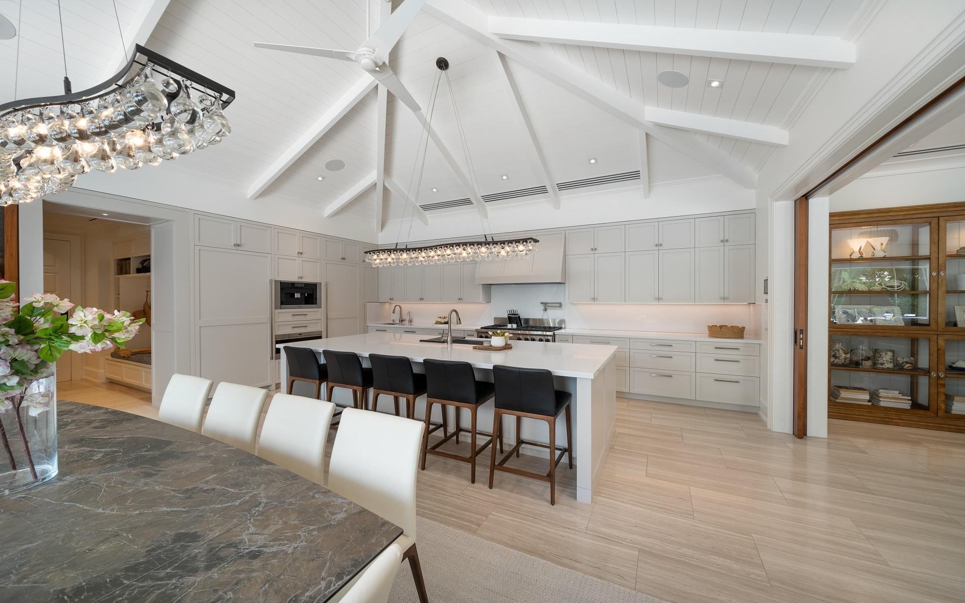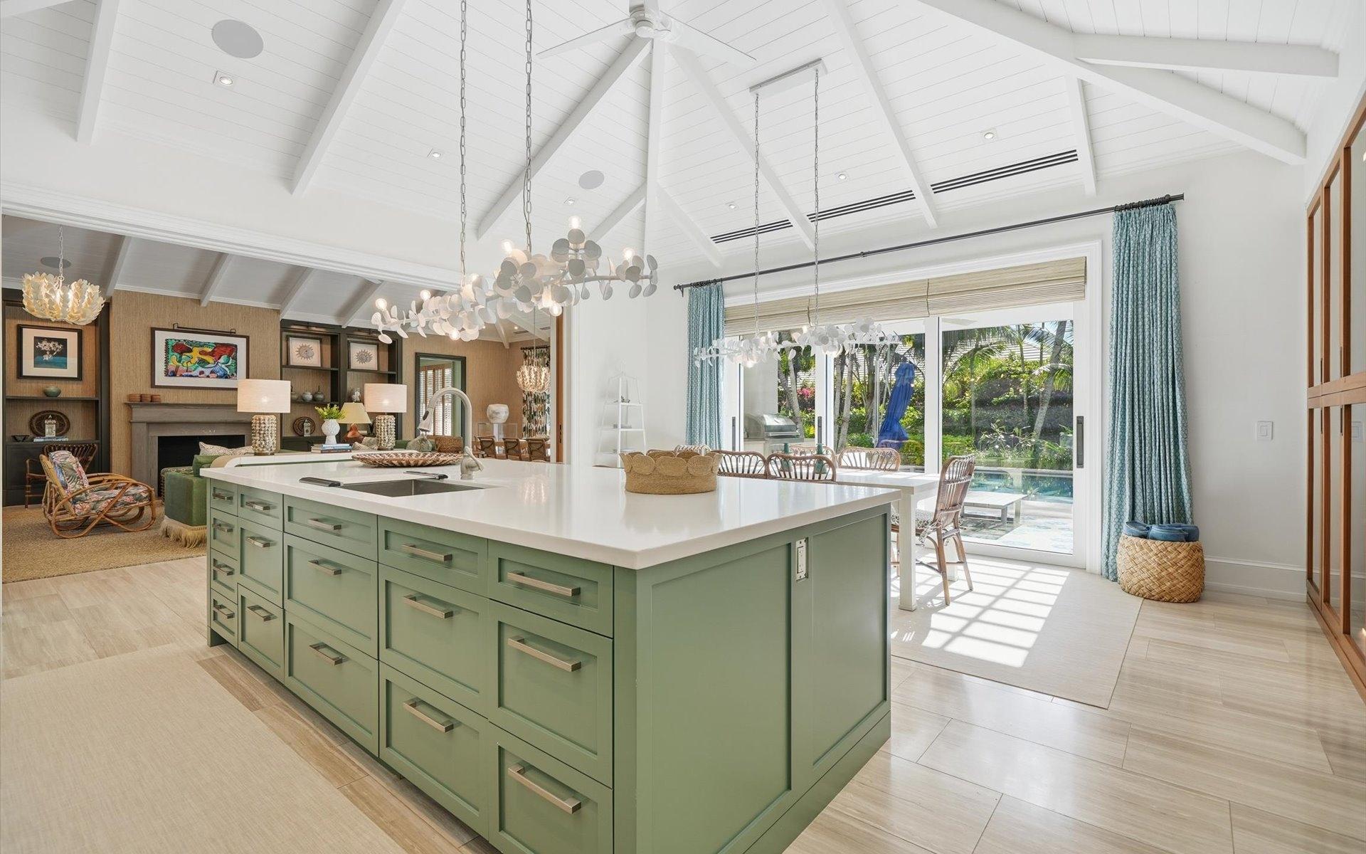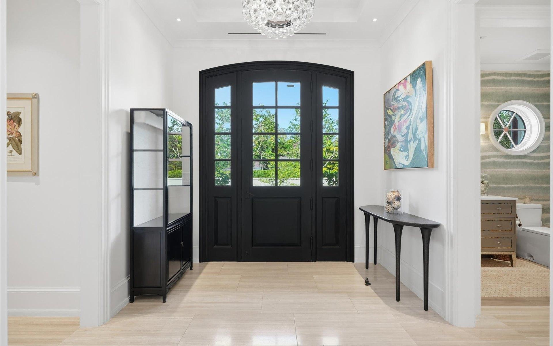 Carlea House is a beautifully renovated four-bedroom residence situated on Chelsea Place in the prestigious Lyford Cay community. The 5,214 sq ft home sits on 0.55 acres. Built by E.P Taylor and designed by John Volk, it was home to the original manager of the Lyford Cay Club. Although the home underwent a complete modern, custom renovation in 2019, the original front wall façade and the classic Lyford Cay rooflines preserve the charm. Then in 2024, it was reimagined in the eyes of international architectural and interior design firm Noorani Greiner who brought a warmth and comfort to a this contemporary island home. At the front of the house, one is greeted by six Hong Kong orchid trees, spaced along the street easement. Many of the palm trees were original to the property and preserved during construction, then replanted to maximize the new layout. The mature and extensive landscaping includes the original rubber trees flanking the east and west boundary and over 100 palm trees providing an oasis of privacy in the rear of the property and a sense of belonging from the street.
