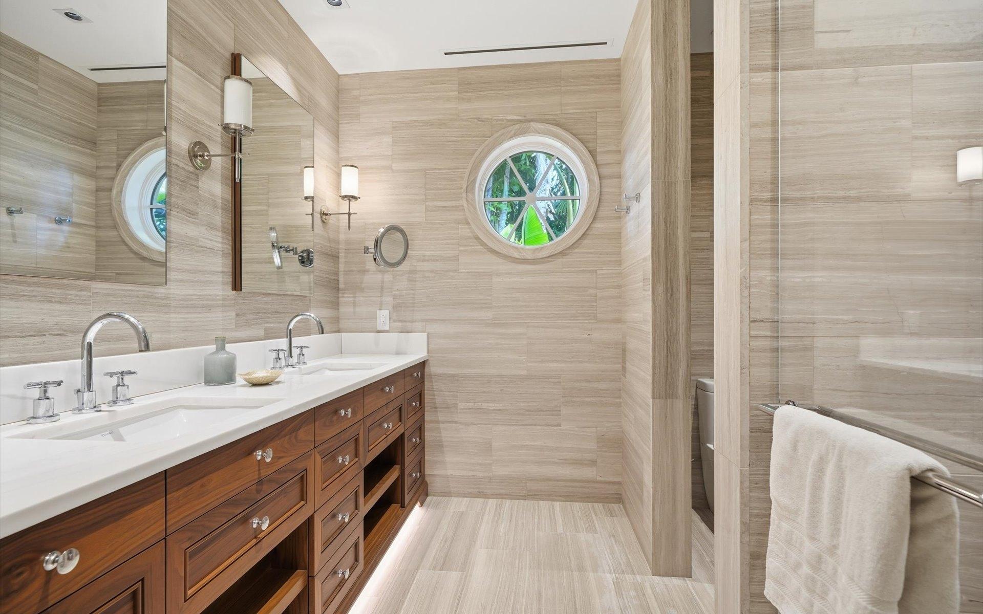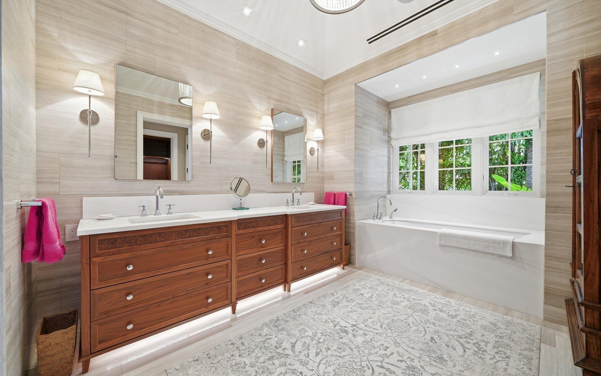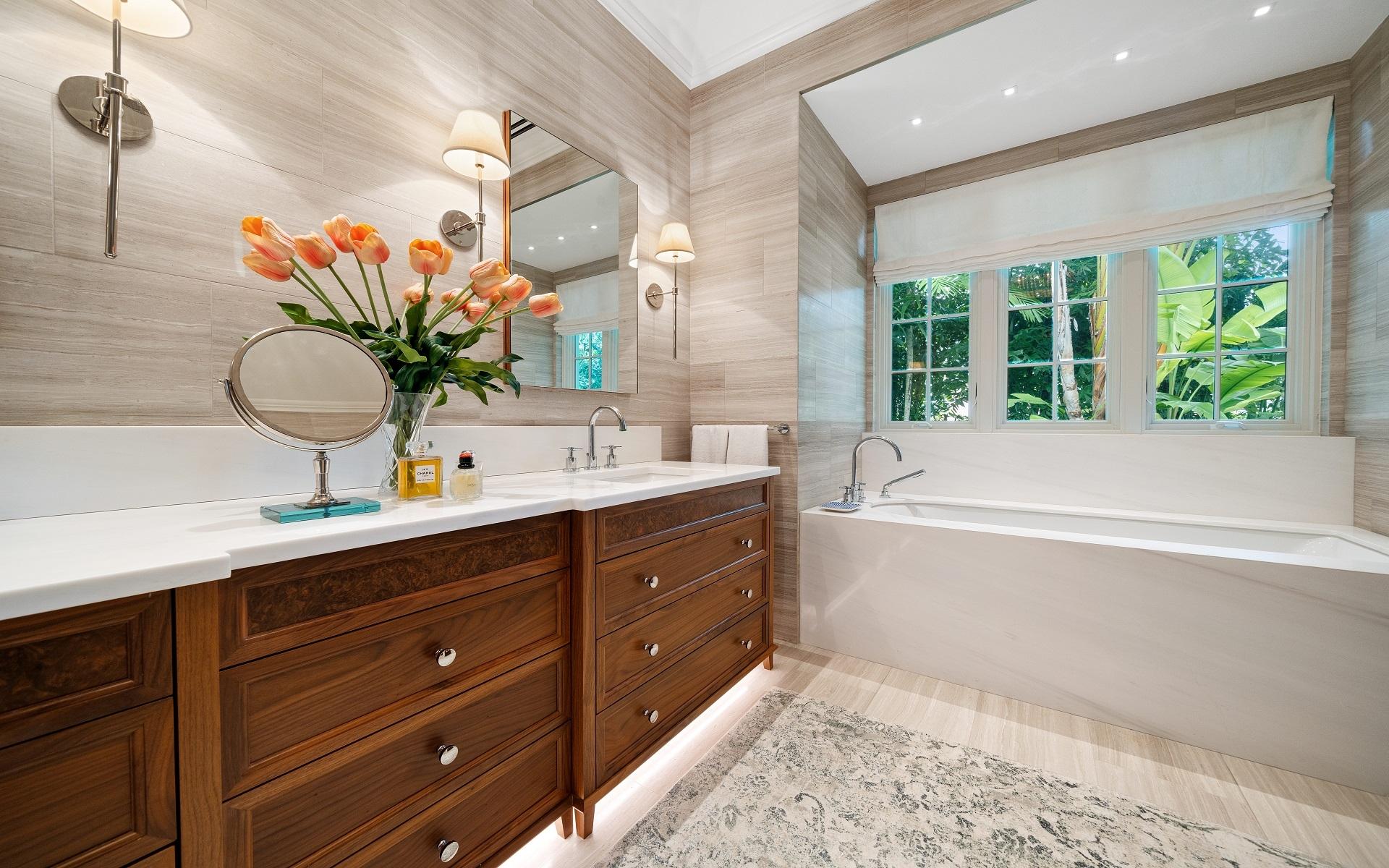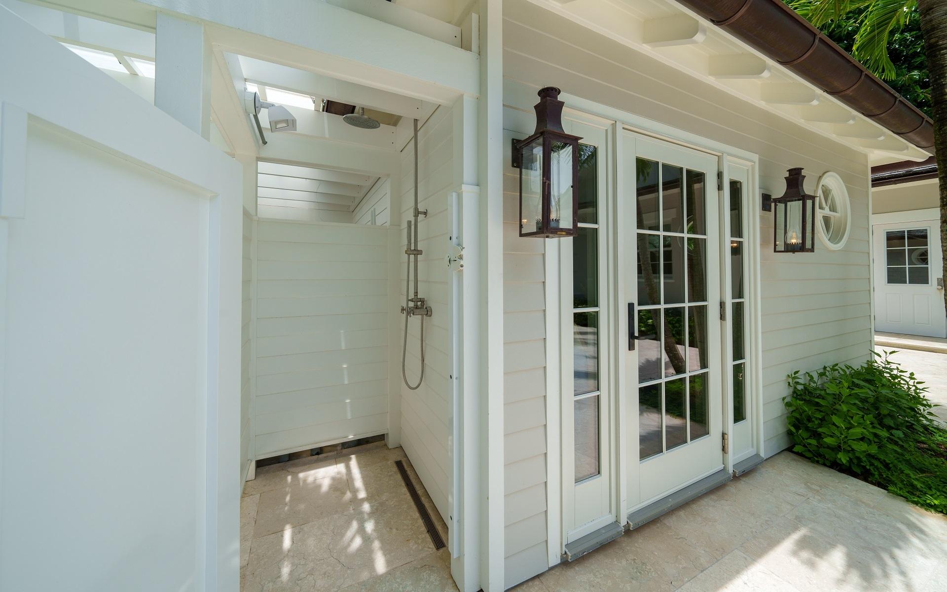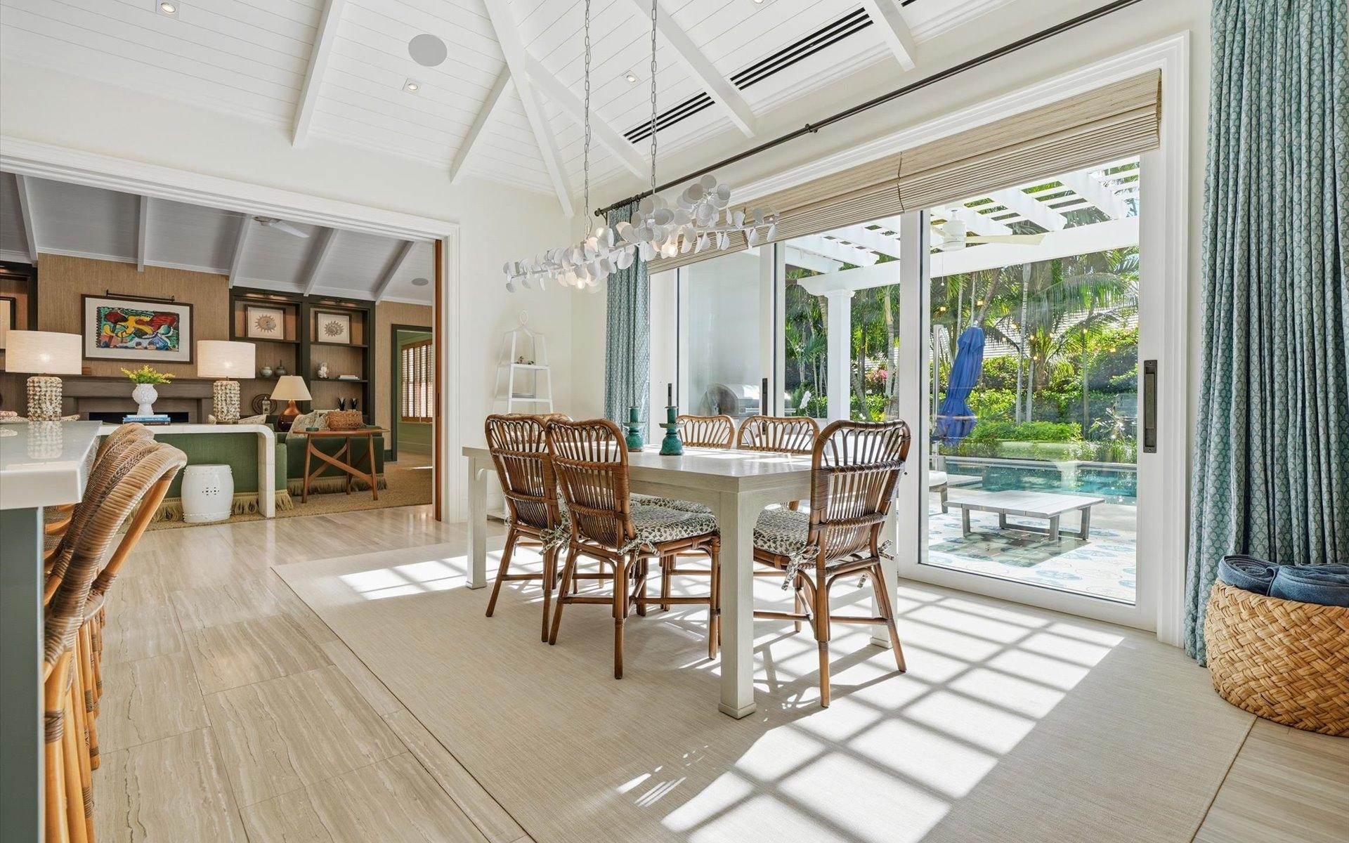 Carlea House is a beautifully renovated four-bedroom residence situated on Chelsea Place in the prestigious Lyford Cay community. The 5,214 sq ft home sits on 0.55 acres. Built by E.P Taylor and designed by John Volk, it was home to the original manager of the Lyford Cay Club. Although the home underwent a complete modern, custom renovation in 2019, the original front wall façade and the classic Lyford Cay rooflines preserve the charm. Then in 2024, it was reimagined in the eyes of international architectural and interior design firm Noorani Greiner who brought a warmth and comfort to a this contemporary island home. At the front of the house, one is greeted by six Hong Kong orchid trees, spaced along the street easement. Many of the palm trees were original to the property and preserved during construction, then replanted to maximize the new layout. The mature and extensive landscaping includes the original rubber trees flanking the east and west boundary and over 100 palm trees providing an oasis of privacy in the rear of the property and a sense of belonging from the street.