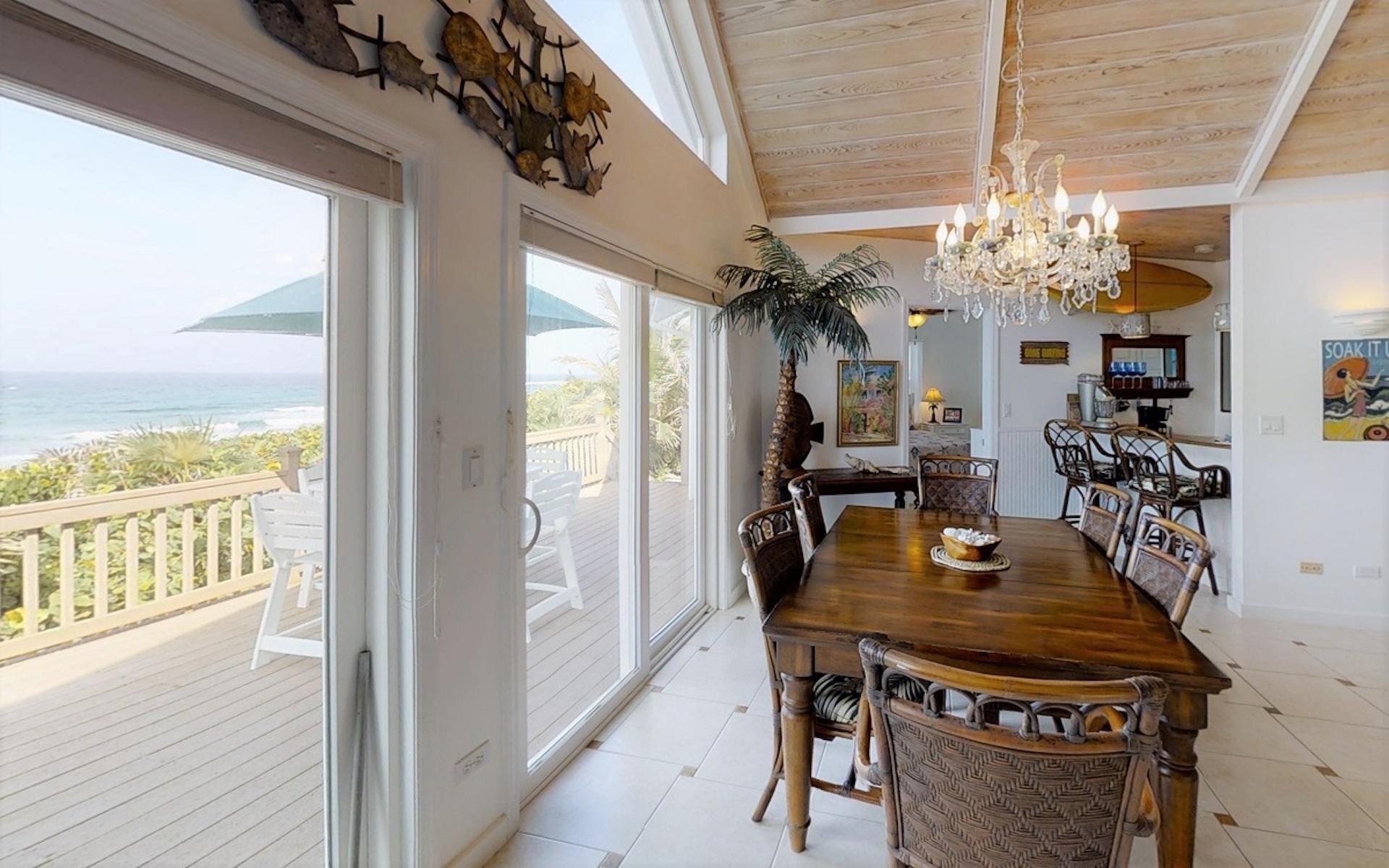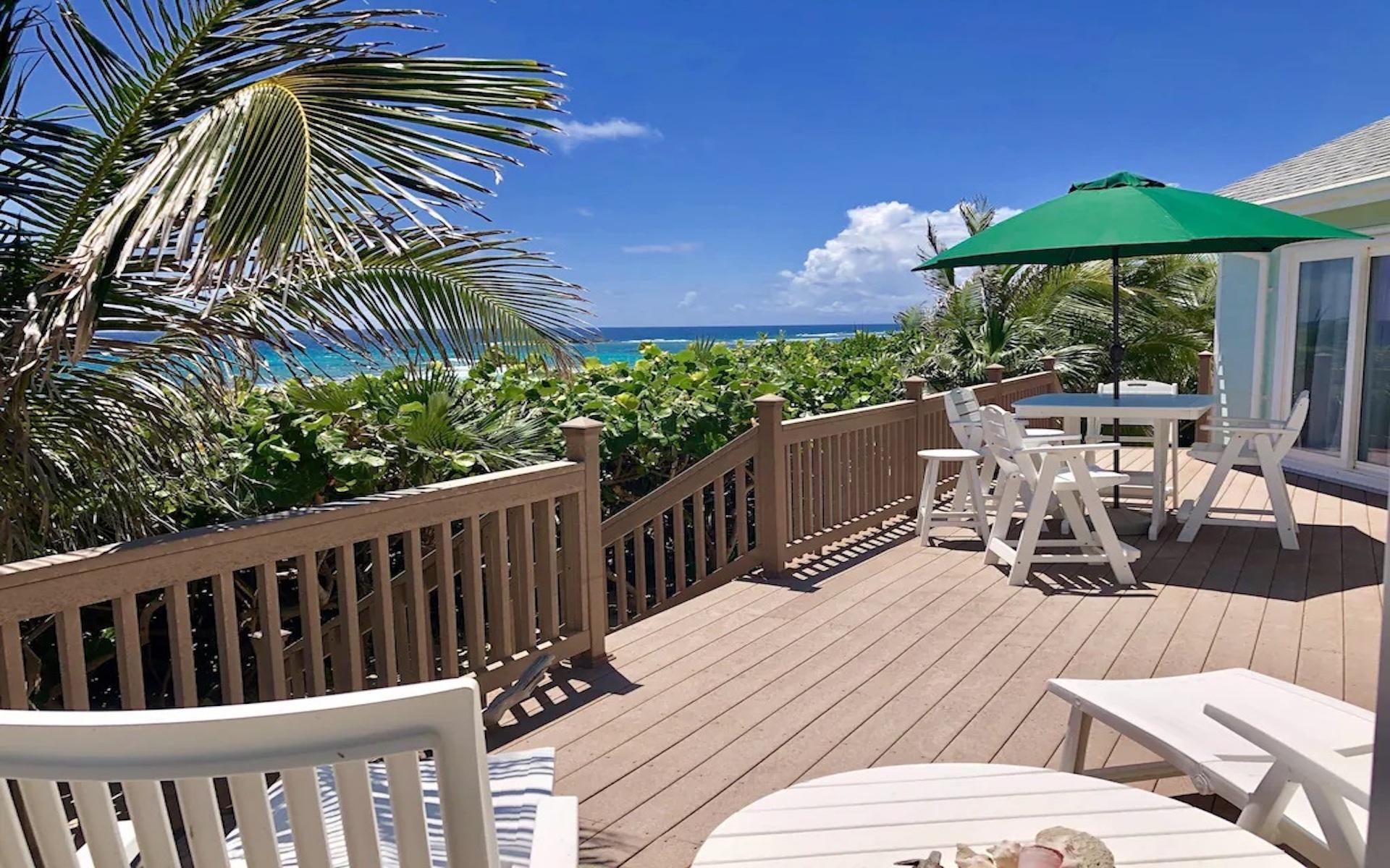Situated in a desirable upscale neighborhood, this beautiful home is ocean front on a white sandy beach. The home has 2 ocean view bedrooms, each with its own bathroom at separate ends of the home. There is a full wet bar, and a built-in laundry area. Dramatic tongue and groove wood high ceilings in the great room, with upper windows letting in lots of light. Dining area has room enough for seating for 8 to 10 people with views of the ocean. Each room has its own mini split air conditioner. Sliding glass doors lead to the outdoor deck with plenty of room for outdoor eating and entertaining. Starlink has been installed for perfect internet connections. A few steps down the deck to a sandy path takes you to a white sand beach. The path is bordered with many palm trees leading to a sun deck at the water’s edge to one of the most beautiful beaches on Long Island, where you can walk over a mile. Since there is no public access, this a very private beach. There is an oversized garage with an apartment above that offers great views from an elevated deck.