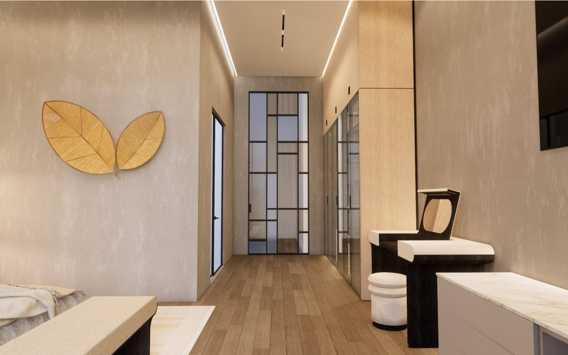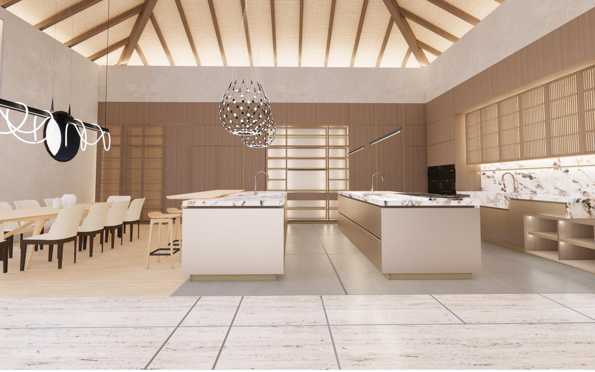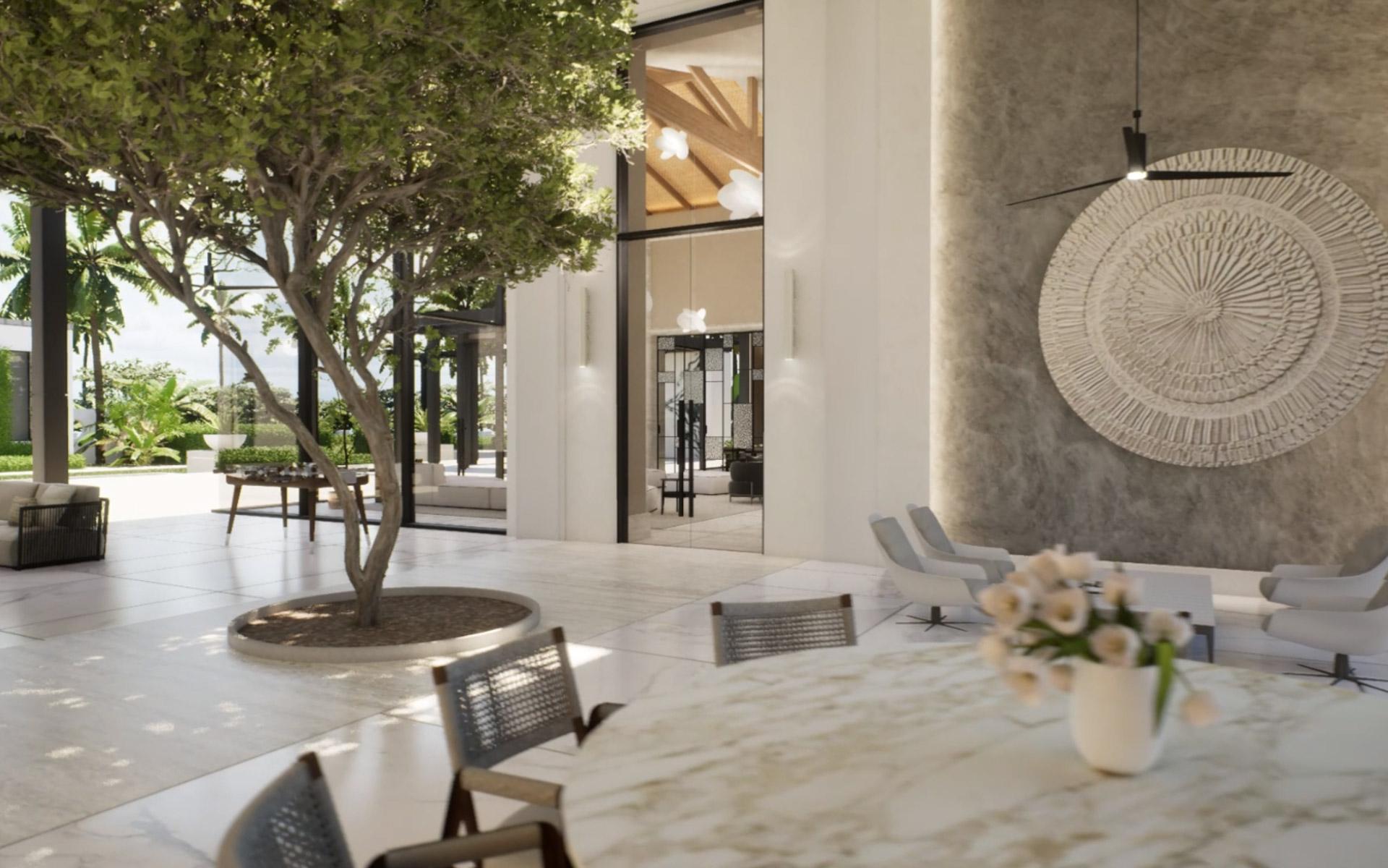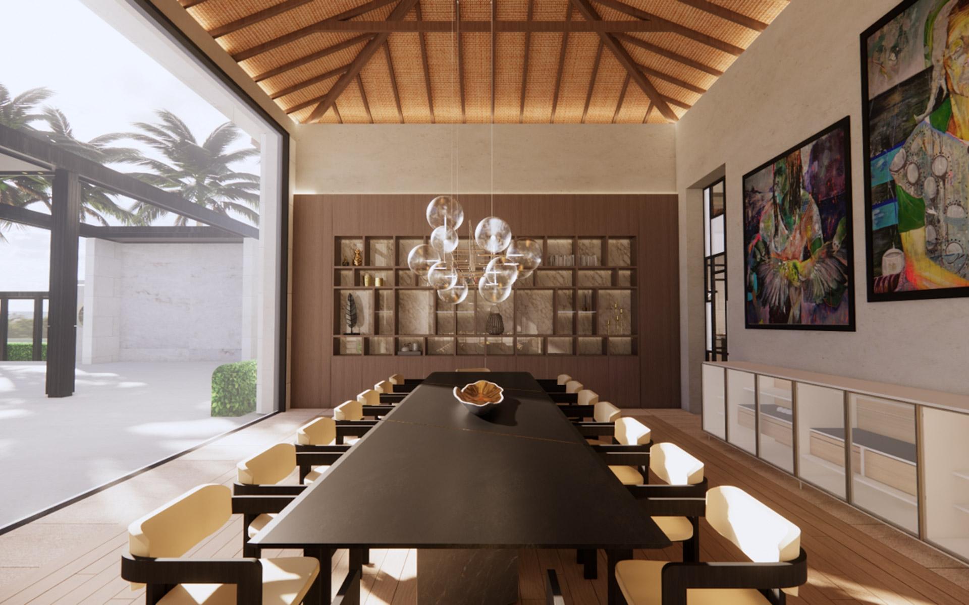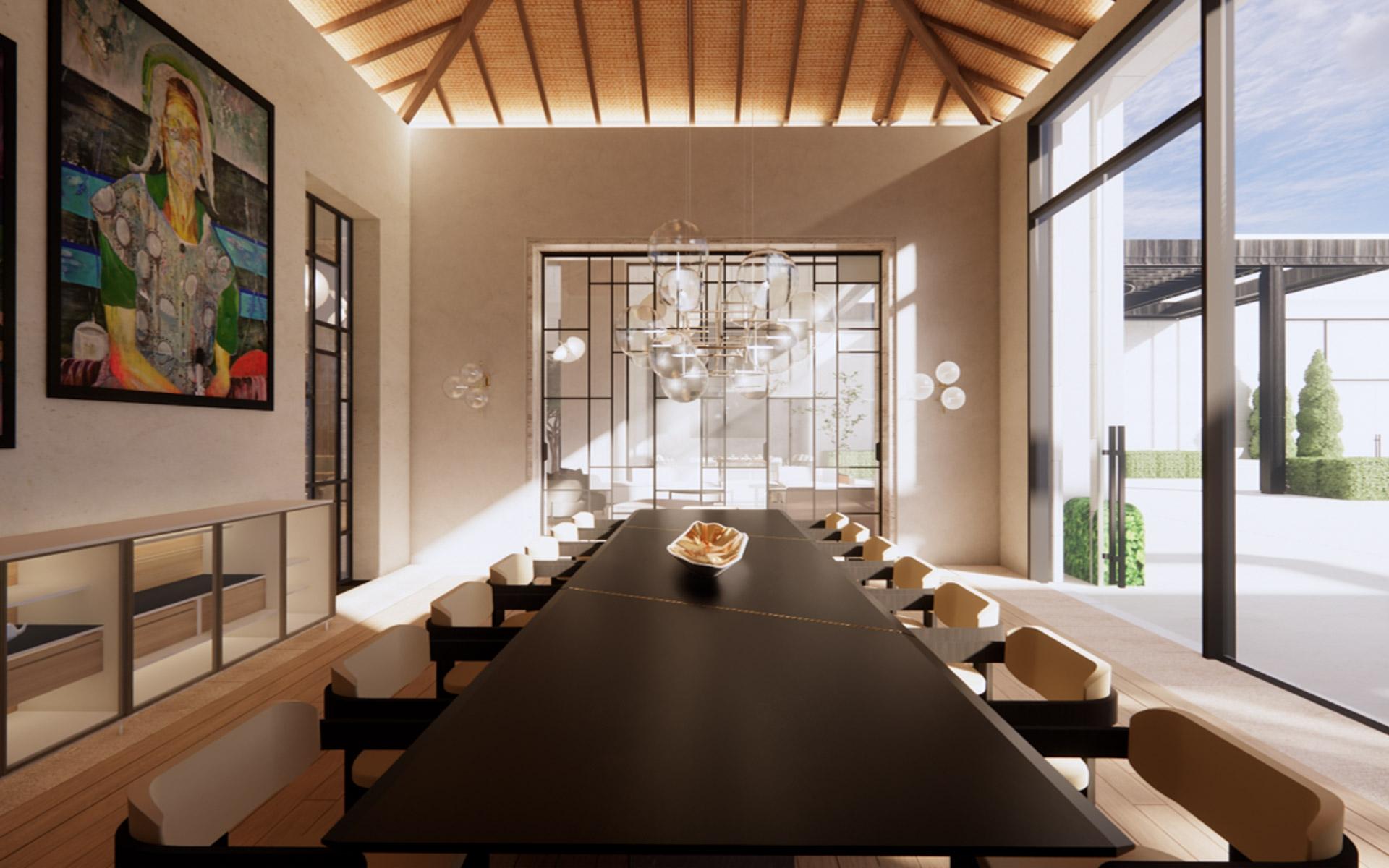 Situated at the entrance of the prestigious Equestrian Estates at Albany, ZOI is a masterful modern interpretation of a courtyard home. Spanning 1.2 acres, this estate offers approximately 12,000 square feet of air-conditioned living space, thoughtfully designed by renowned architect THA and interior designer CVC. The residence features a truly iconic design, blending striking interiors with lush landscaping to create a seamless indoor-outdoor experience. Stepping into the living area, you are welcomed by vaulted 16 ft high ceilings with rattan and wooden beams. Two intimate seating areas flank the entrance, while beyond, expansive living spaces feature floor-to-ceiling windows. Off the living room, the formal dining area showcases a grand 16-seat table and a full-wall panoramic window, offering an unforgettable dining experience. The state-of-the-art kitchen complete with two large islands, and an additional 10-seat dining area flows into the family room enhancing the home's functionality and elegance.