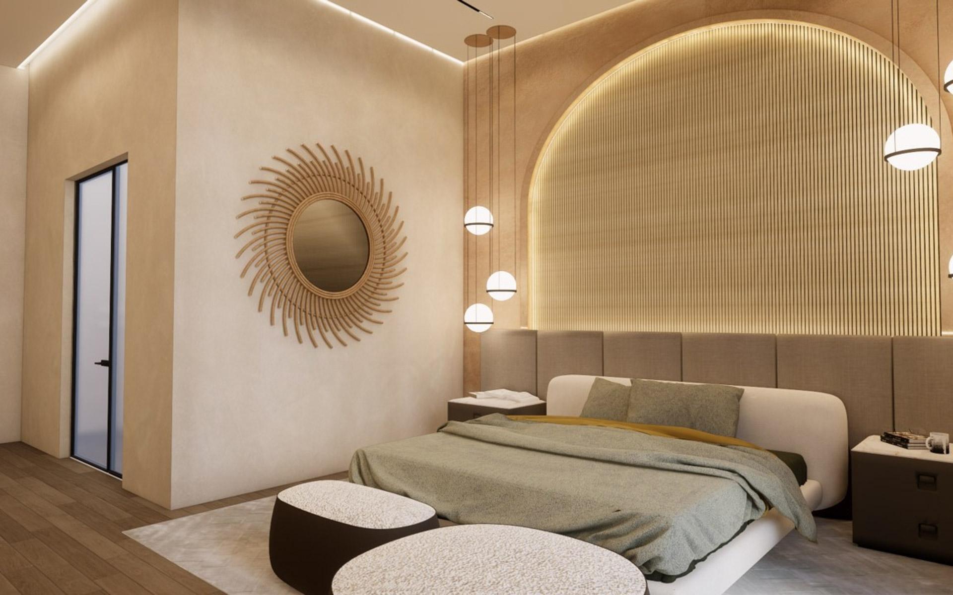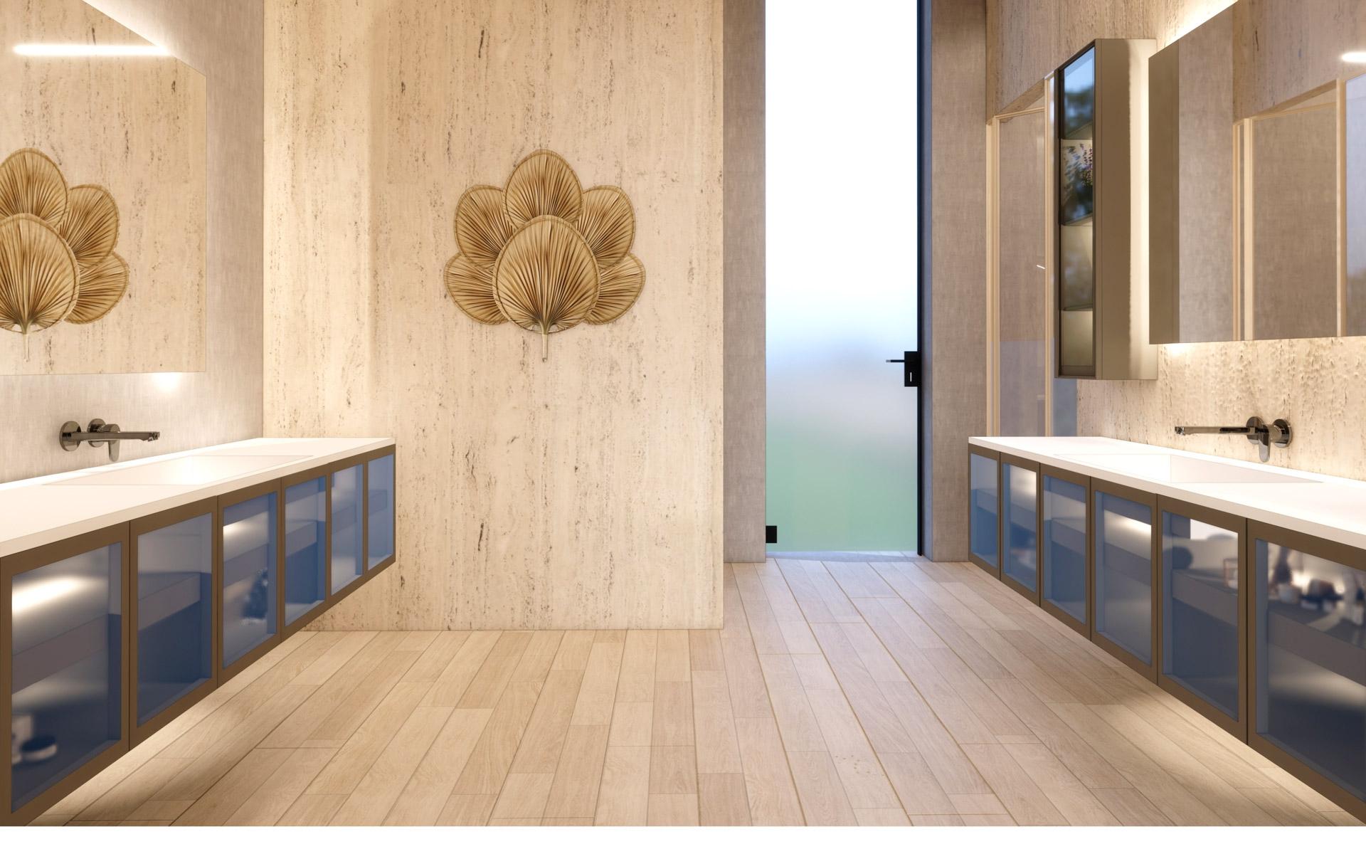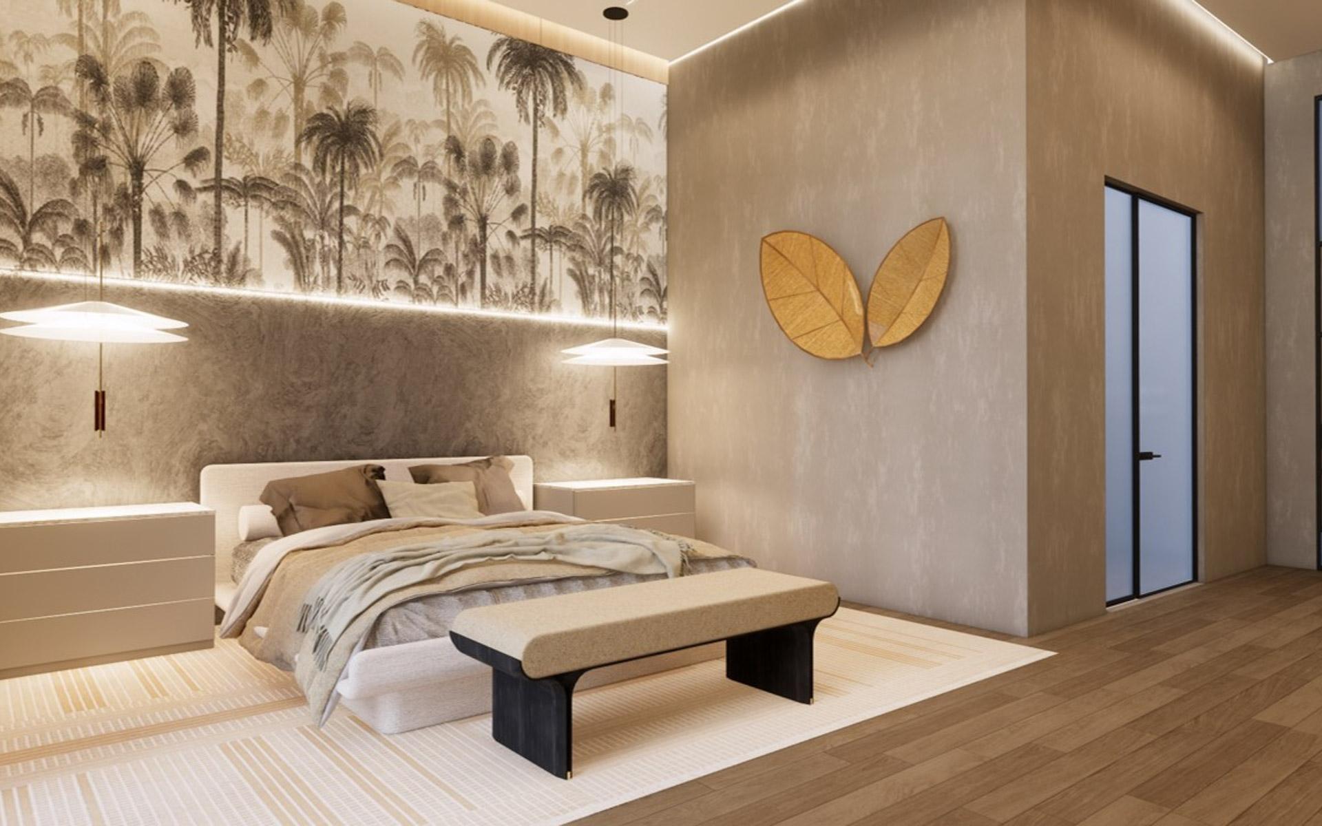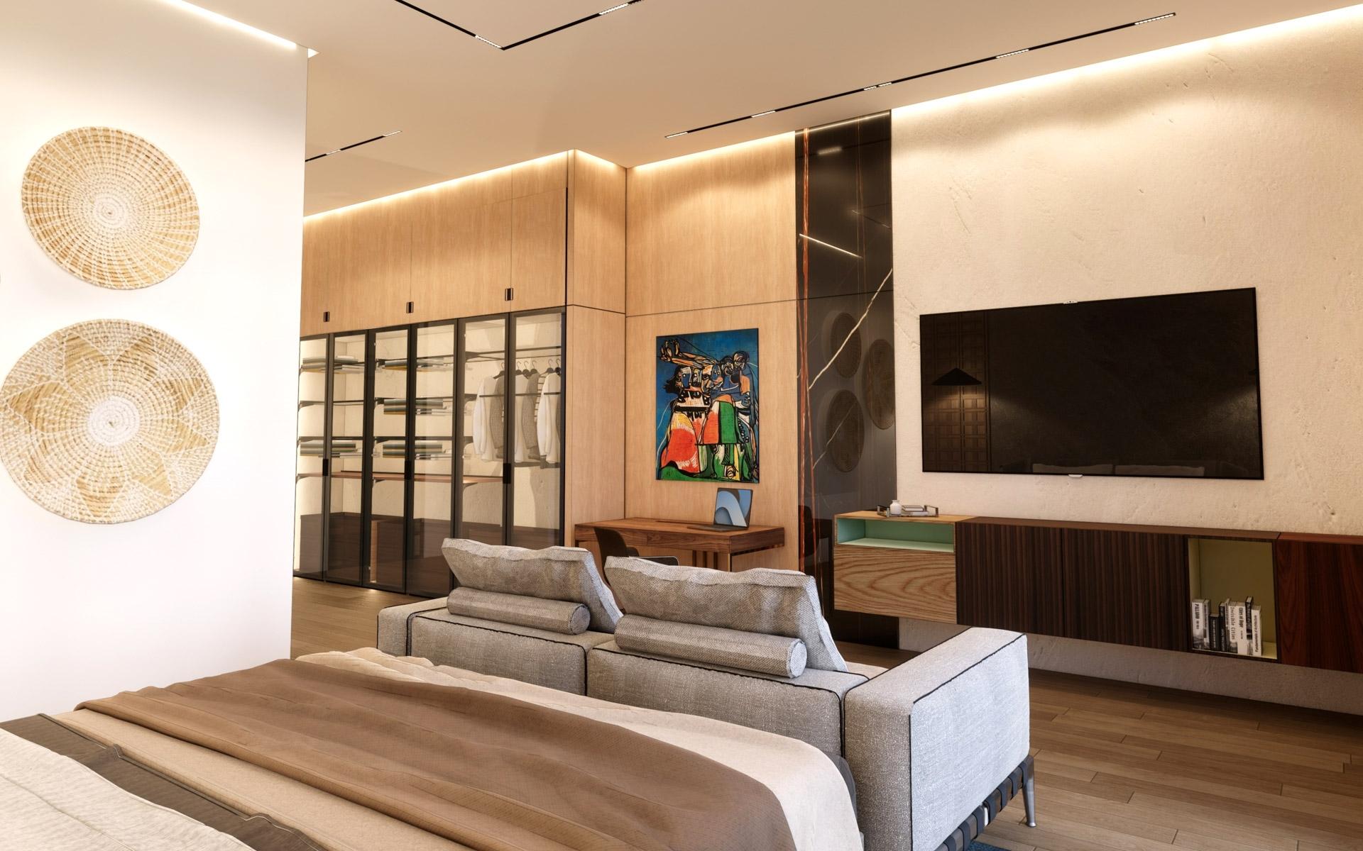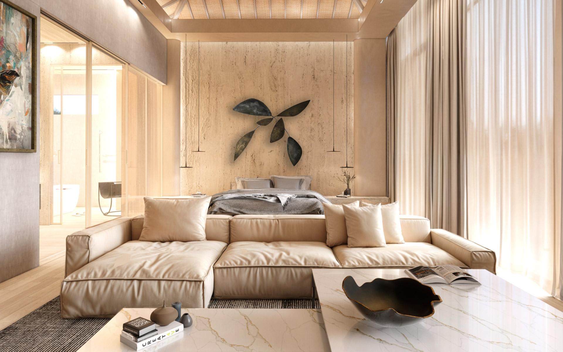 Situated at the entrance of the prestigious Equestrian Estates at Albany, ZOI is a masterful modern interpretation of a courtyard home. Spanning 1.2 acres, this estate offers approximately 12,000 square feet of air-conditioned living space, thoughtfully designed by renowned architect THA and interior designer CVC. The residence features a truly iconic design, blending striking interiors with lush landscaping to create a seamless indoor-outdoor experience. Stepping into the living area, you are welcomed by vaulted 16 ft high ceilings with rattan and wooden beams. Two intimate seating areas flank the entrance, while beyond, expansive living spaces feature floor-to-ceiling windows. Off the living room, the formal dining area showcases a grand 16-seat table and a full-wall panoramic window, offering an unforgettable dining experience. The state-of-the-art kitchen complete with two large islands, and an additional 10-seat dining area flows into the family room enhancing the home's functionality and elegance.